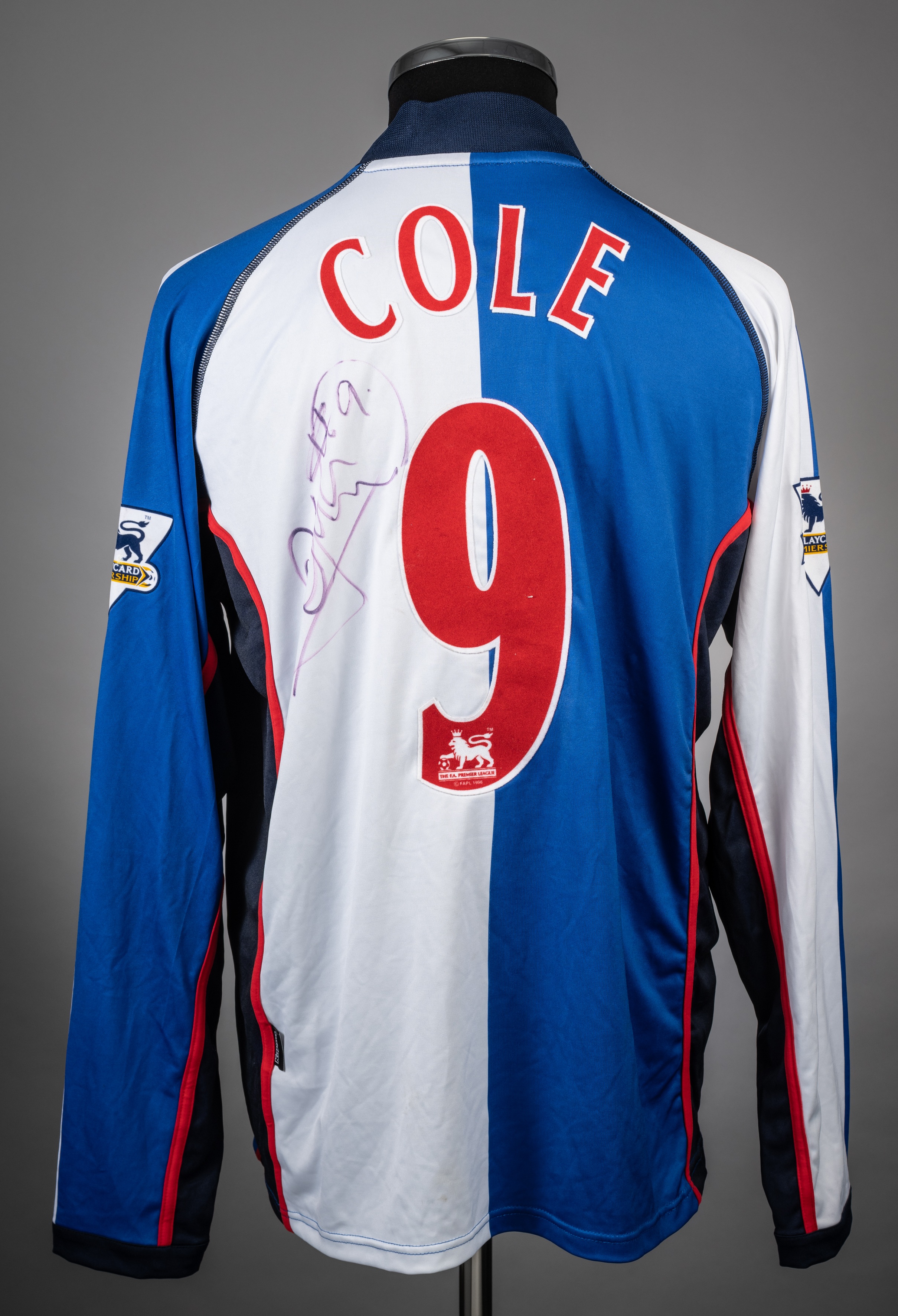 Andy Cole blue and white No.9 Blackburn Rovers long-sleeved jersey, 2003-04, Kappa, with crew-neck collar and embroidered cloth badge inscribed BLACKBURN ROVERS F.C. 1875 ARTE ET LABORE, the reverse lettered COLE, the reverse also autographed by Andy Cole, the sleeves with Barclaycard Premiership flashes