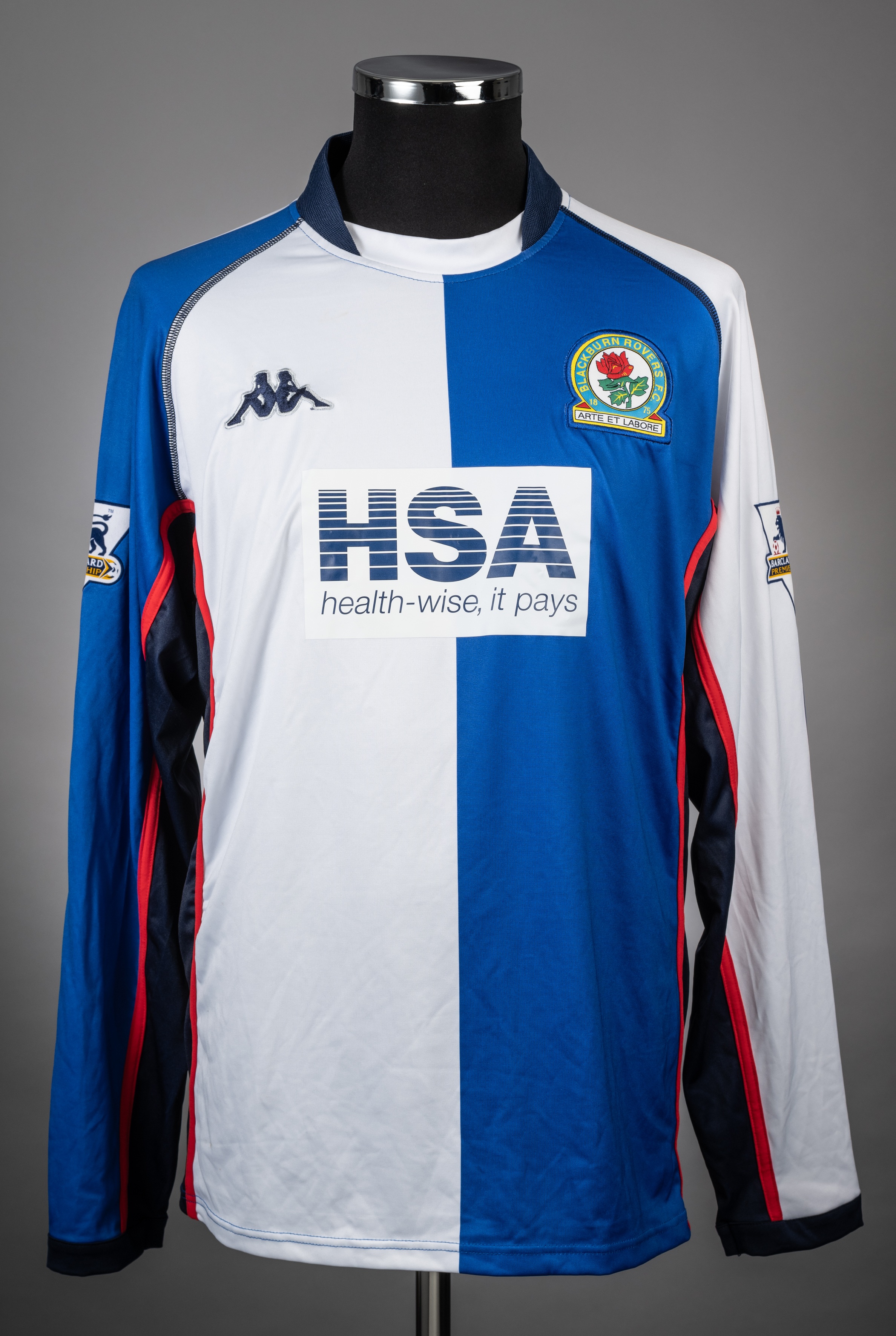 Andy Cole blue and white No.9 Blackburn Rovers long-sleeved jersey, 2003-04, Kappa, with crew-neck collar and embroidered cloth badge inscribed BLAC