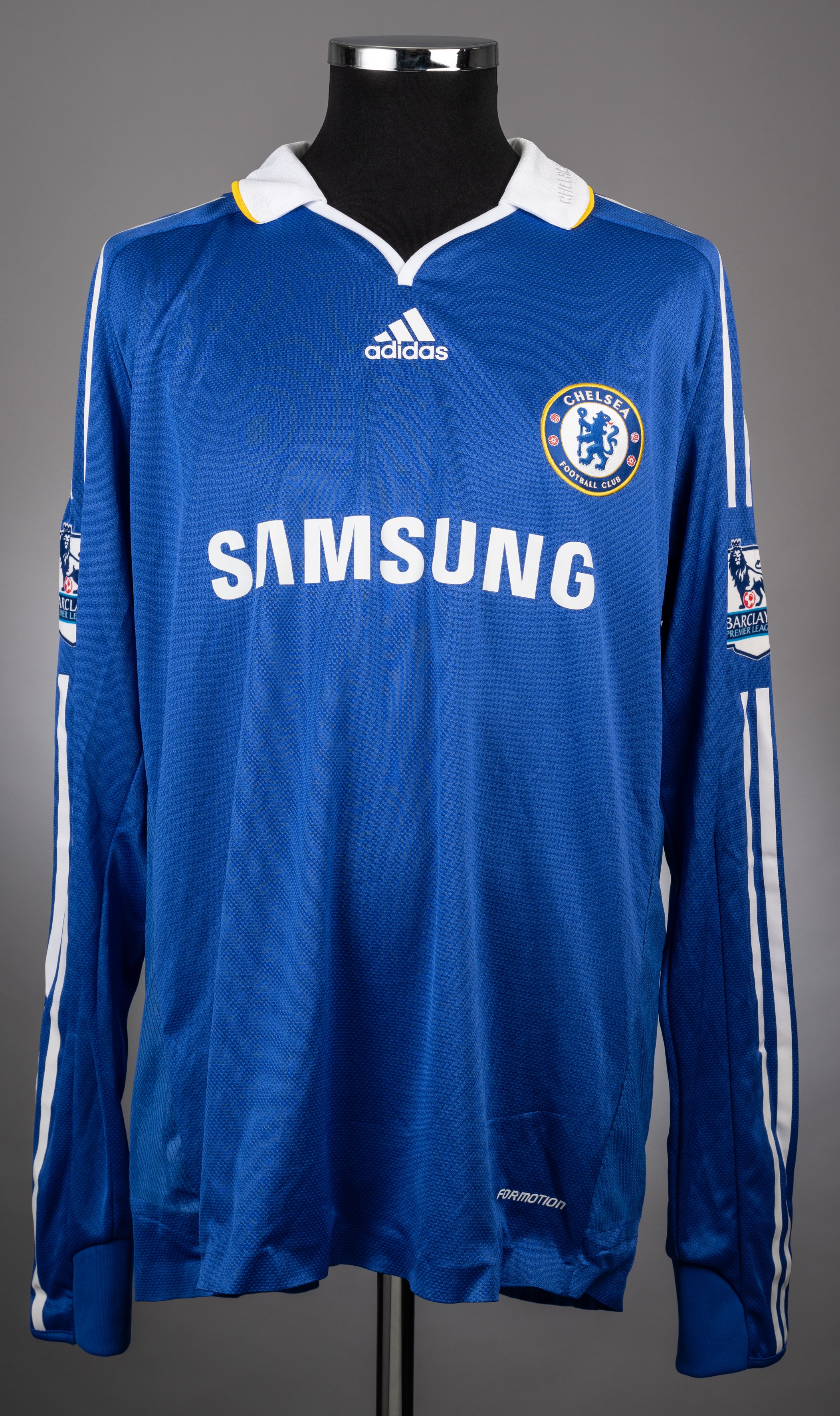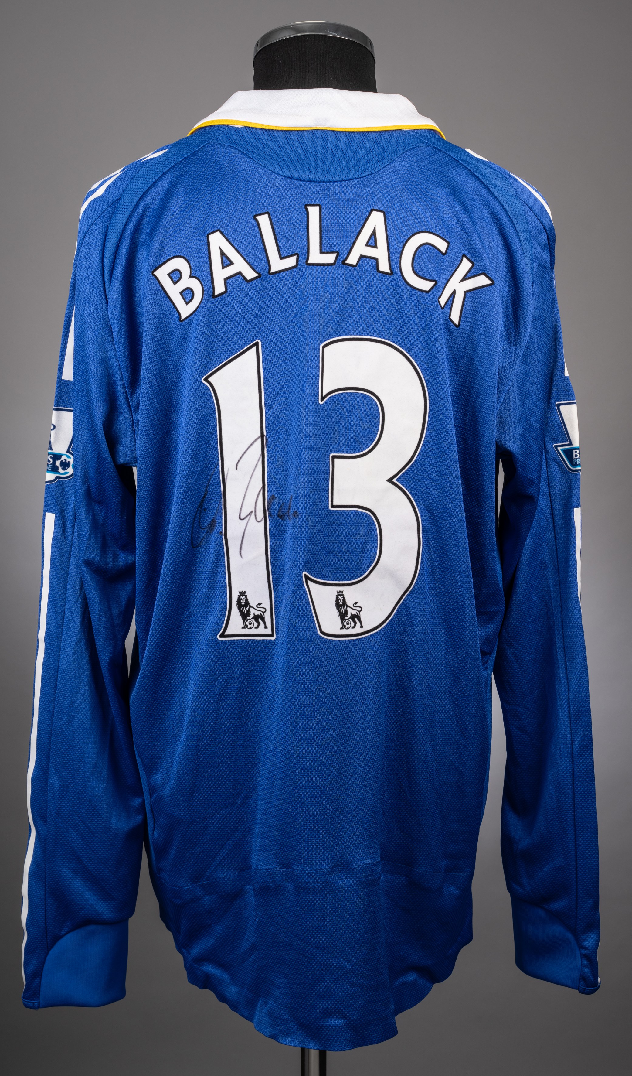 Michael Ballack blue and white No.13 Chelsea long-sleeved jersey, 2008-09, . Adidas, XL, with v-neck collar and embroidered cloth badge inscribed CHELSEA FOOTBALL CLUB, the reverse lettered BALLACK, the reverse also autographed by Ballack, the sleeves with Barclays Premier League flashes