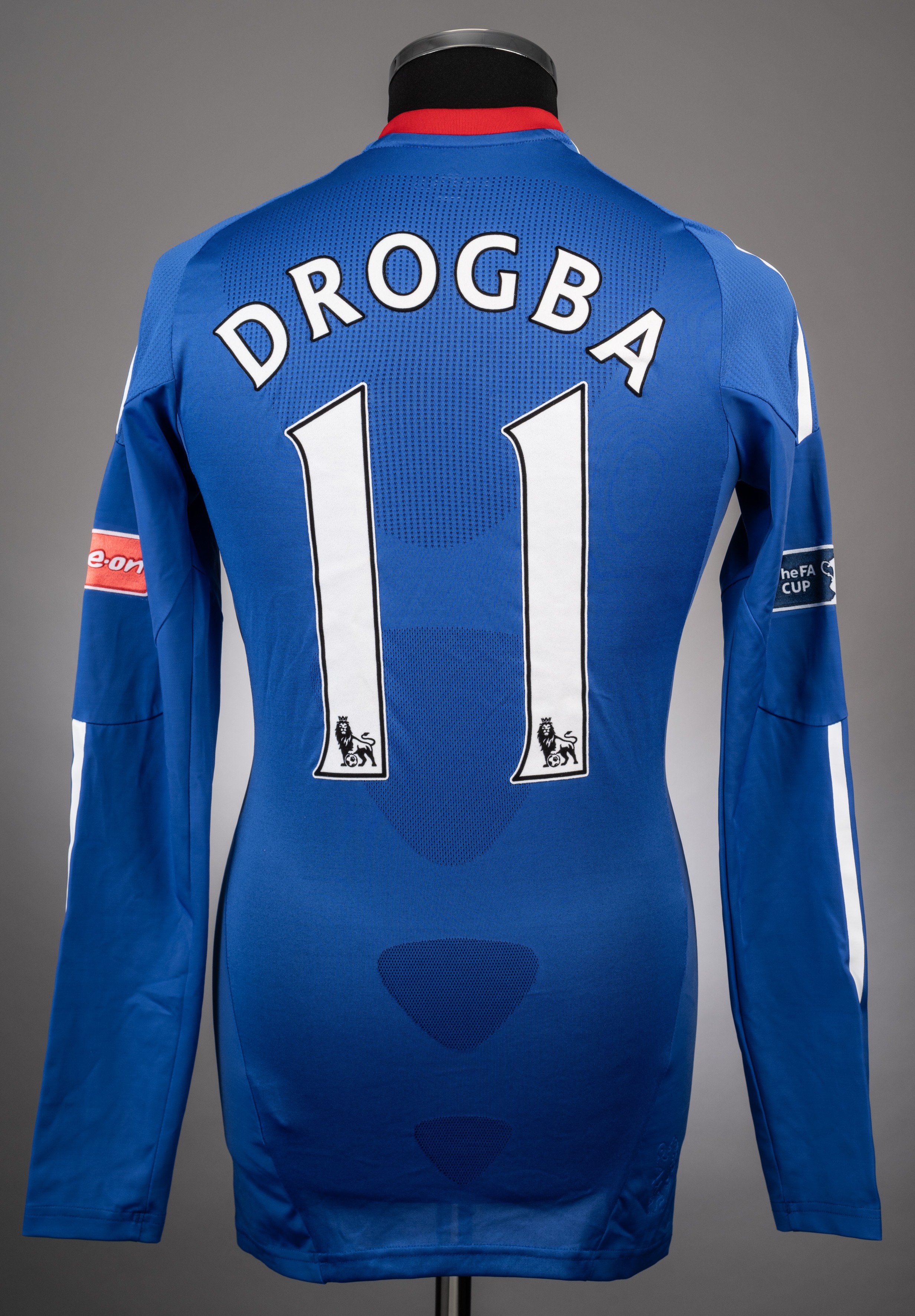 Didier Drogba blue, white and red No.11 Chelsea v. Portsmouth 2010 F.A. Cup final match issue long-sleeved jersey, Adidas, M with v-neck collar and embroidered cloth badge inscribed CHELSEA FOOTBALL CLUB THE FA CUP FINAL 2010 WEMBLEY - 15TH MAY, the reverse lettered DROGBA, the sleeves with The FA Cup e.on flashes In the 2010 F.A. Cup final played on 15th May 2010 at Wembley Chelsea defeated Portsmouth 1-0 thus completing the "Double". Drogba wore short-sleeves in the 2010 final