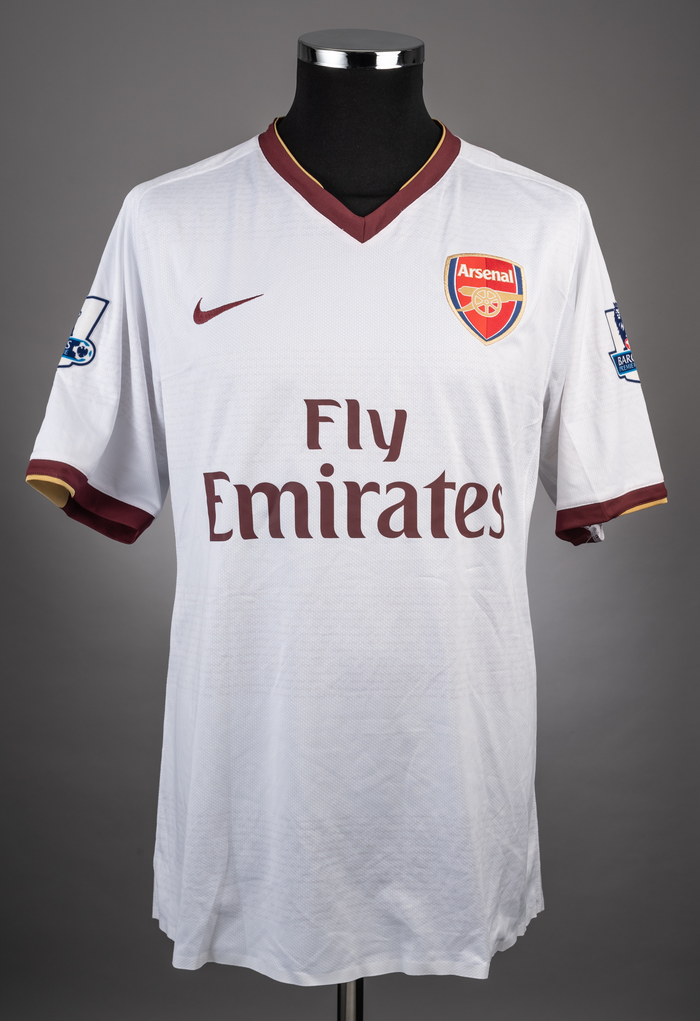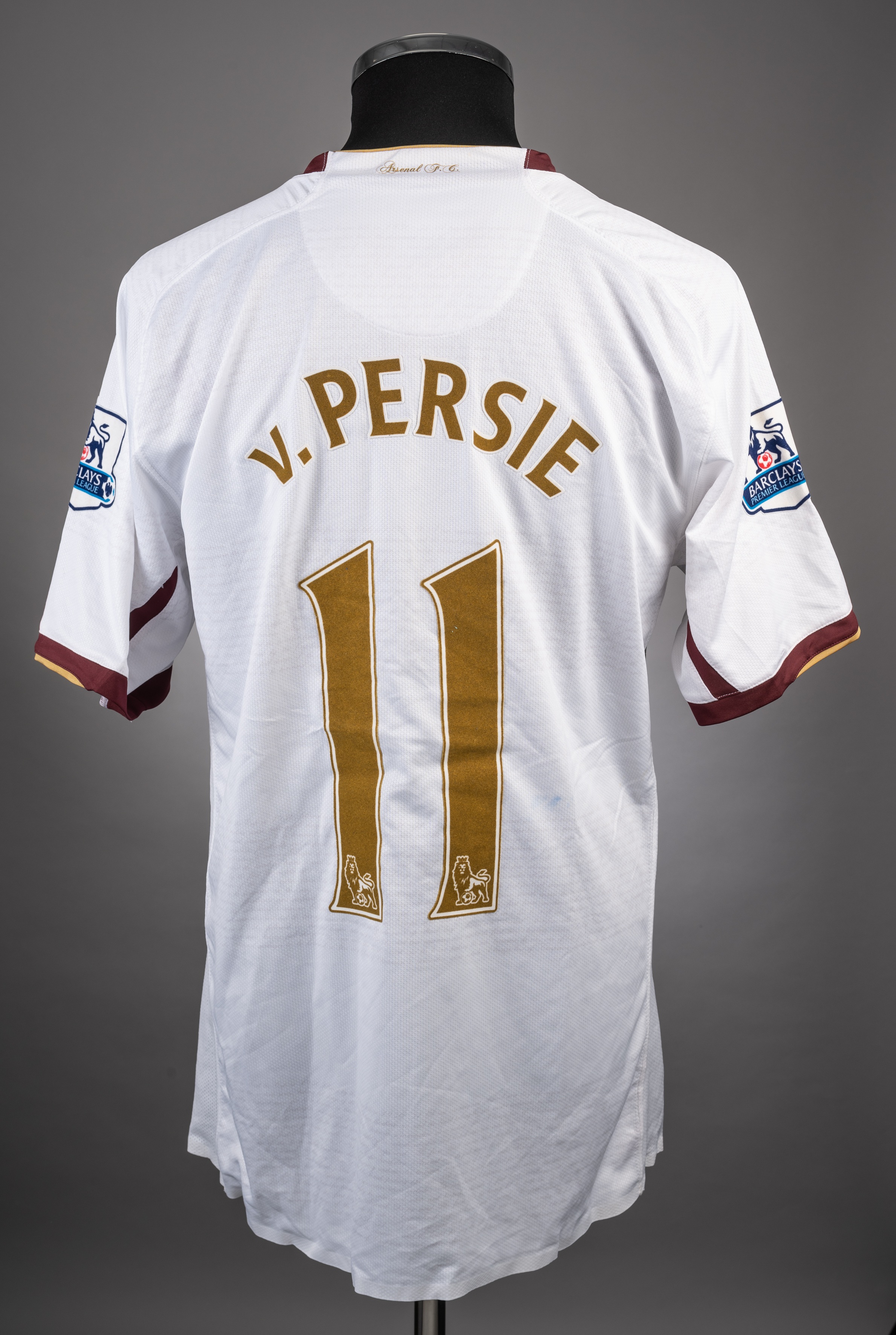 Robin van Persie white No.11 Arsenal short-sleeved jersey, 2007-08, Nike, XL, with v-neck collar and embroidered cloth badge inscribed Arsenal, the reverse lettered v. PERSIE, the sleeves with Barclays Premier League flashes
