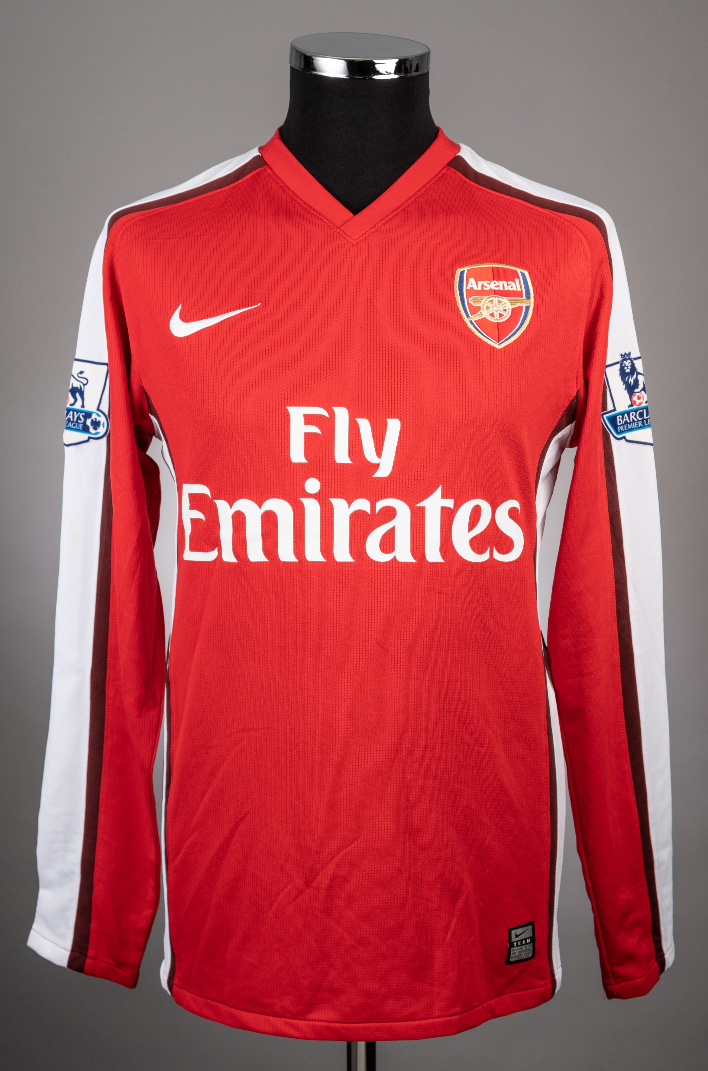 Andrey Arshavin red and white No.23 Arsenal long-sleeved jersey, 2008-1, Nike, M, with v-neck collar and embroidered cloth badge inscribed ARSENAL, t