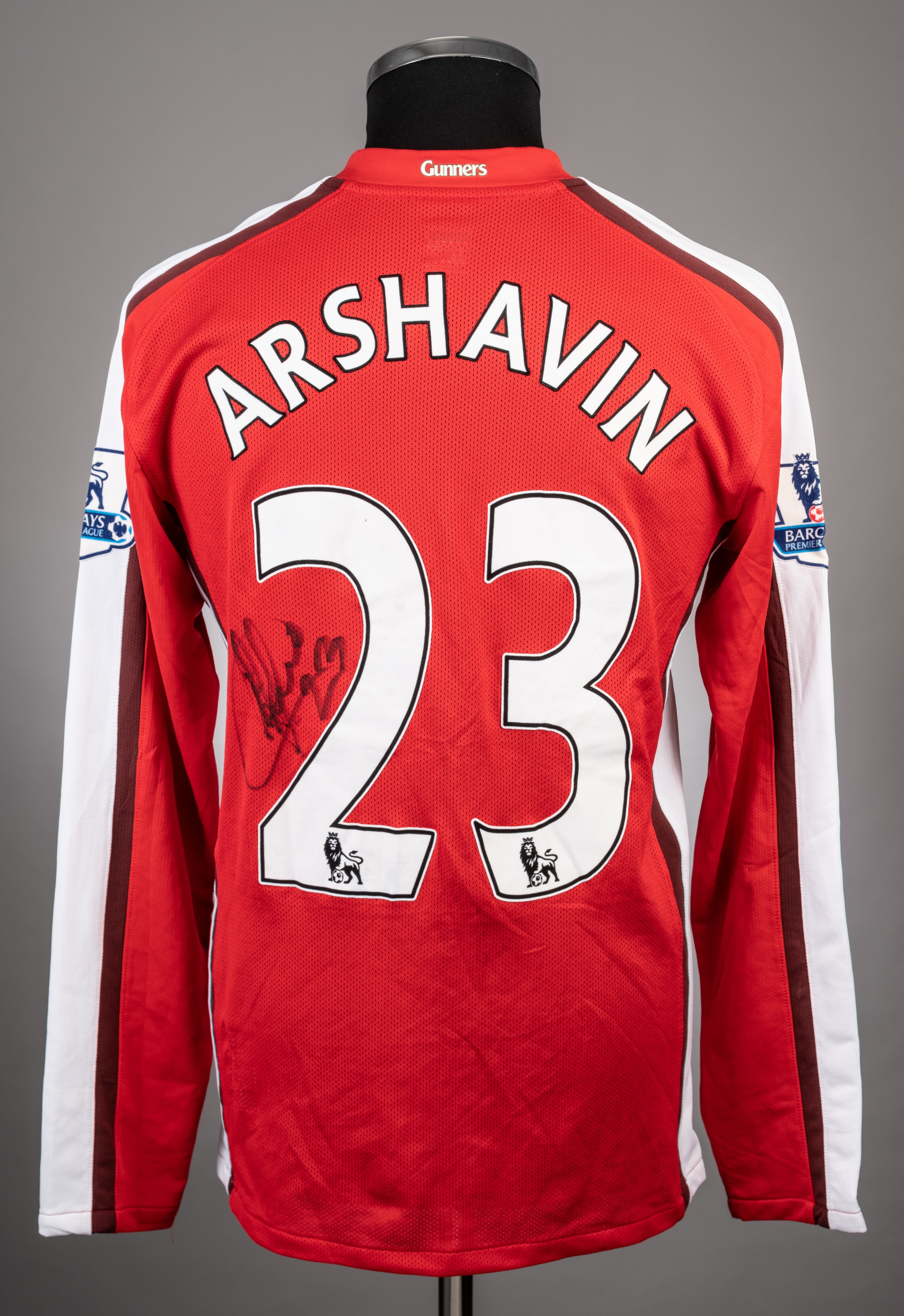 Andrey Arshavin red and white No.23 Arsenal long-sleeved jersey, 2008-1, Nike, M, with v-neck collar and embroidered cloth badge inscribed ARSENAL, the reverse lettered ARSHAVIN, the reverse also autographed by Arshavin, the sleeves with Barclays Premier League flashes