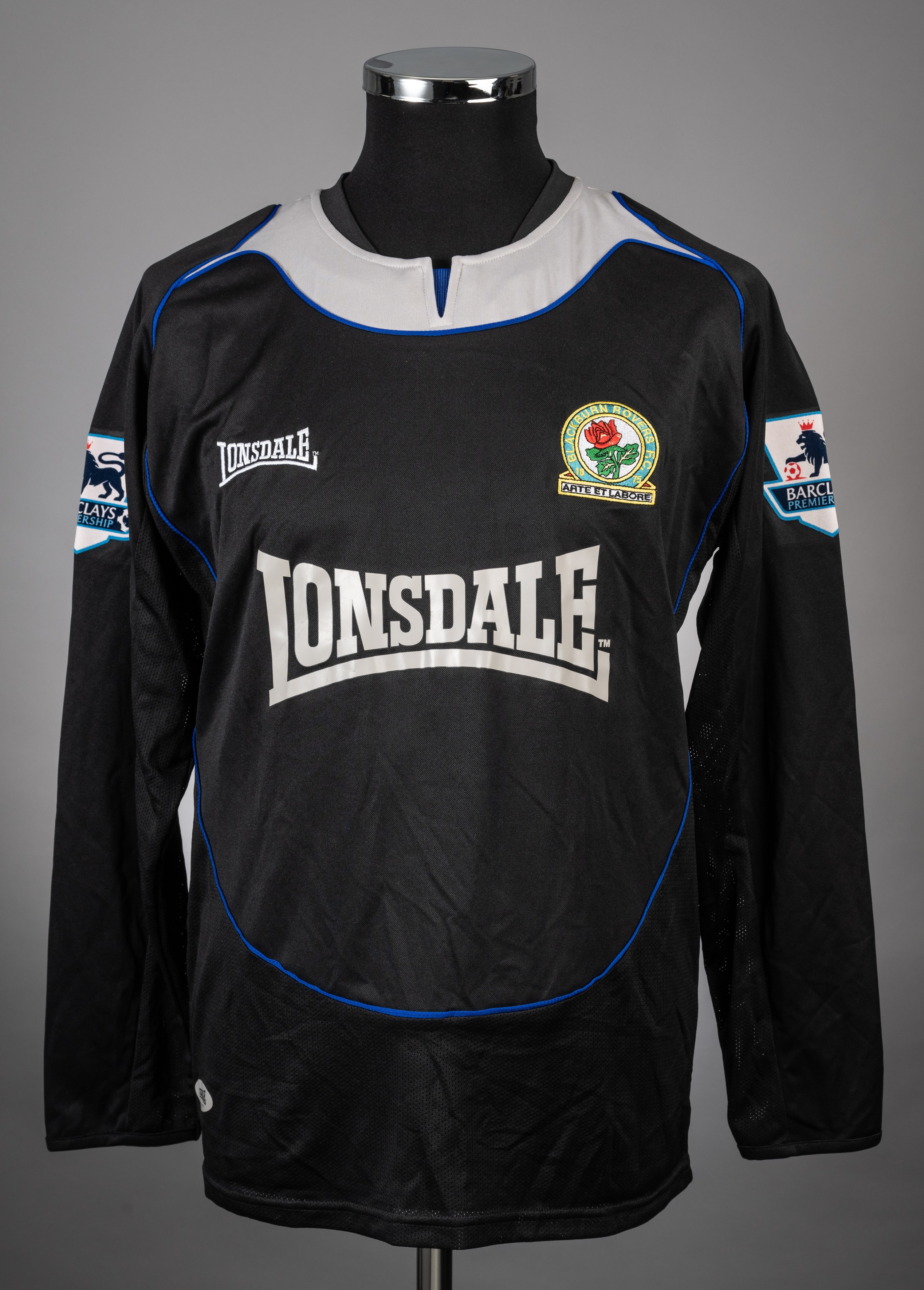 Craig Bellamy black and grey No.11 Blackburn Rovers long-sleeved jersey, 2005-06, Lonsdale, M, with crew-neck collar and embroidered badge inscribed