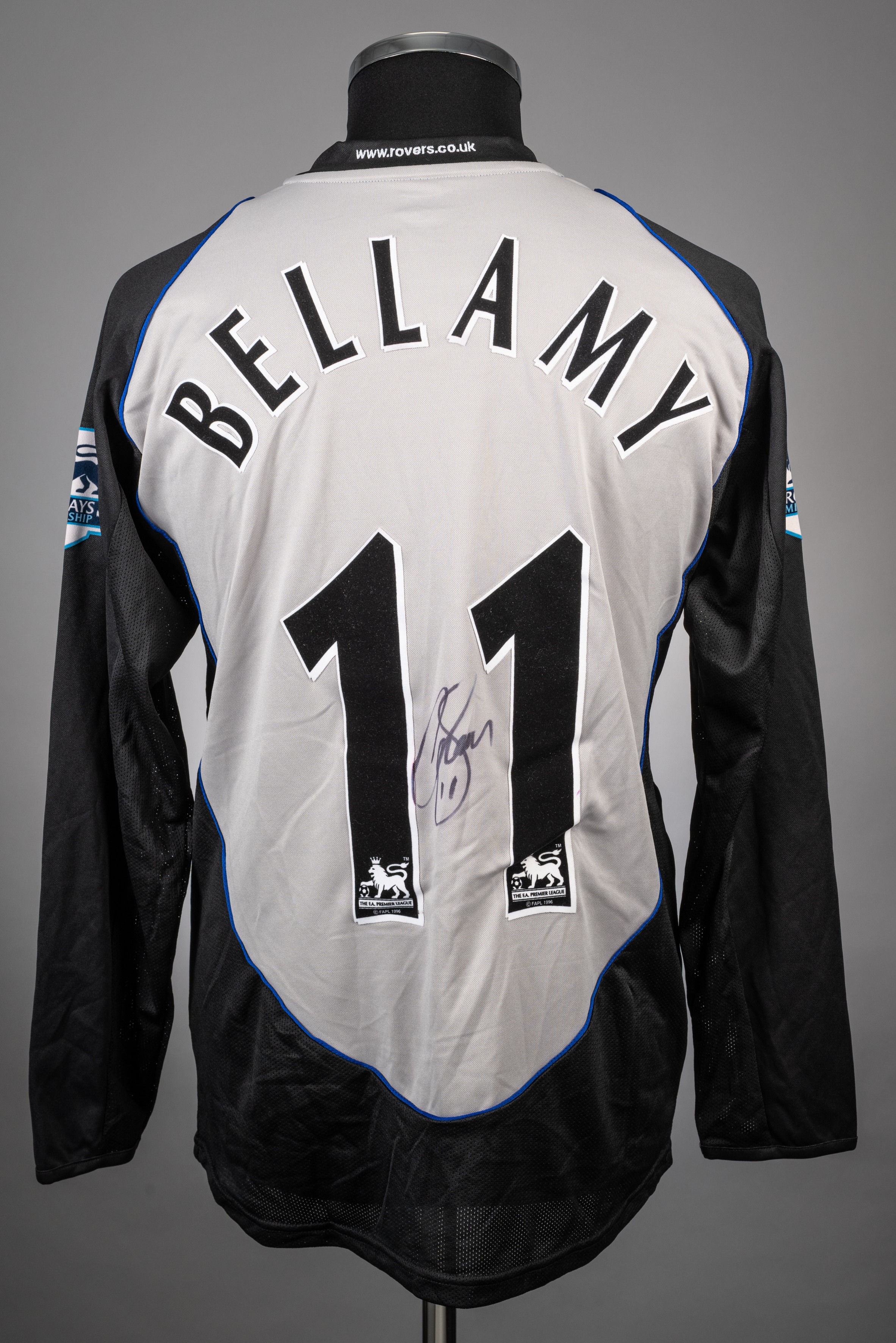 Craig Bellamy black and grey No.11 Blackburn Rovers long-sleeved jersey, 2005-06, Lonsdale, M, with crew-neck collar and embroidered badge inscribed BLACKBURN ROVERS F.C. 1875 ARTE ET LABORE, the reverse lettered BELLAMY, the reverse also autographed by Craig Bellamy, the sleeves with Barclaycard Premiership flashes