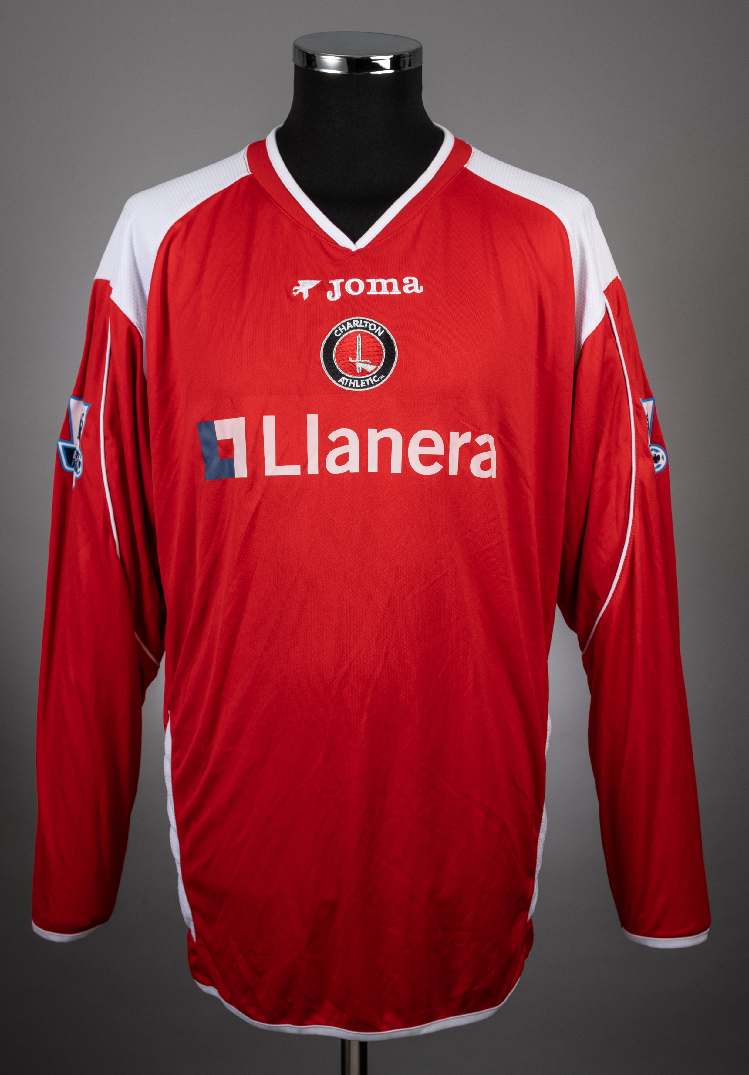 Jimmy Floyd Hasselbaink red and white No.18 Charlton Athletic long-sleeved jersey, 2006-07, Joma, L, with crew-neck collar and embroidered badge ins