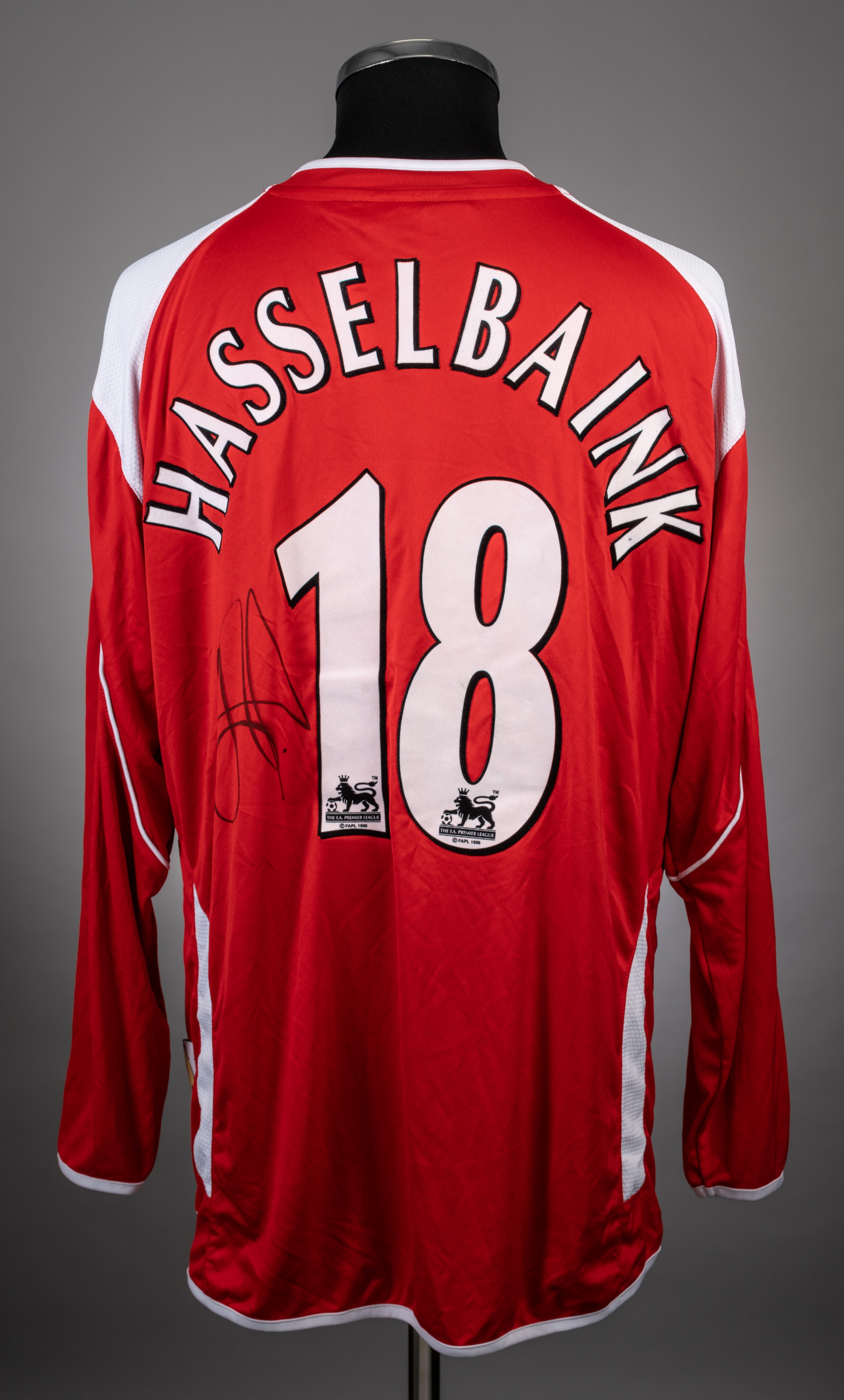 Jimmy Floyd Hasselbaink red and white No.18 Charlton Athletic long-sleeved jersey, 2006-07, Joma, L, with crew-neck collar and embroidered badge inscribed CHARLTON ATHLETIC, the reverse lettered HASSELBAINK, the reverse also autographed by Hasselbaink, the sleeves with Barclays Premiership flashes