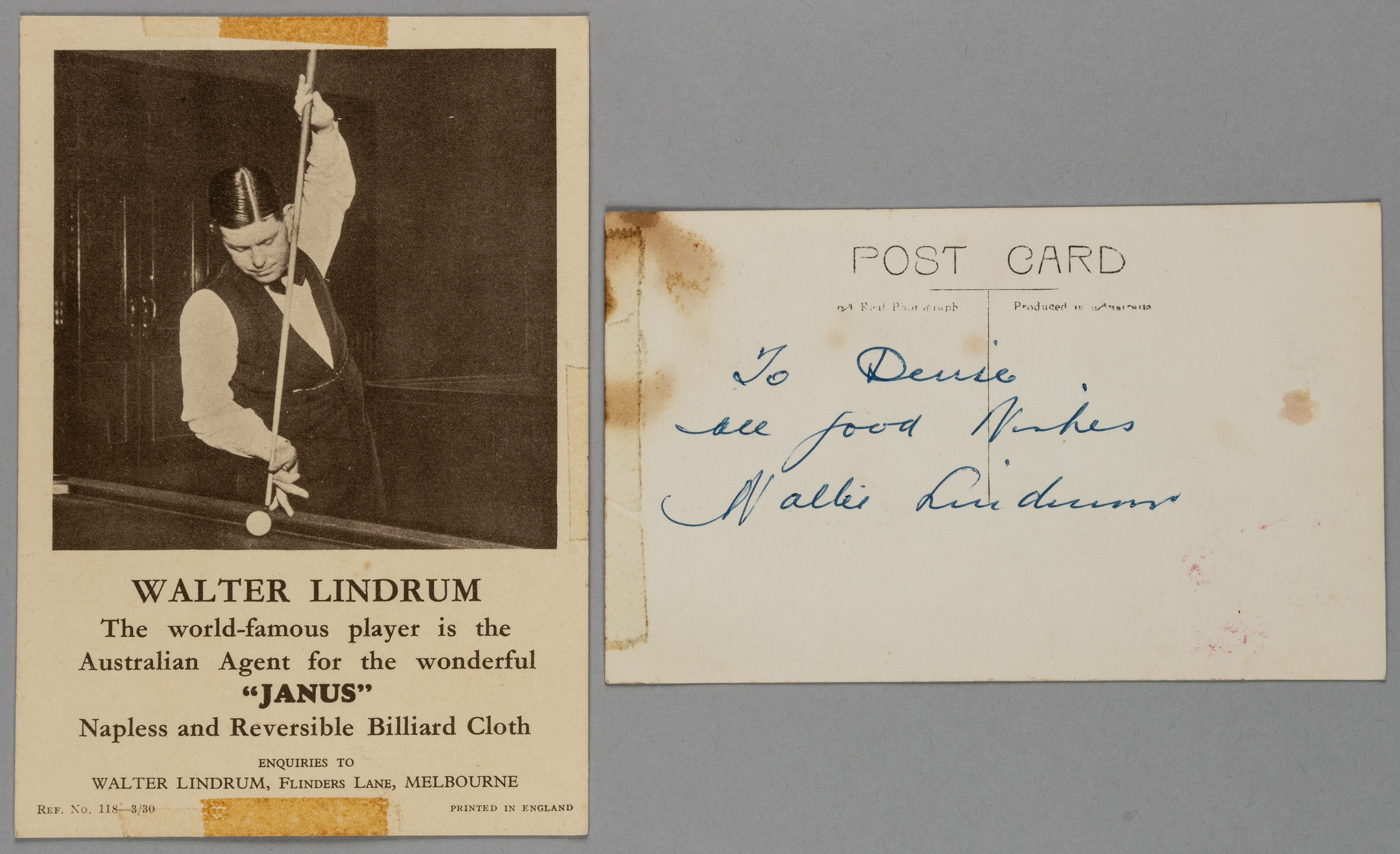 Walter Lindrum collection of Billiards related items, including signed, inscribed and dedicated postcard, an advertising card for ‘Janus’ Billiard cloth and a photograph of Walter Lindrum tutoring Don Bradman at Billiards (total of 3 items) Walter Albert Lindrum, OBE (29th August 1898 – 30th July 1960), was an Australian professional player of English billiards who held the World Professional Billiards Championship from 1933 until his retirement in 1950. On Lindrum's second tour of England, in late 1930, Donals Bradman and other members of the touring Australian cricket team, would sometimes attend Lindrum's matches at Thurston’s Hall, London. As an indication of the esteem in which Lindrum was held, the critic Neville Cardus referred to Bradman as "the Lindrum of cricket".