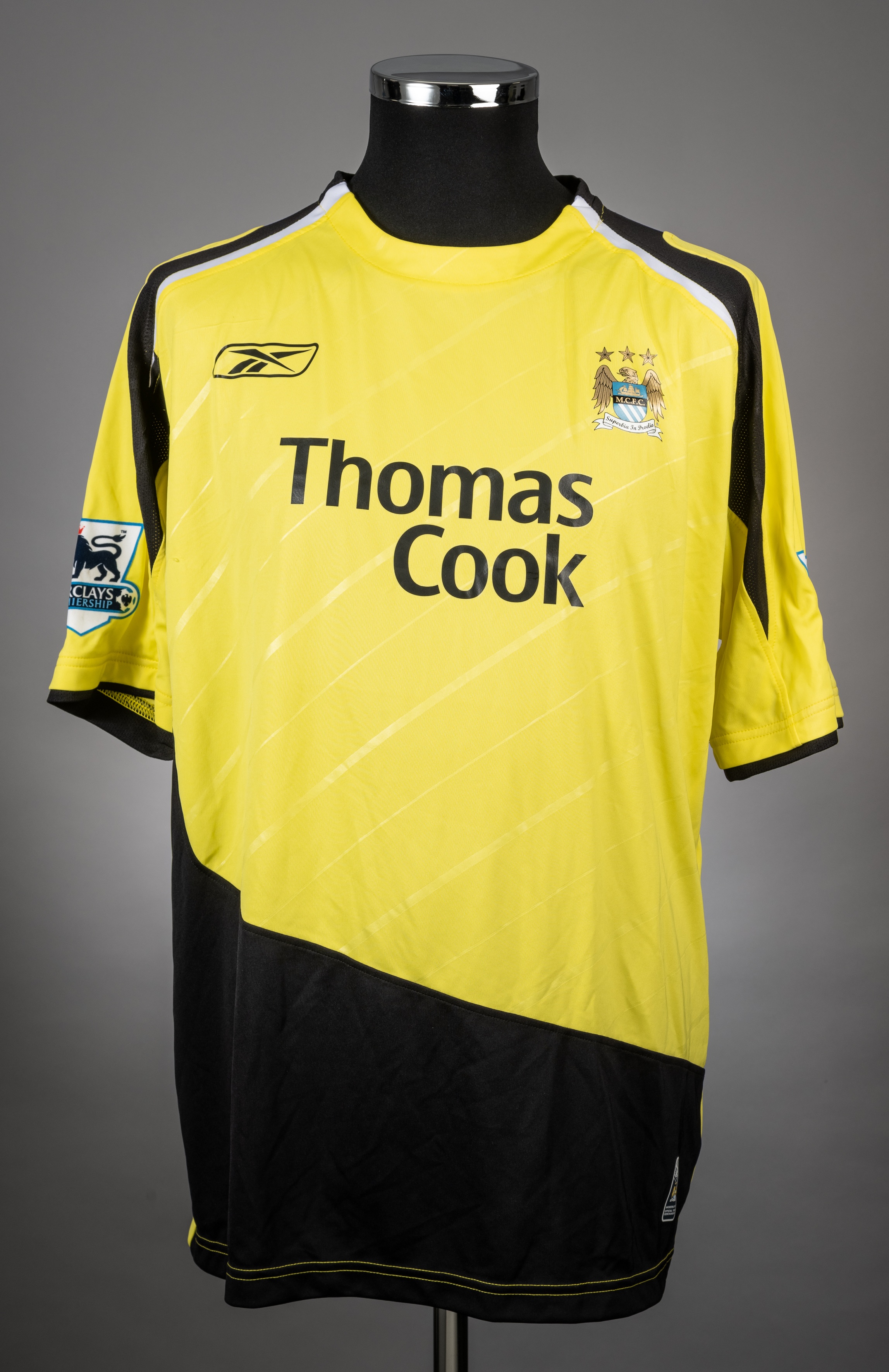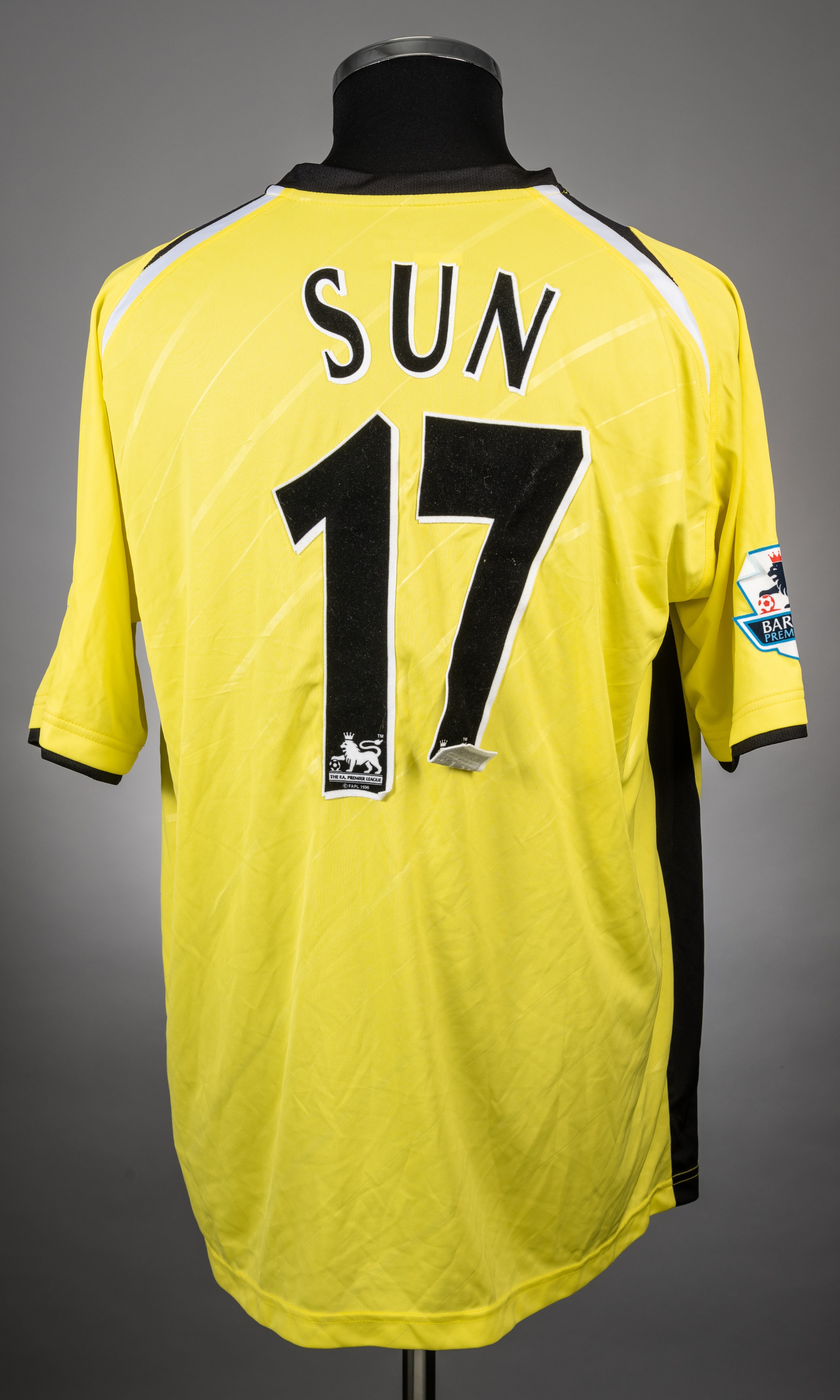 Sun Jihai yellow, black and white No.17 Manchester City short-sleeved jersey, 2006-07, Reebok, L, 3rd kit, with crew-neck collar and printed badge, the reverse lettered SUN, the sleeves with Barclays Premiership flashes