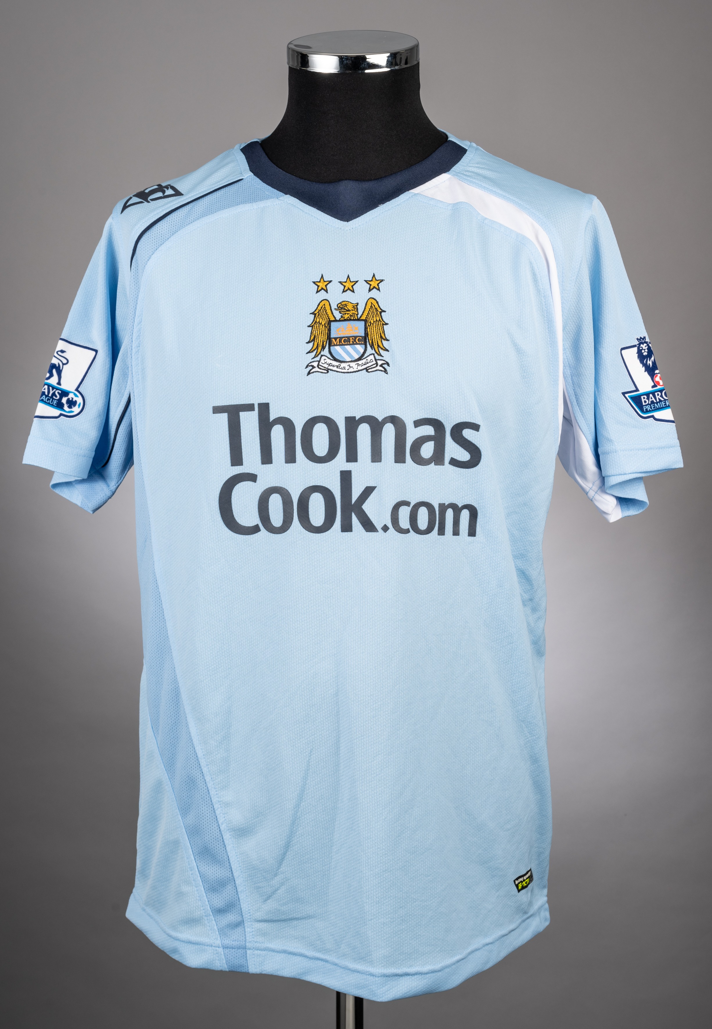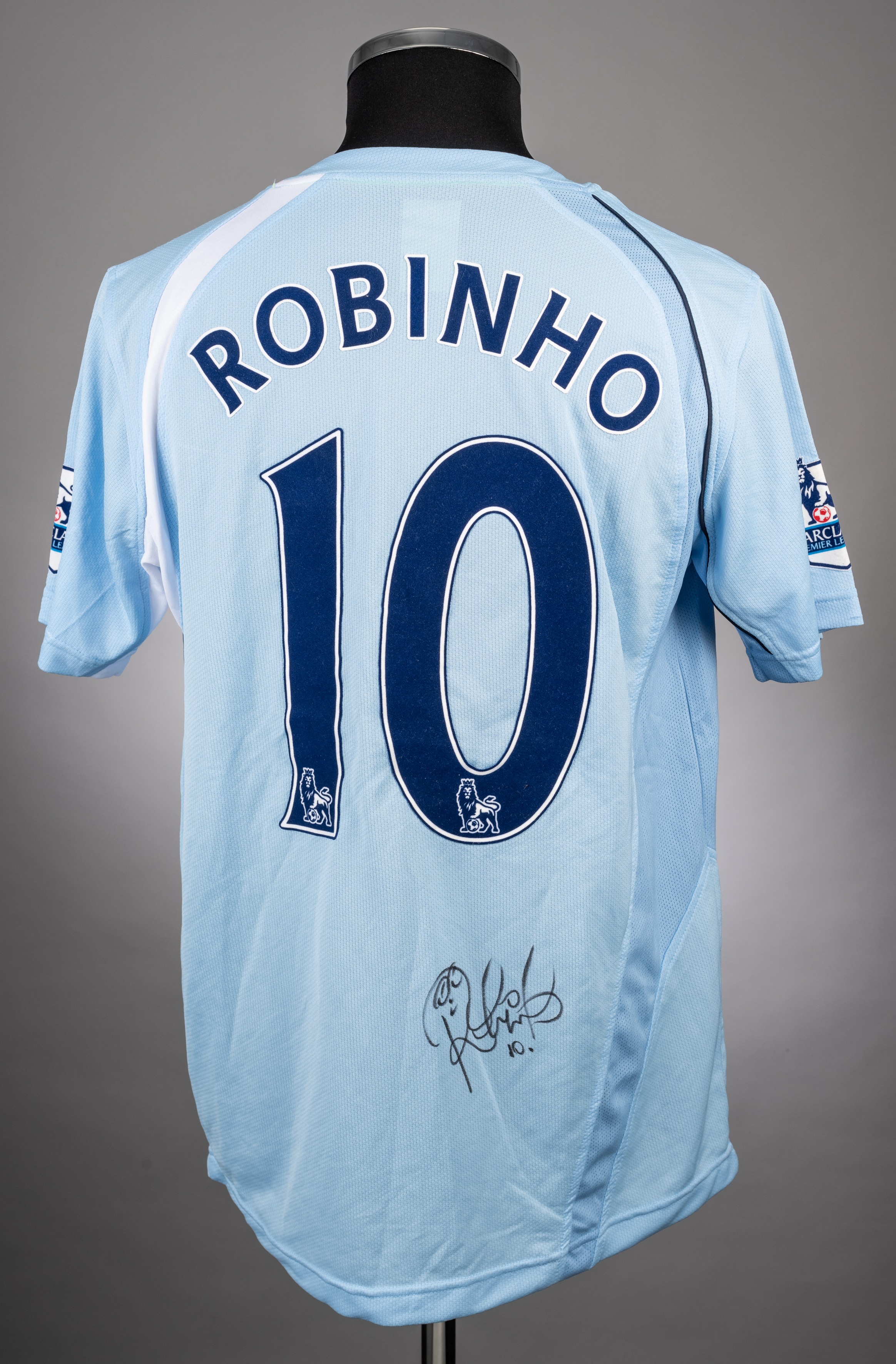 Robinho sky-blue No.10 Manchester City short-sleeved jersey, 2008-09, Le Coq Sportif, M, with v-neck style collar and embroidered badge inscribed M.C.F.C., Superbia In Proelia, the reverse lettered ROBINHO, the reverse also autographed by Robinho, the sleeves with Barclays Premier League flashes
