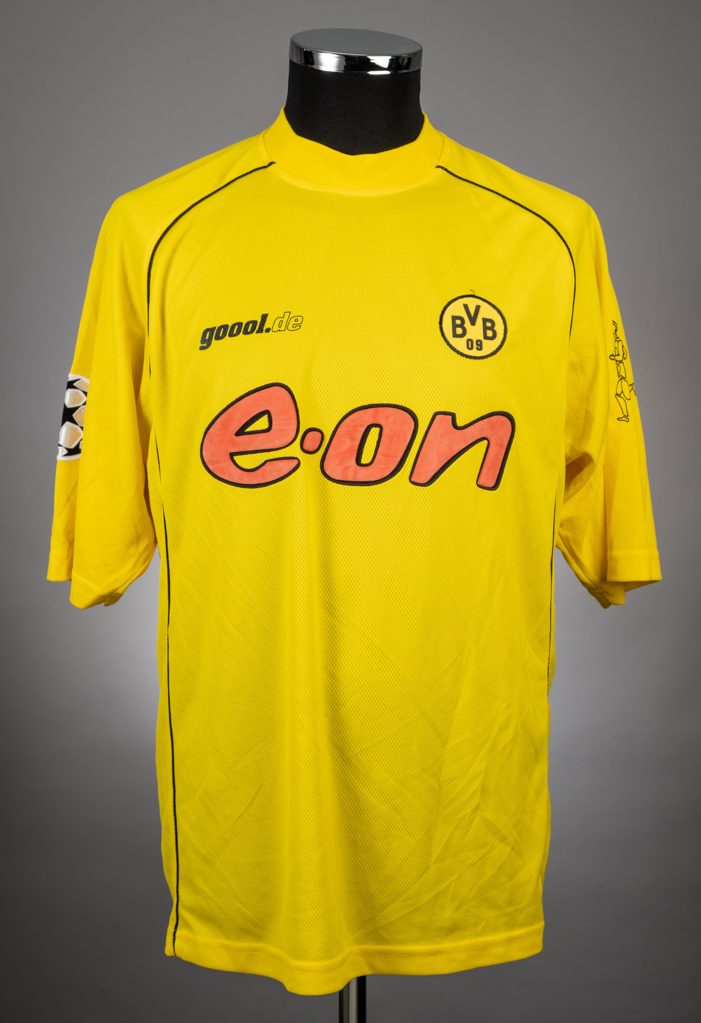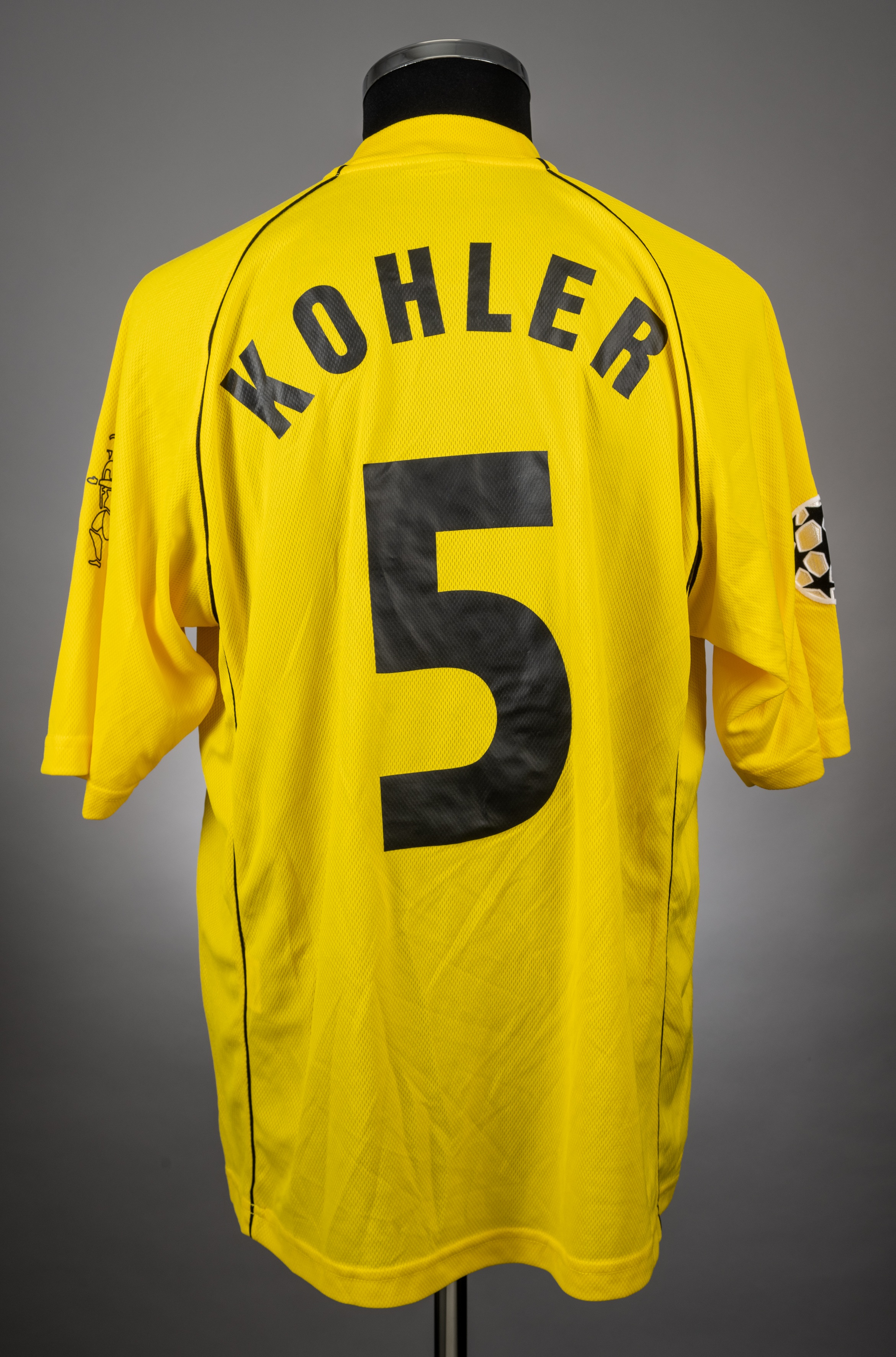 Jurgen Kohler yellow No.5 Borussia Dortmund short-sleeved jersey, 2001-03, Goool.de, L, with crew-neck collar and embroidered cloth badge inscribed BVB 09, the reverse lettered KOHLER, the right sleeve with Champions League flashes