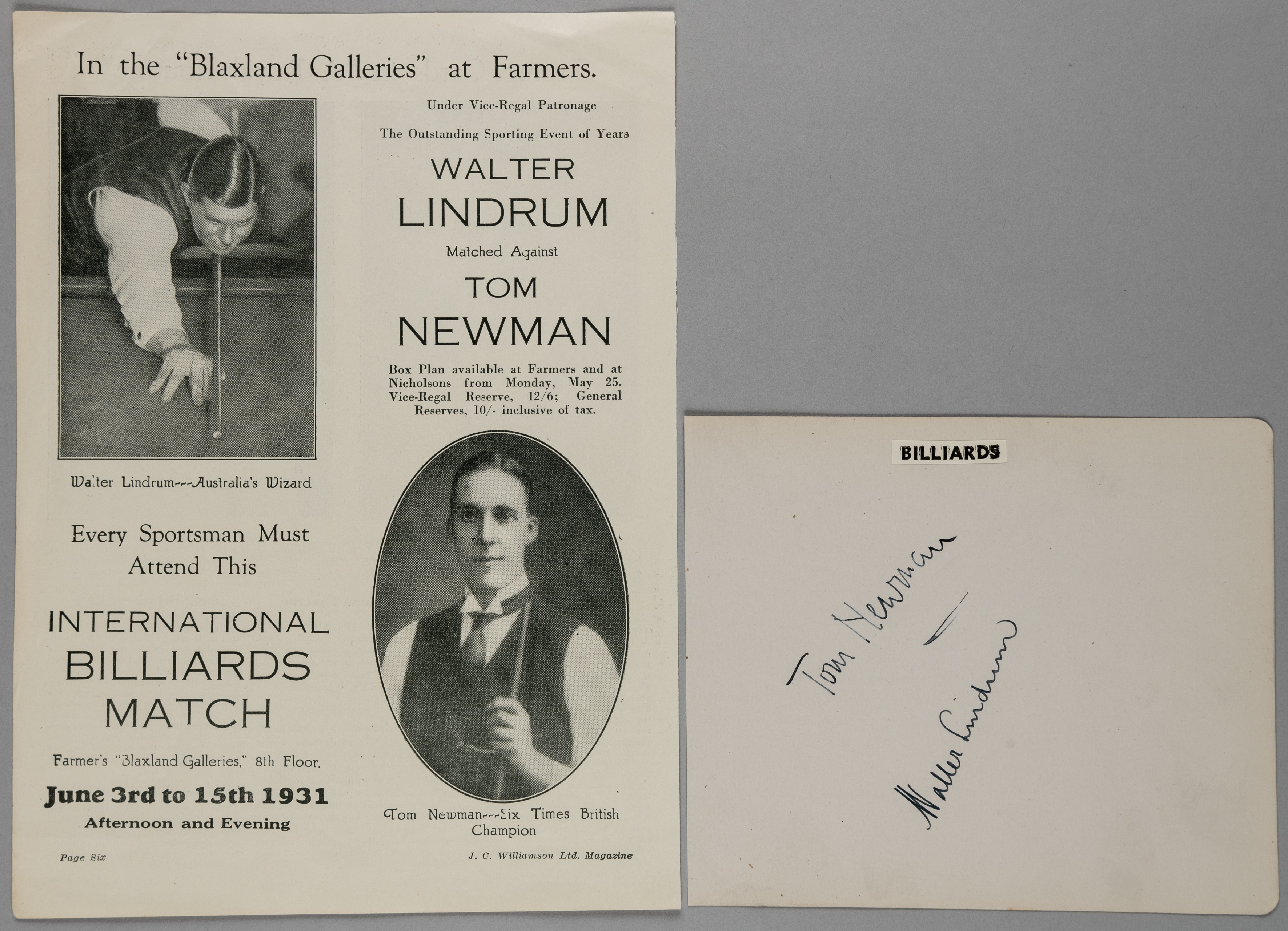 Tom Newman & Walter Lindrum, World Billiards Champions Tom Newman (1921, 1922, 1924, 1925, 1926 and 1927) and Walter Lindrum (1933 & 1934) pair of original vintage ink signatures, to a 6.25 by 5.25in. album page, sold with a printed full page match advertisement for a series of exhibition matches to be played between June 3rd and June 15th 1931 between Lindrum and Newman, featuring vignette images of both players and match details, ideal for display, both items in good condition Tom Newman (23rd March 1894 – 30th September 1943) was an English professional player of Billiards and Snooker. He established himself as the best billiards players of the 1920s, appearing in every World Professional Billiards Championship final between 1921 and 1930, and winning the title six times. In the last five of these finals, he met Joe Davis, winning twice (1926 & 1927) and losing three times (1928, 1929 & 1930). On the 5th of March 1931, he made his personal highest break of 1,827 in a match against Walter Lindrum at the Foresters' Hall, Dundee. Walter Albert Lindrum, OBE (29th August 1898 – 30th July 1960), often known as Wally Lindrum, was an Australian professional player of English billiards who held the World Professional Billiards Championship from 1933 until his retirement in 1950. He was one of the most successful players ever seen in billiards, with 57 world records to his credit, some of which still stand.