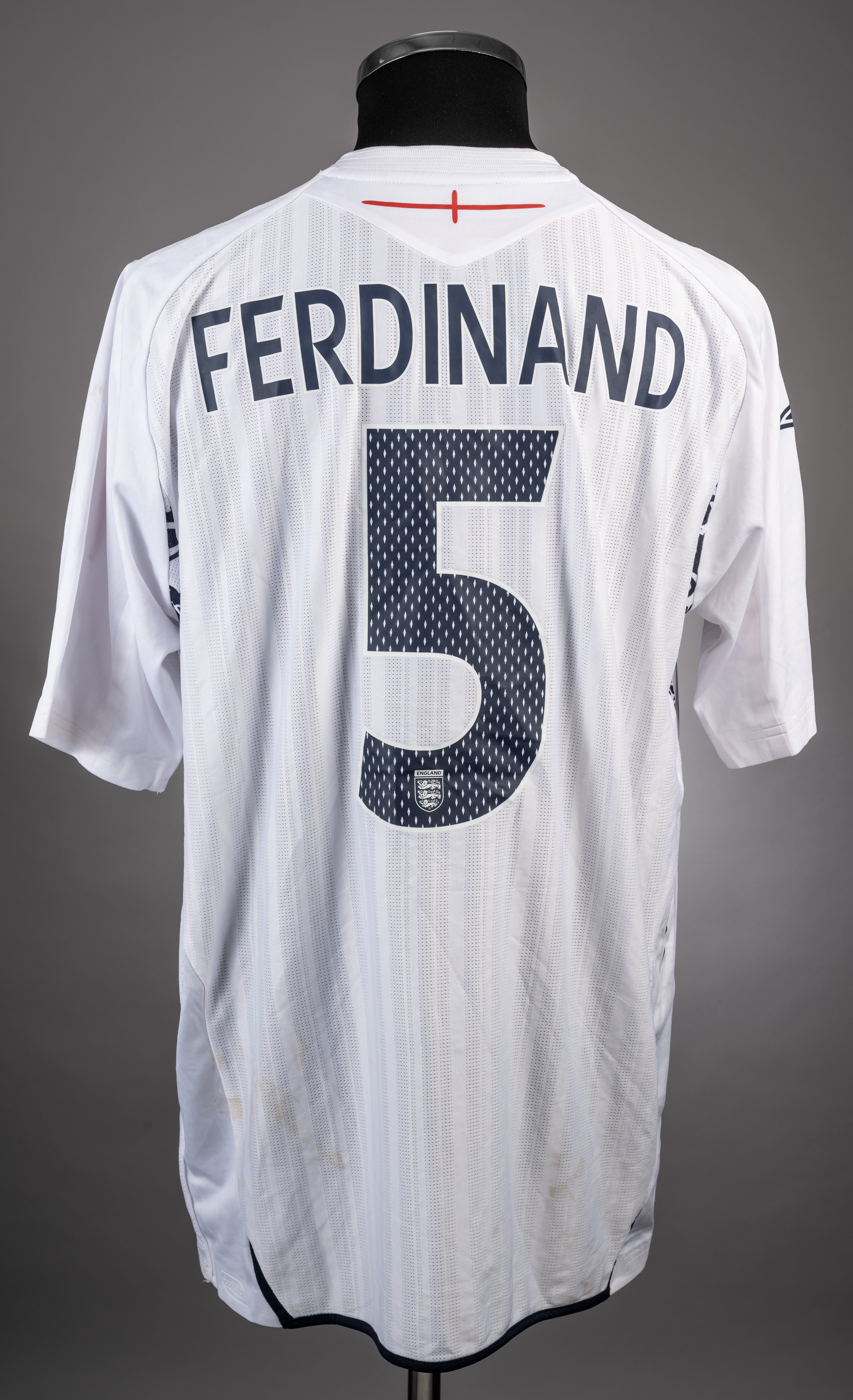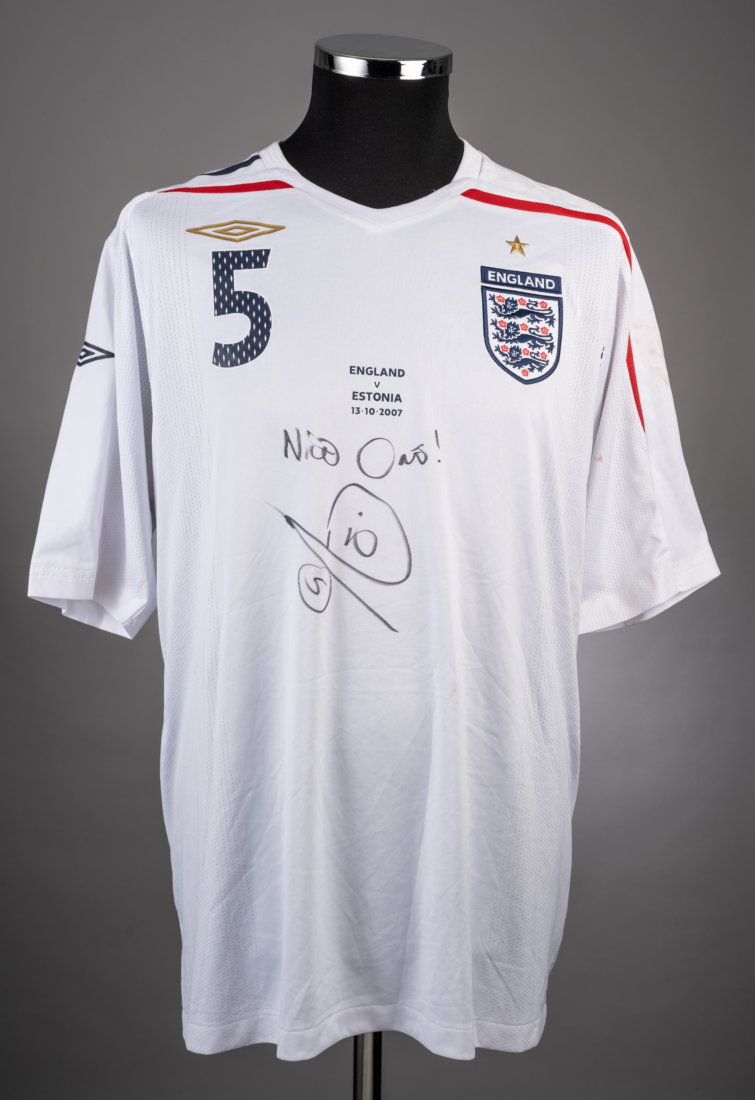 Rio Ferdinand white No.5 England v. Estonia match issue short-sleeved jersey, 2007, Umbro, XL, with v-neck collar and embroidered cloth badge inscri