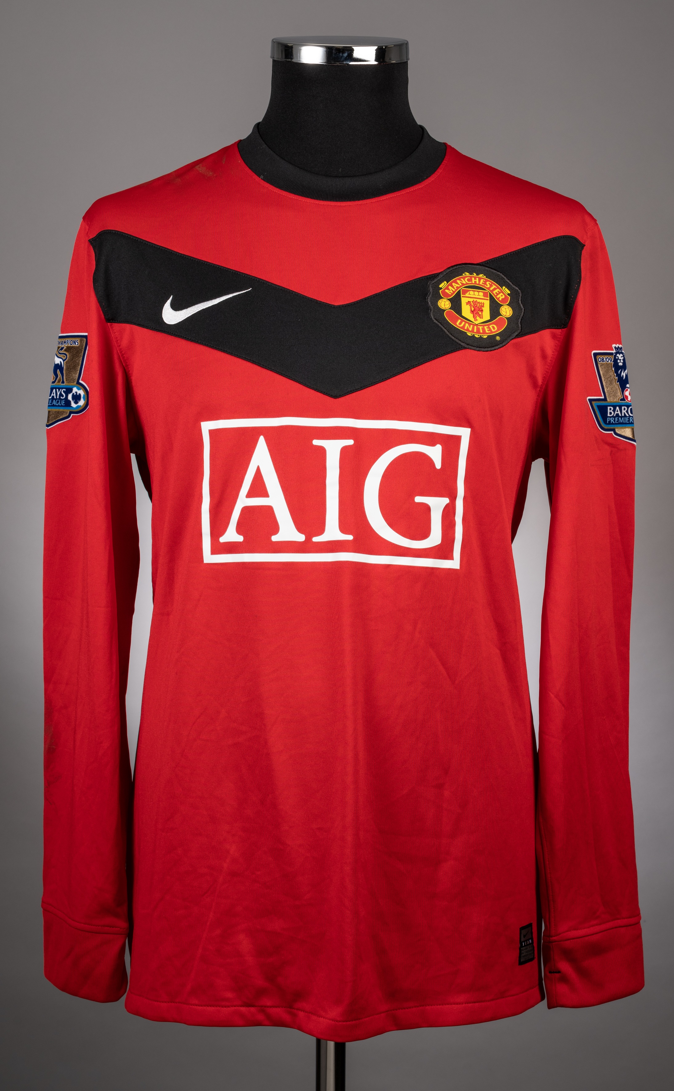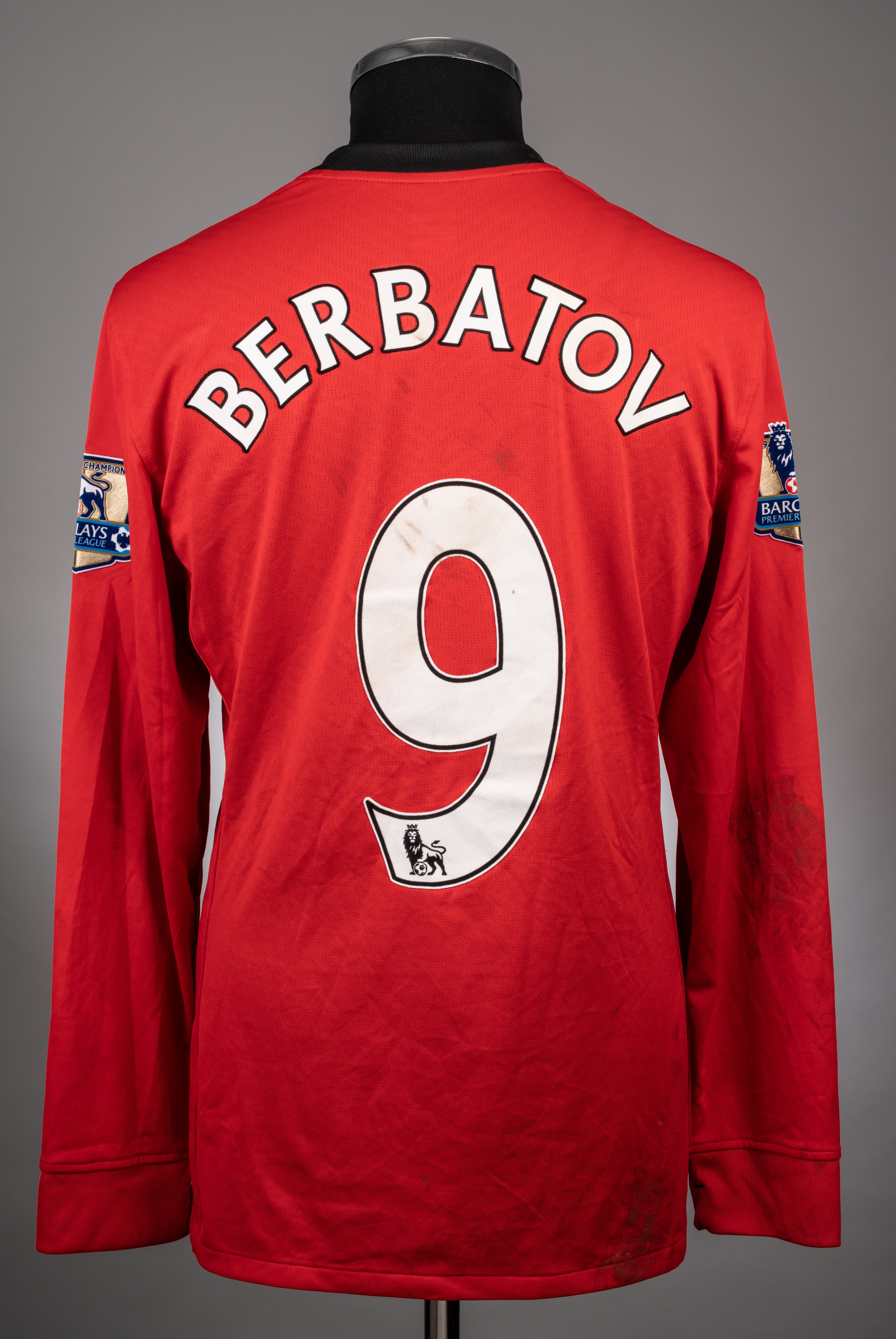 Dimitar Berbatov red and black No.9 Manchester United long-sleeved jersey, 2009-10, Nike, L, with crew-neck collar and embroidered cloth badge inscribed MANCHESTER UNITED, the reverse lettered BERBATOV, the sleeves with Barclays Premier League 08/09 Champions flashes, areas of pitch staining front and back and on sleeves