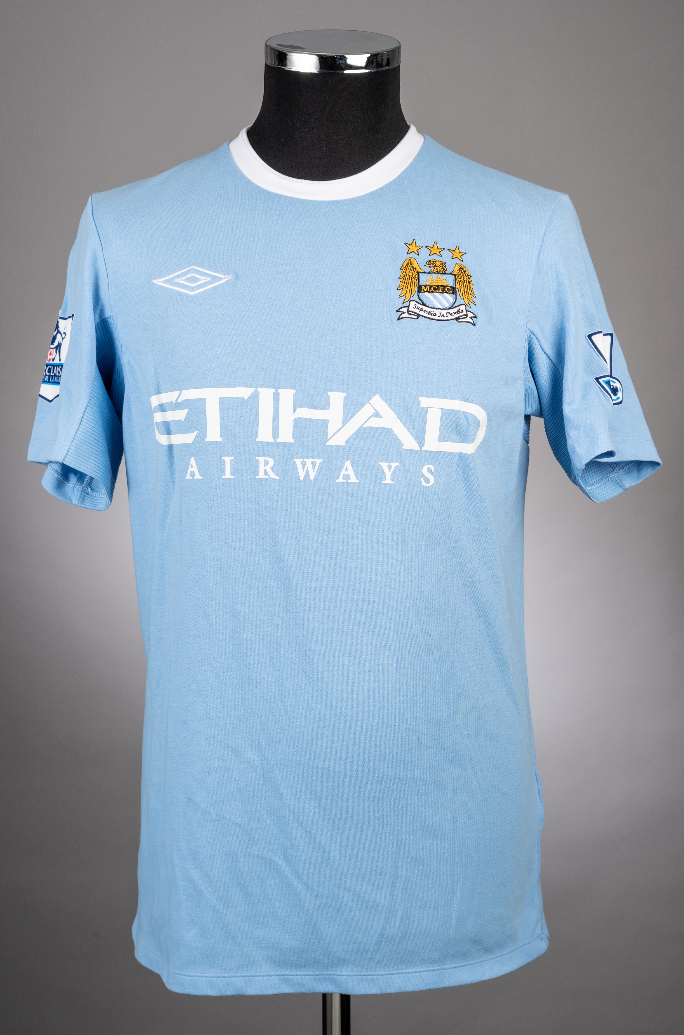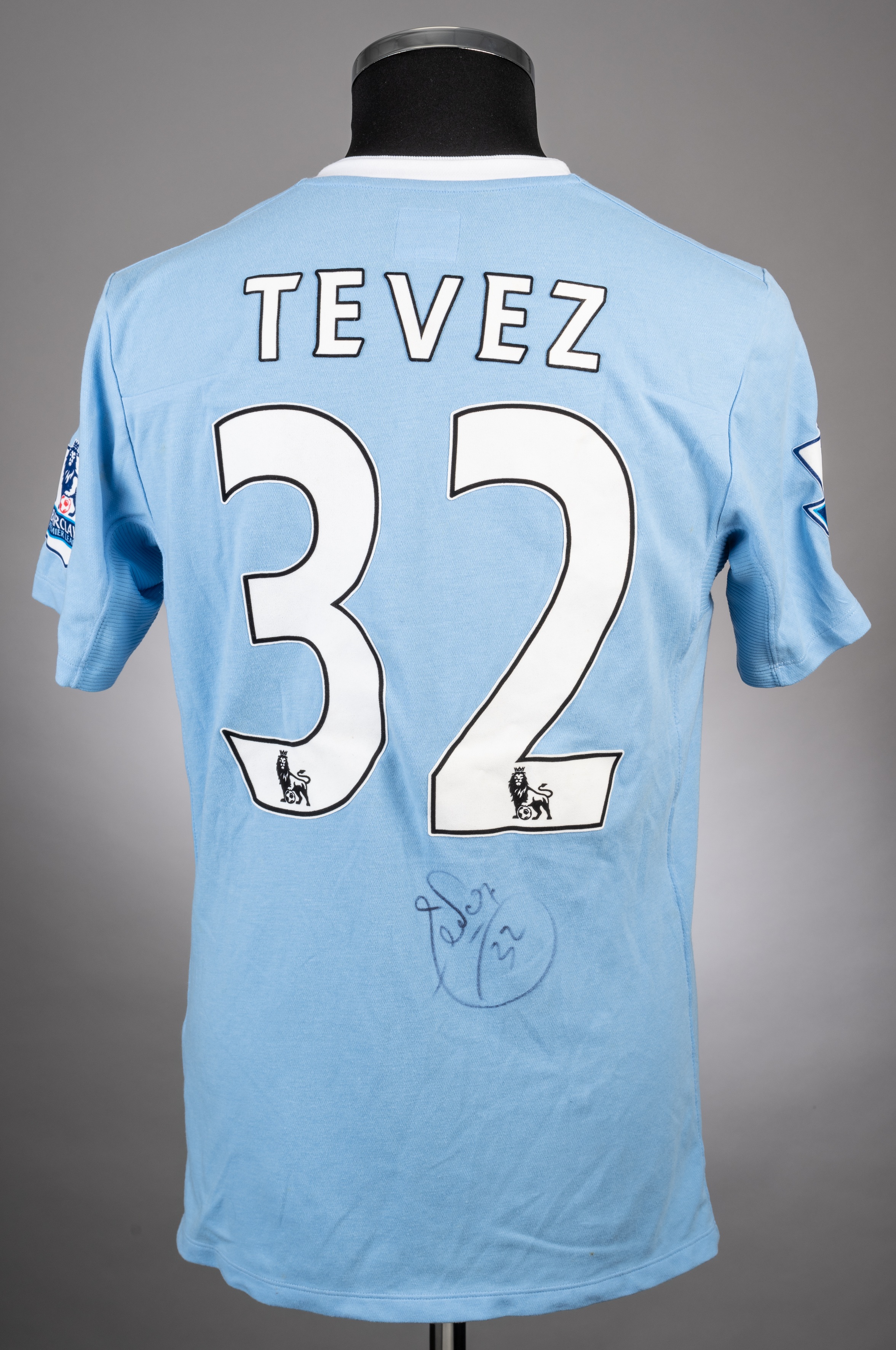 Carlos Tevez sky-blue and white No.32 Manchester City short-sleeved jersey, 2009-10, Umbro, 38, with crew-neck collar and embroidered badge inscribed M.C.F.C. Superbia In Proelia, the reverse lettered TEVEZ, the reverse also autographed by Tevez, the sleeves with Barclays Premier League flashes