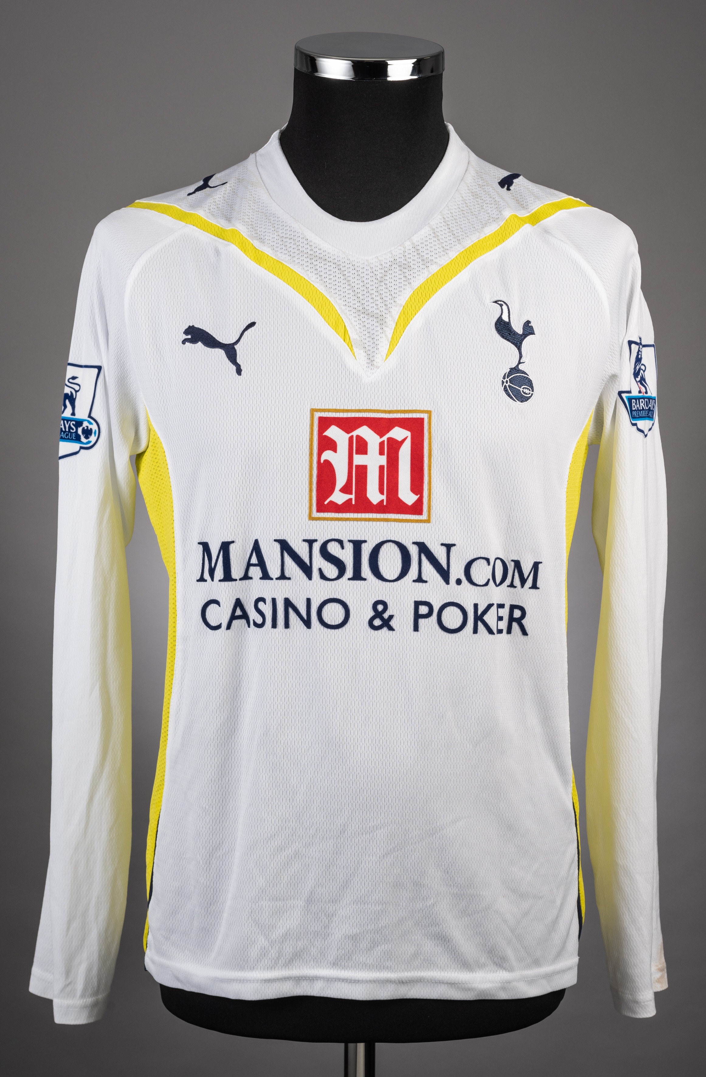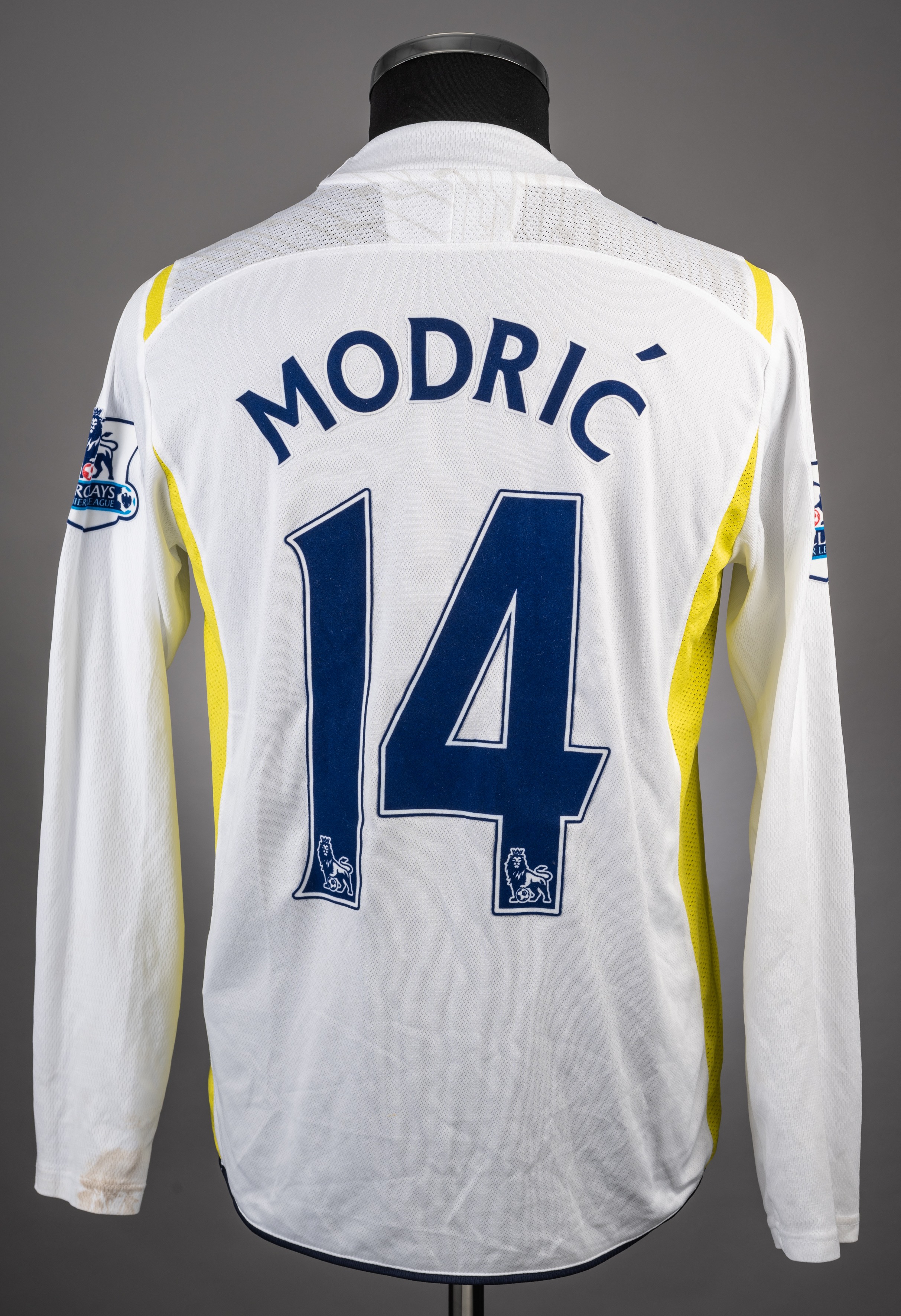 Luka Modric white and yellow No.14 Tottenham Hotspur long-sleeved jersey, 2009-10, Puma, M, with crew-neck collar and embroidered cloth badge, the reverse lettered MODRIC, the sleeves with Barclays Premier League flashes