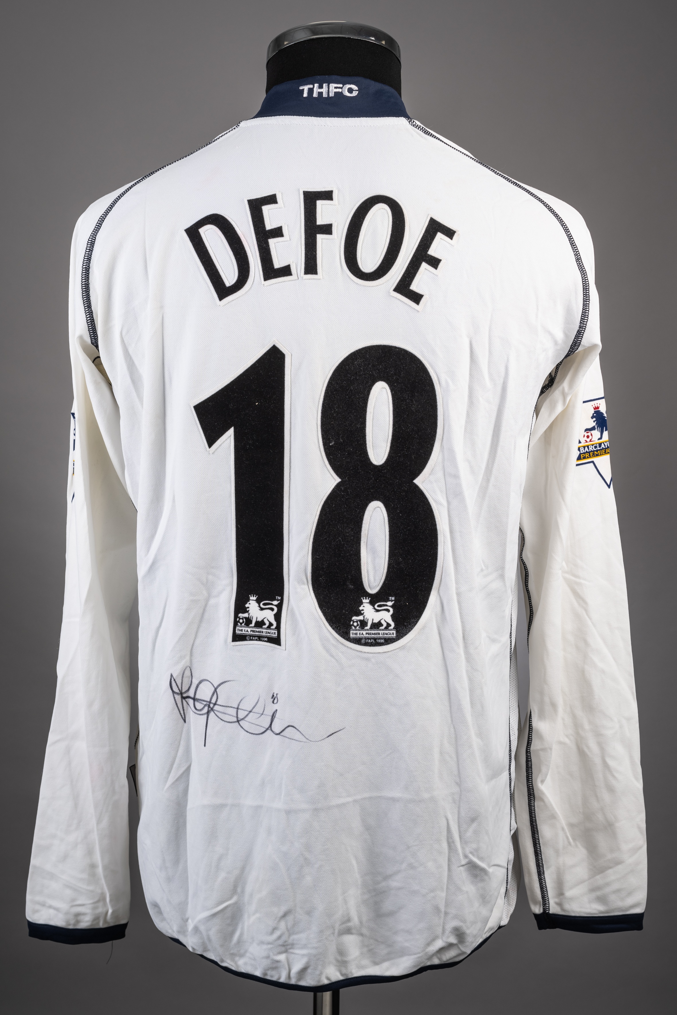 Jermain Defoe white and blue No.18 Tottenham Hotspur long-sleeved jersey, 2003-04, Kappa, with crew-neck collar and embroidered badge inscribed AUDERE EST FACERE, the reverse lettered DEFOE, the reverse also autographed by Defoe, the sleeves with Barclaycard Premiership flashes