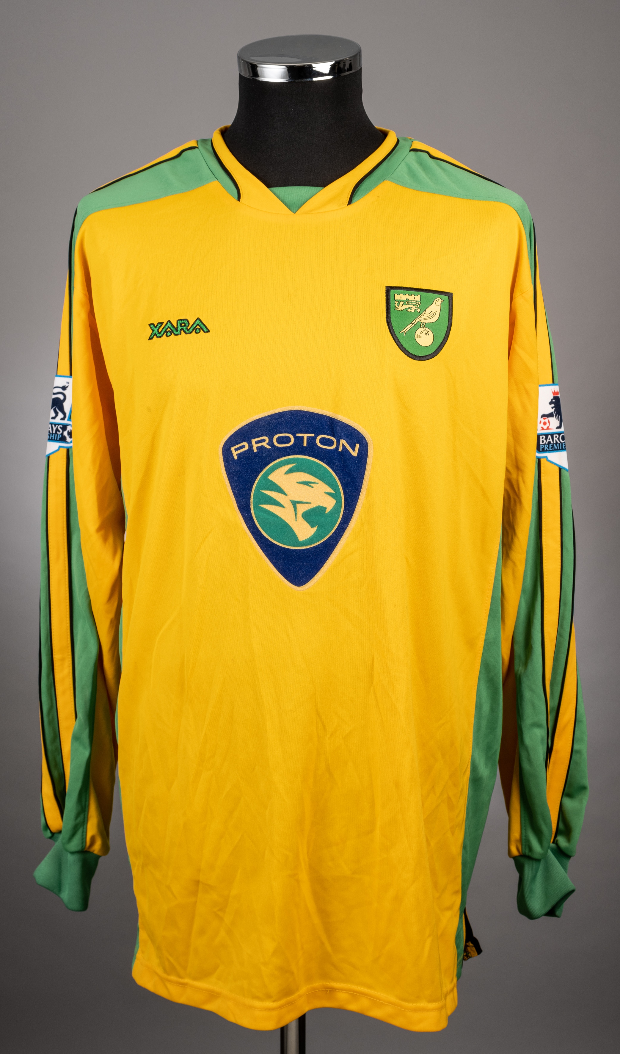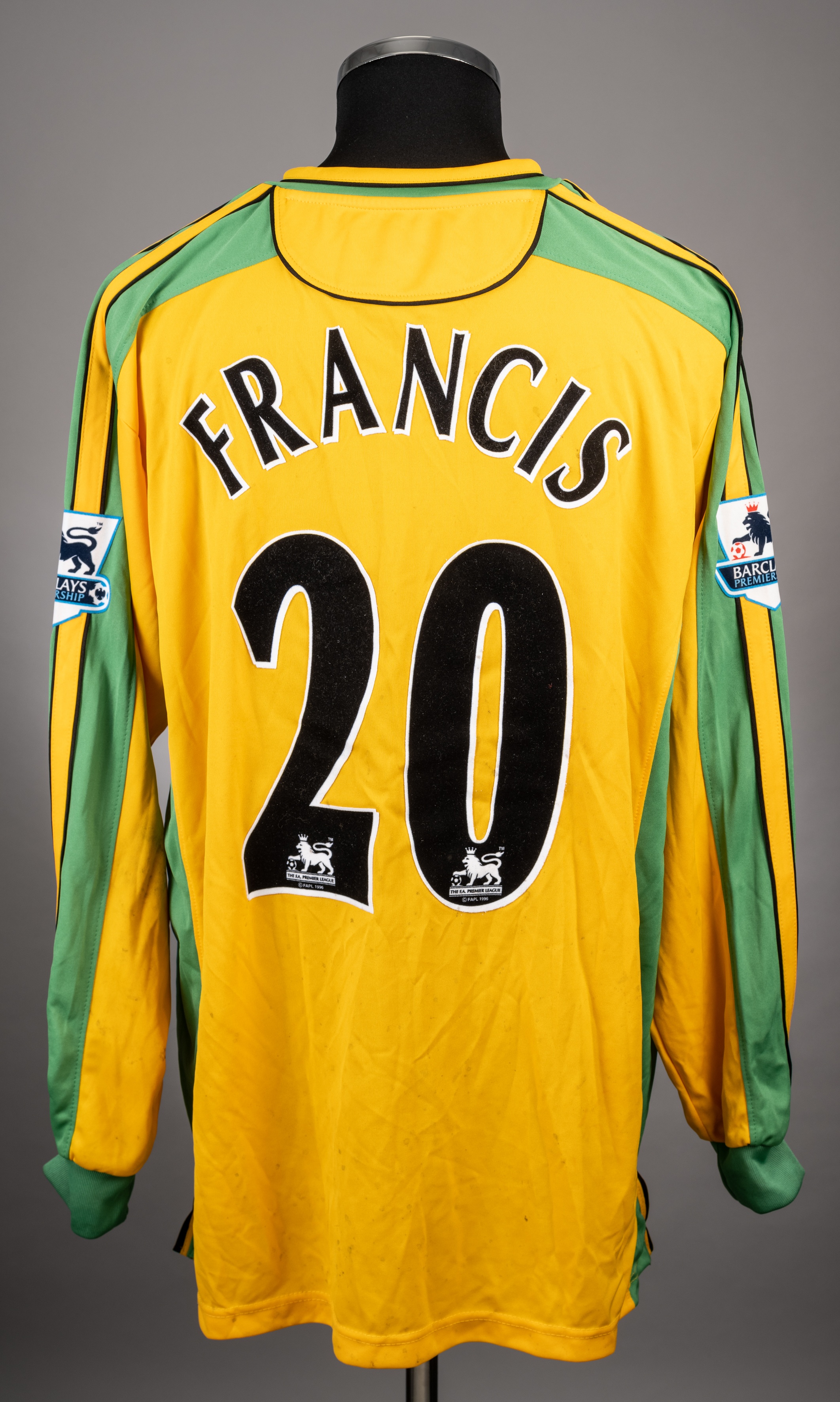 Damien Francis yellow and green No.20 Norwich City long-sleeved jersey, 2003-05, Xara, XL, with v-neck collar and embroidered cloth badge the reverse lettered FRANCIS, the sleeves with Barclays Premiership flashes