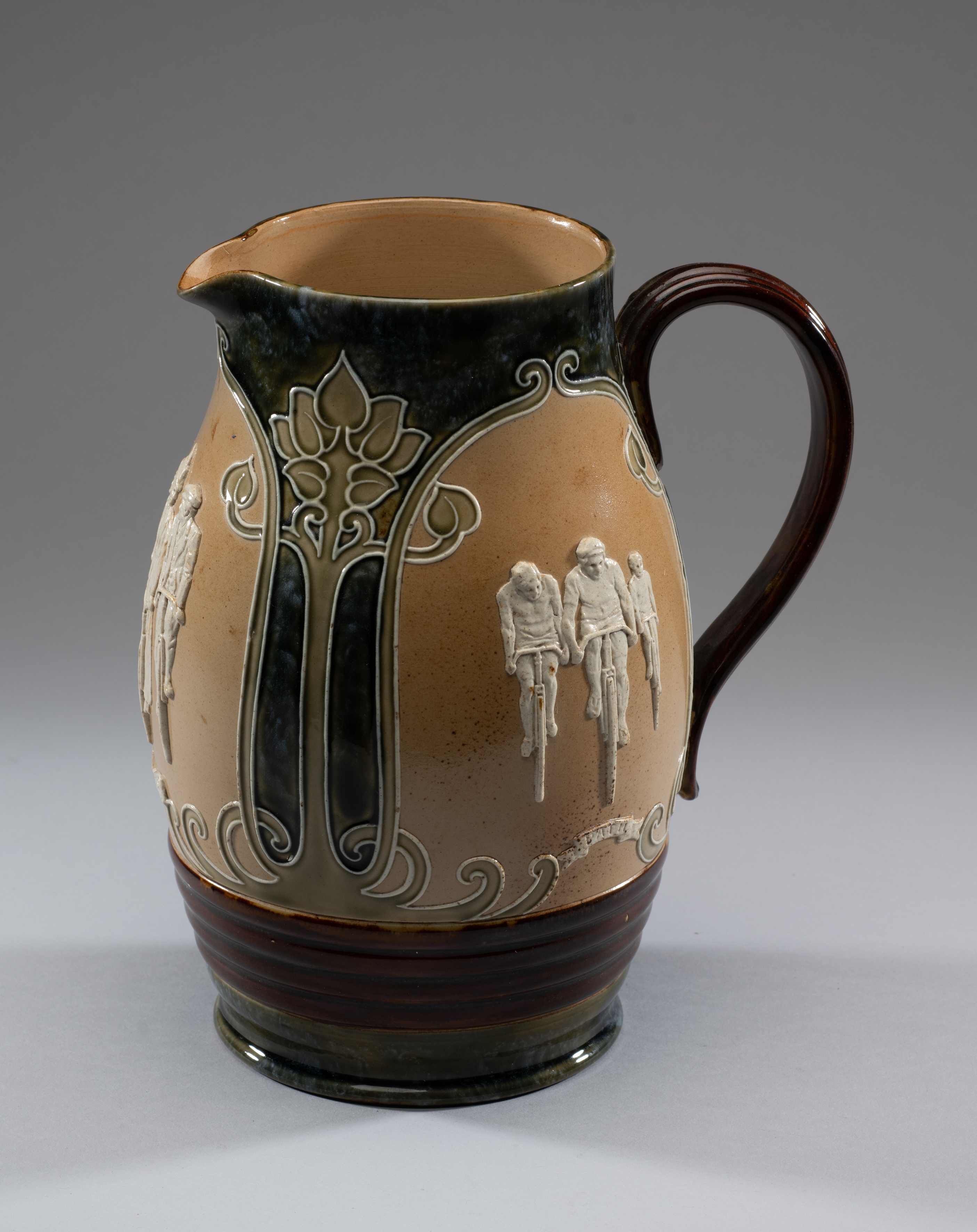 Doulton Lambeth pottery cycling jug early 20th century, in Art Nouveau style with three relief vignettes of cyclists titled 'Military'; 'Road'; 'Path