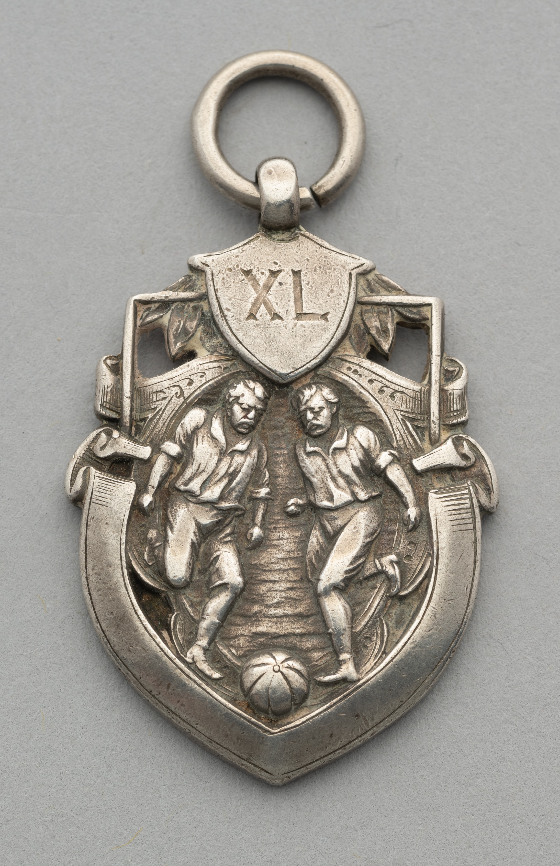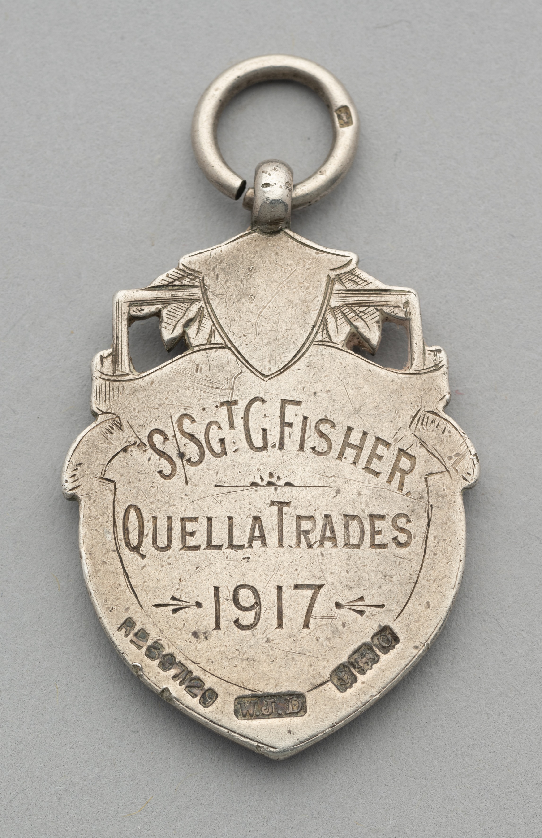Silver football medal for Quella Trades, 1917, obverse embossed with two footballers and XL engraved in a shield, reverse engraved S.Sgt G Fisher Que
