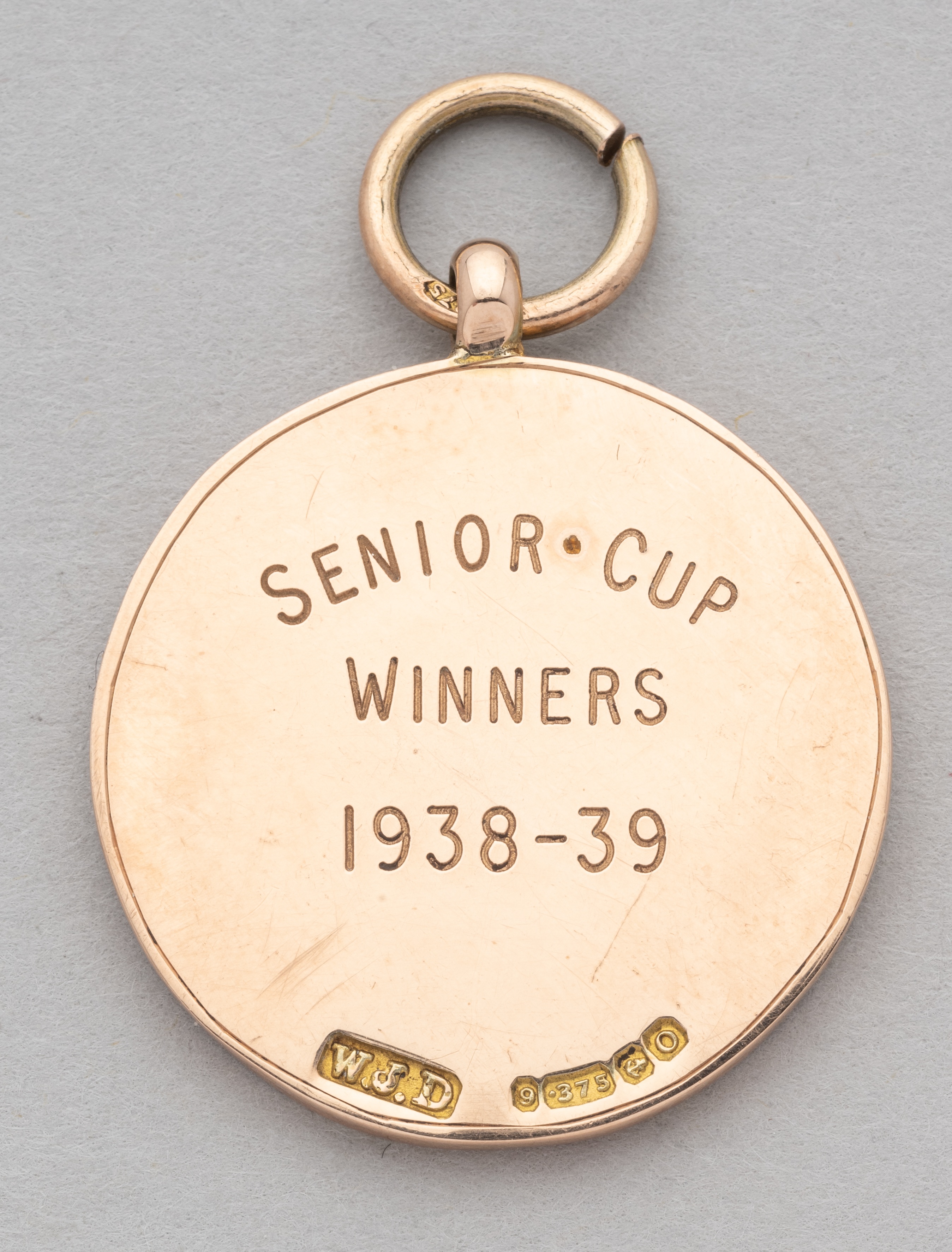 A 9ct gold and enamel Berks & Bucks Football Association medal, 1938-39, the obverse inscribed Berks & Bucks Football Association, the reverse inscribed Senior Cup, Winners, 1938-39, with ring suspension, 14grms