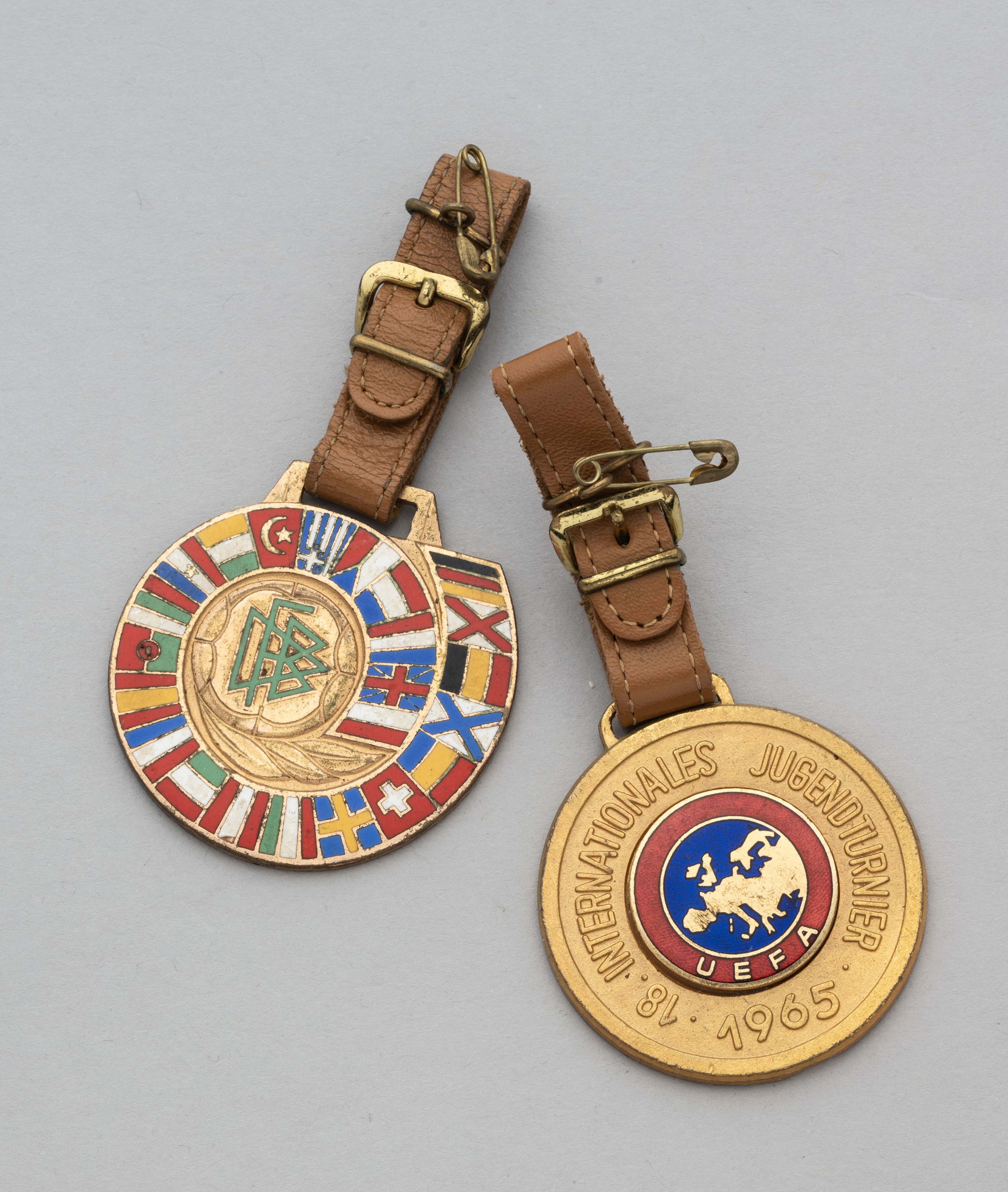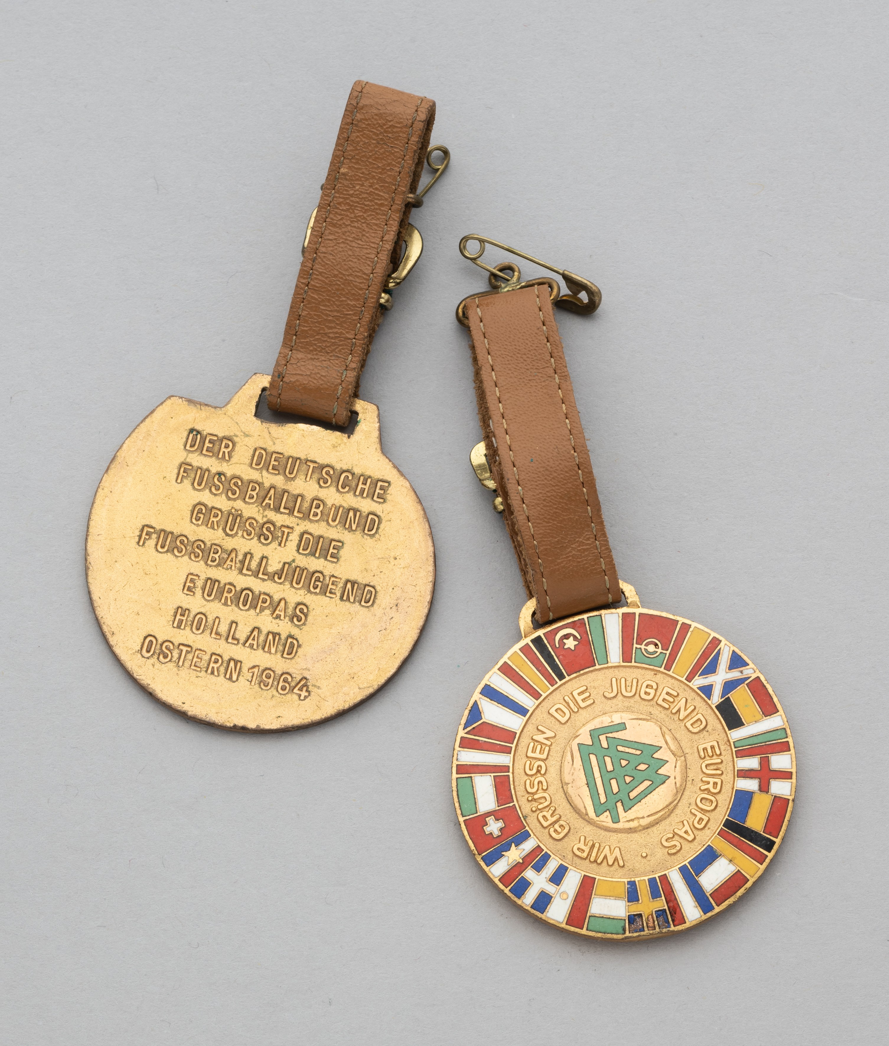 Two gilt-metal and enamel youth medallions, the obverse of one inscribed Wir Grussen Die Jugend Europas, the reverse inscribed 18 Internationales Jugendturnier, 1965, the reverse of the other inscribed Der Deutsche Fussball Bund Grusst Die Fussball Jugend Europas Holland Ostern 1964 both with leather straps, (2)