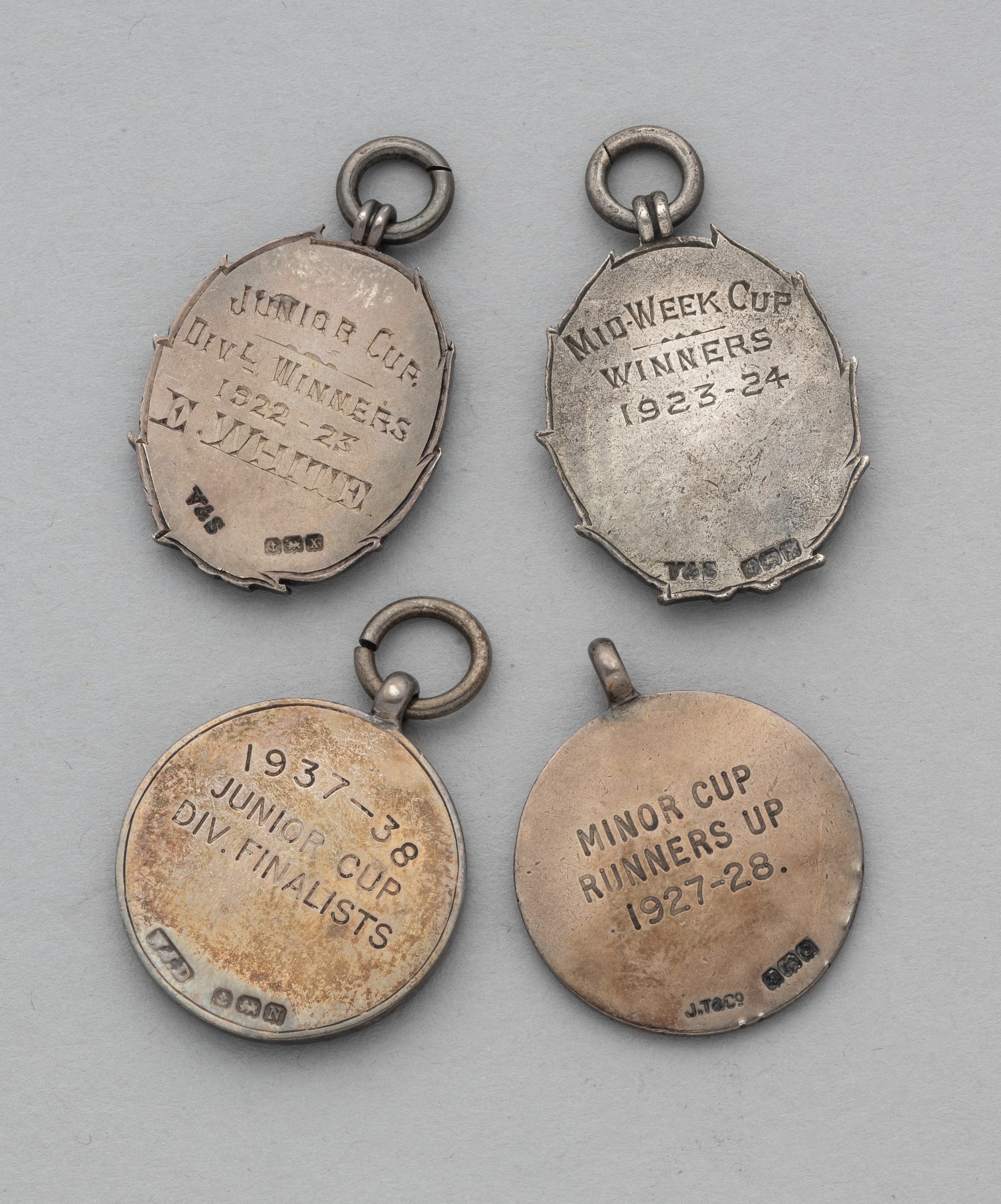 Four silver and enamel Berks & Bucks Football Association medals, 1920s/30s, the obverse of each inscribed Berks & Bucks Football Association, the reverse inscribed Junior Cup, Div. L Winners, 1922-23, E. White, another inscribed Mid-Week Cup, Winners, 1923-24, another inscribed Minor Cup, Runners-Up, 1927-28 and the final medal inscribed 1937-38, Junior Cup, Div. Finalists, three with ring suspension (4)
