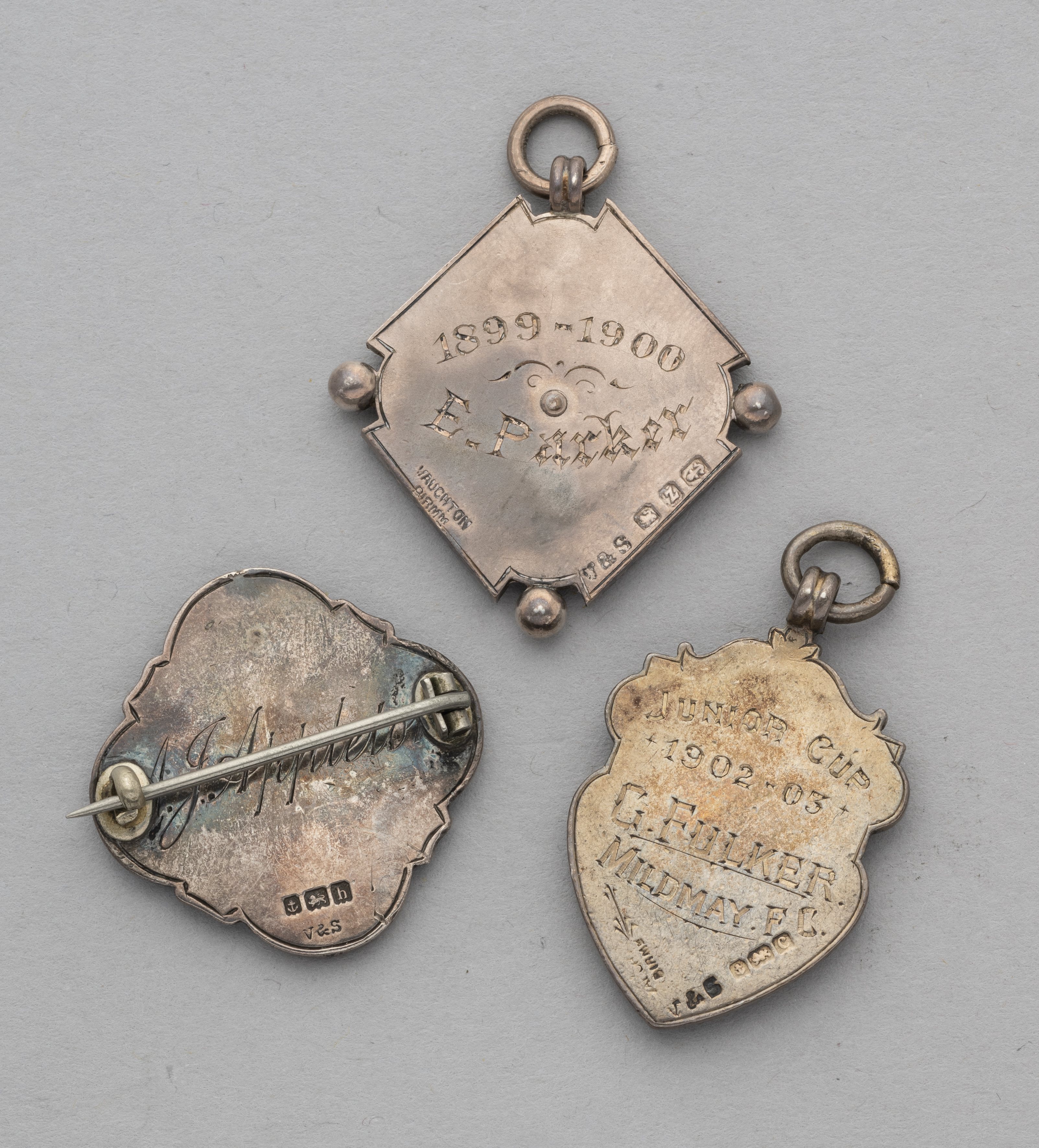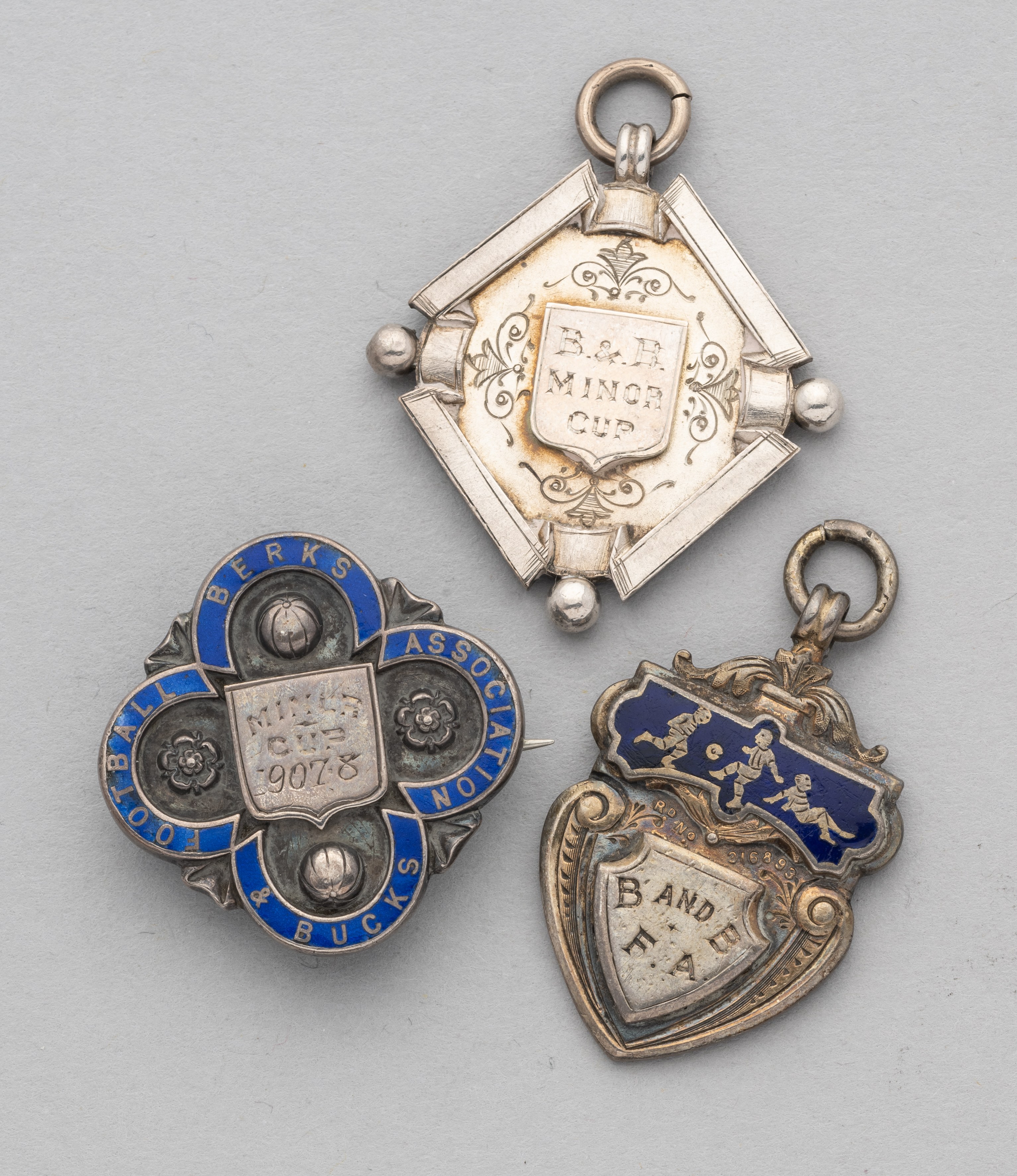 Two silver and enamel and a silver Berks & Bucks Football Association medals, the obverse inscribed, B&B Minor Cup, the reverse inscribed 1899-1900, E. Parker, another the reverse inscribed Junior Cup, 1902-03, G. Fulker, Mildmay F.C., both with ring suspension, the obverse of the final medal inscribed Berks & Bucks Football Association, Minor Cup 1907-8, the reverse inscribed J. Appleton with later brooch attachment (3)