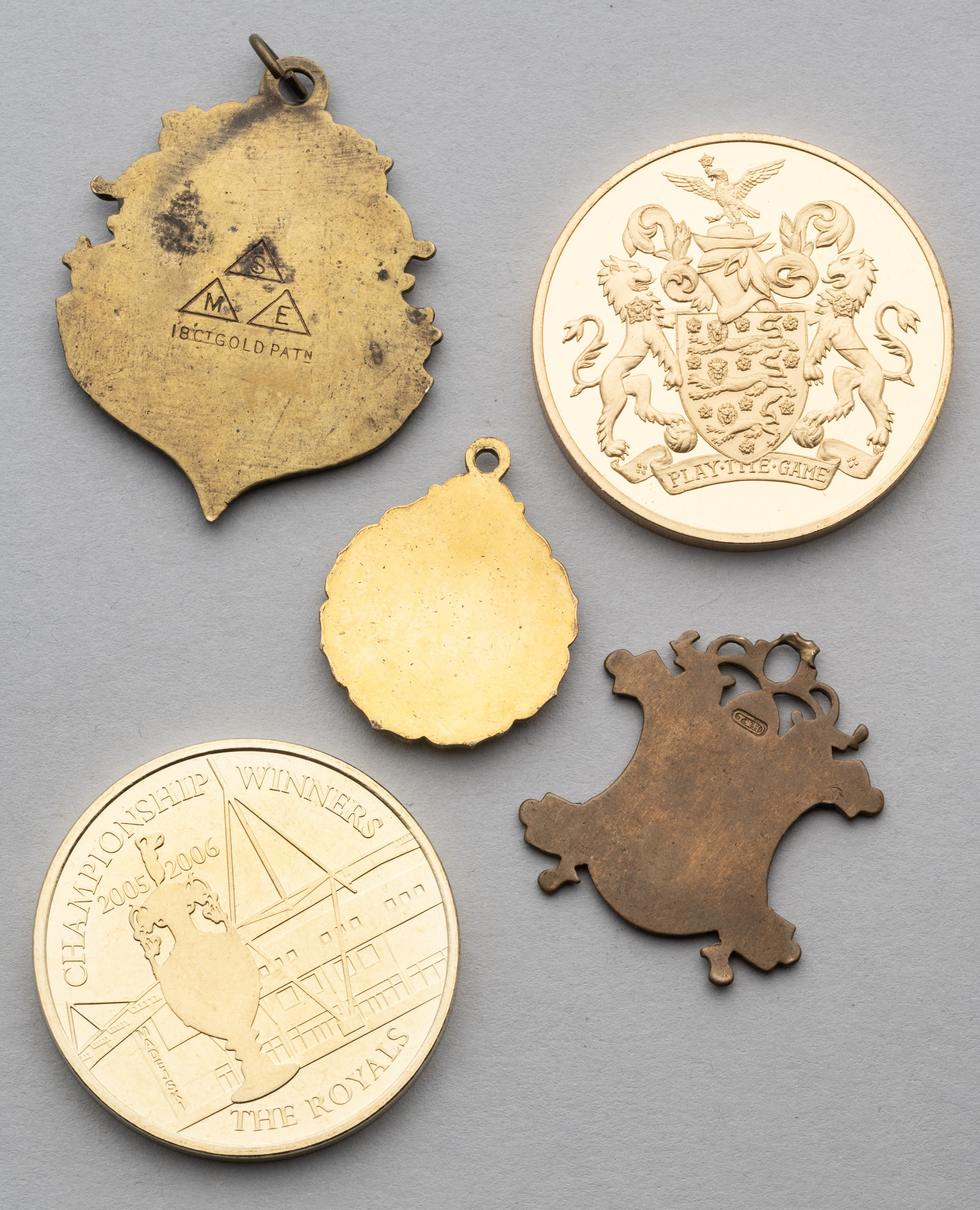 Reading FC 2005/06 Commemorative Promotion medal, in original fitted case, yellow-metal 25th Anniversary Football Association commemorative medallion and three other yellow-metal medals (5)