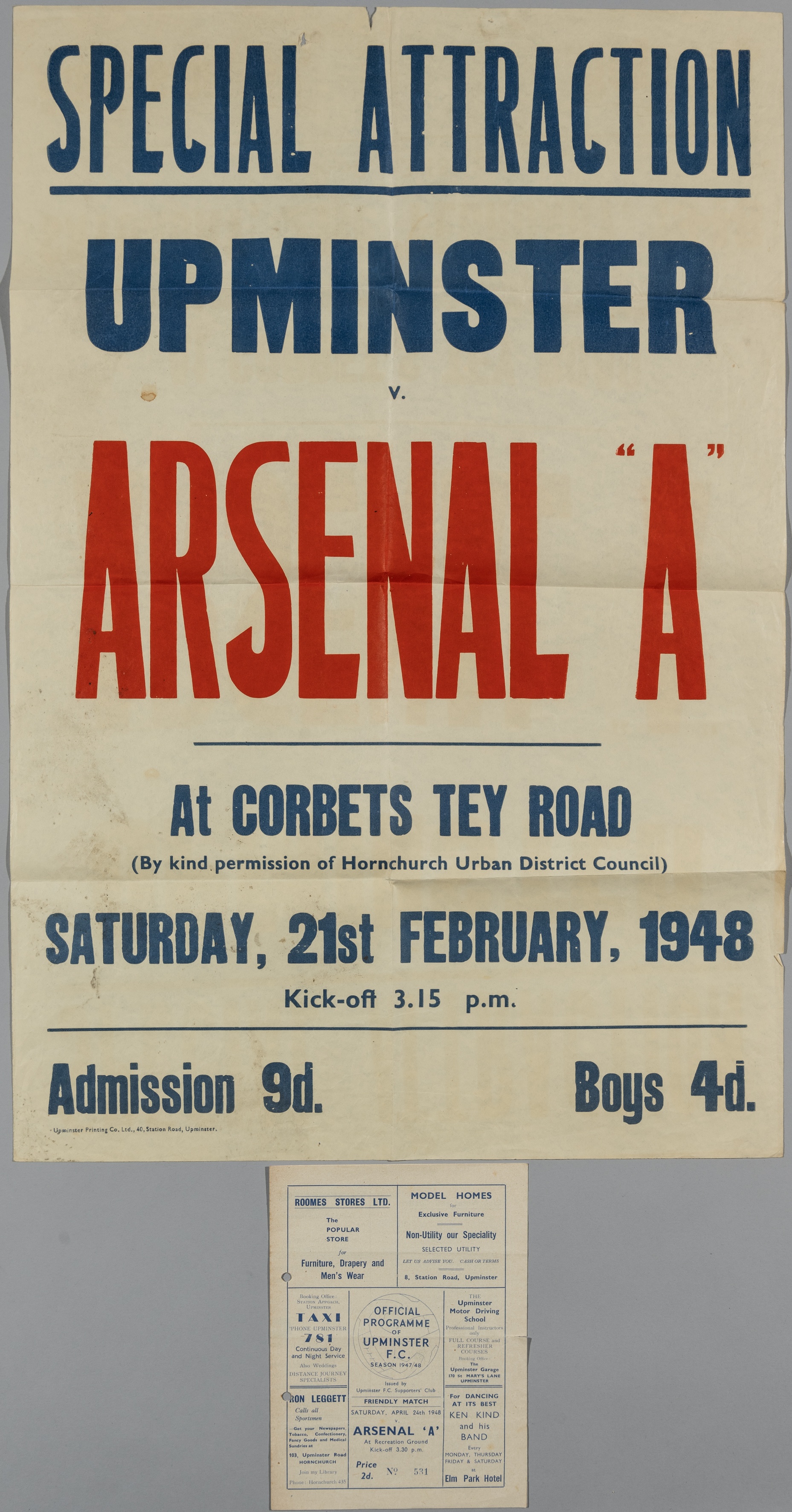 Upminster v. Arsenal "A" Friendly Match advertising poster, 1948, offset lithograph in colours. horizontal and vertical folds, some areas of stainin