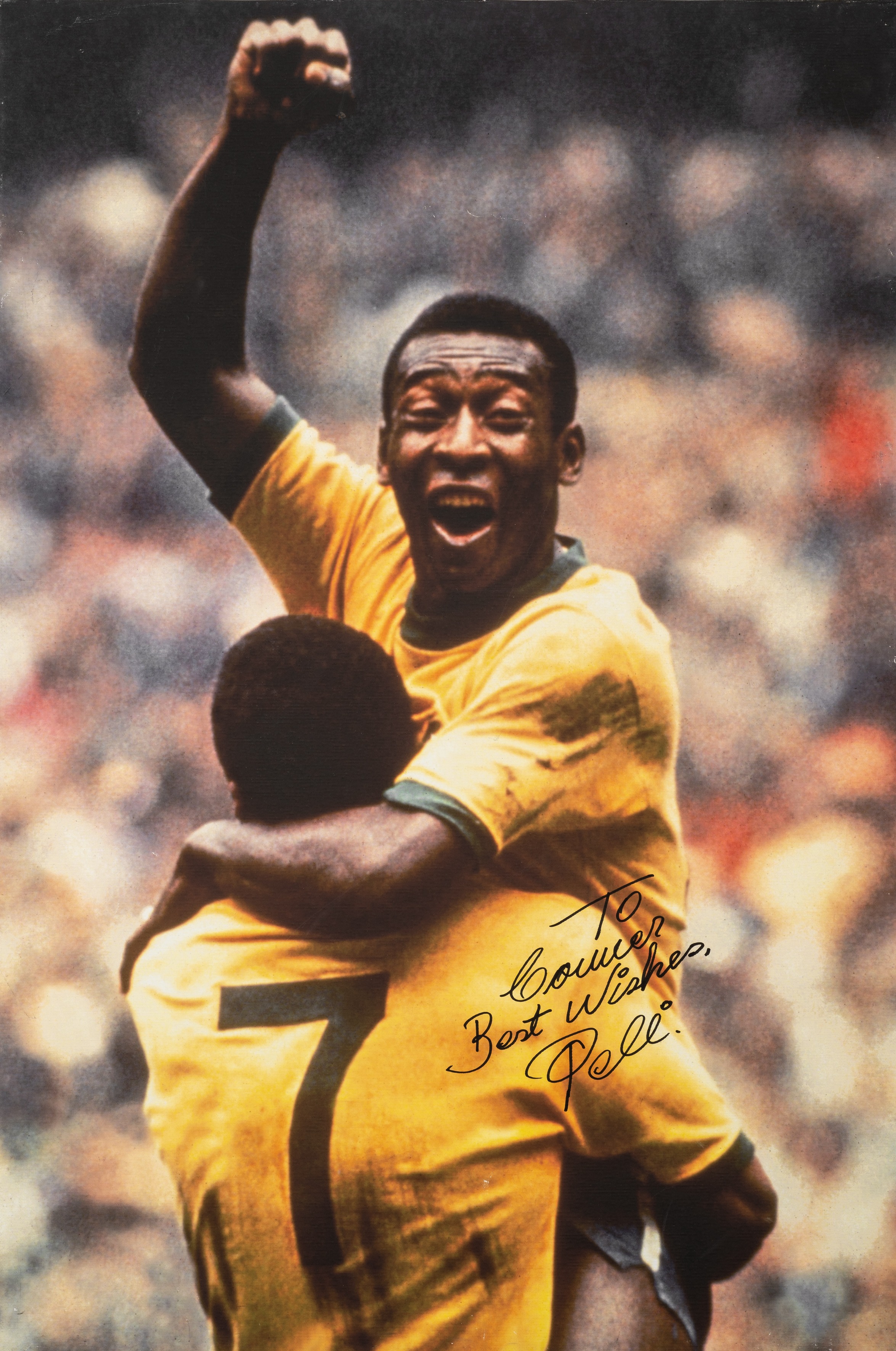 Large Canvas print depicting the famous Pele celebration of Brazil's 100th Competition goal from the 1970 World Cup, the picture was signed by Pele to an admirer when he visited Sheffield in 2007.