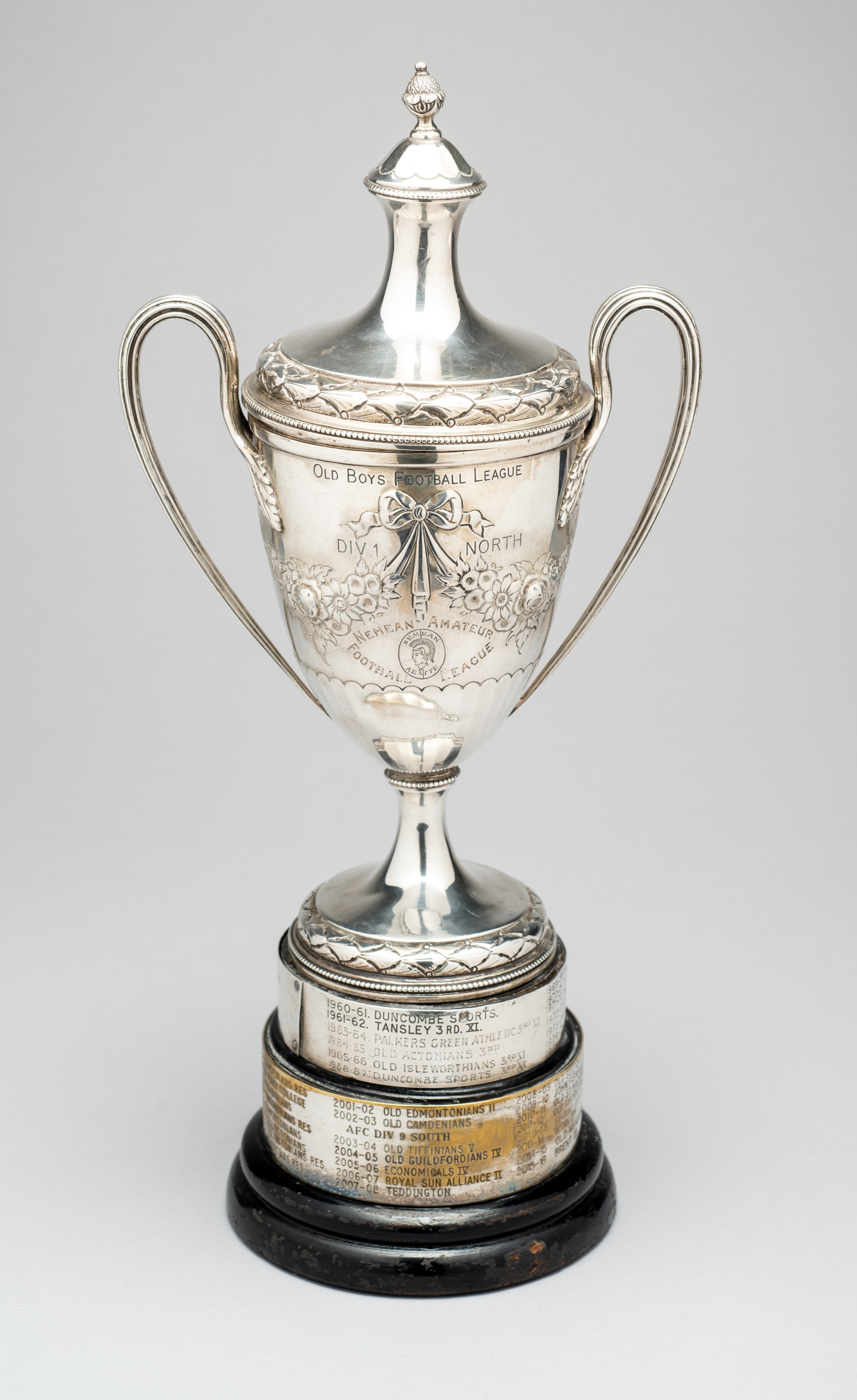 The trophy for the Old Boys Football League Division I (North) Minor Division 1 as presented by the Nemean Amateur Football League, in the form of a hallmarked silver twin-handled cup & cover, with embossed foliate decoration on stepped base, raised upon black wooden socle base, silver-plated bands engraved with names of winning teams between seasons 1960-61 and 2015-16, London, 1907, by S W Smith & Co., height 38cm., total weight with base 1418gms., bears wear