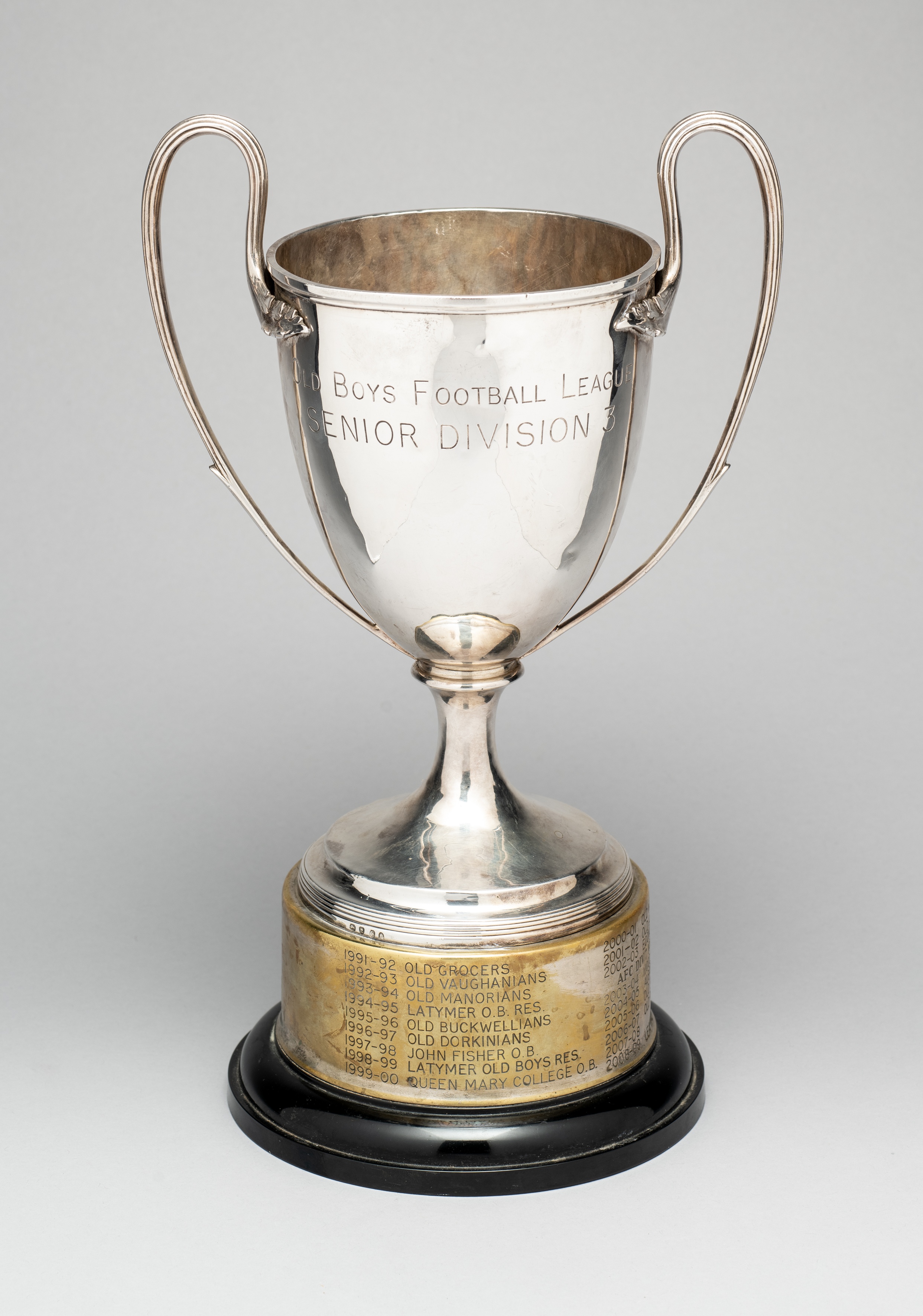 Trophy for the Old Boys Football League Senior Division III competed for between seasons 1991-92 and 2017-18, twinin the form of a twin-handled hallmarked silver cup, with stepped base, raised upon black base, bears engraved winning team names dating from seasons 1991-92 to 2017-18 on silver-plated band on base, London, 1798, by I.F., height 34cm., total weight with base 1309gms. Bears wear and some dents, makers mark rubbed, silver-plated band on base bleeding/rubbed