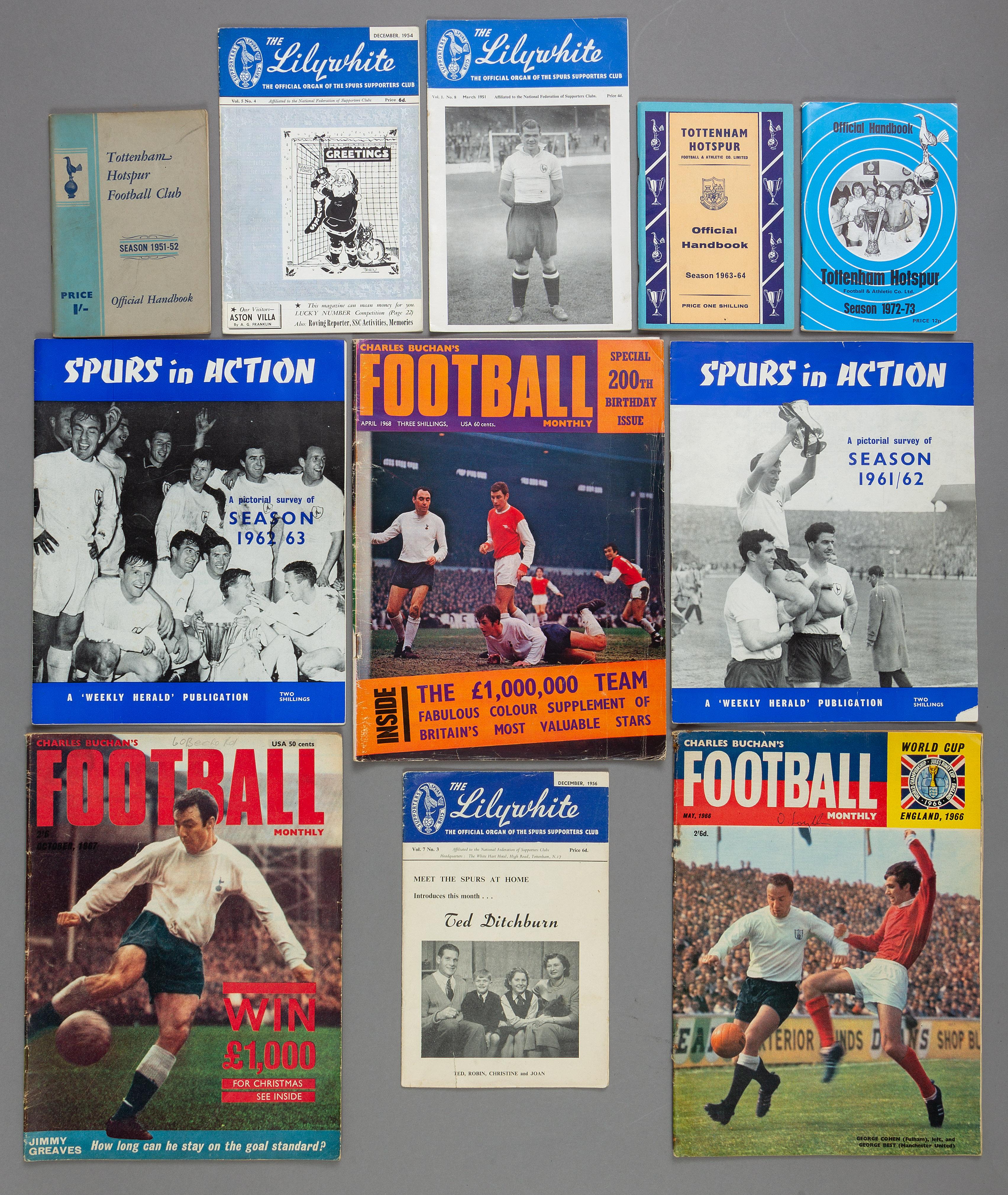 Tottenham Hotspur autograph and publication collection, featuring Harry Clarke, Danny Blanchflower, Ron Burgess and many other club legends, comprising of signed b&w press photographs, signed school boy newspaper player profiles and teams, signed autograph book pages, also a 2018-19 team-signed club pennant with COA and signature map, lot content including duplicate examples for some player signatures, some bearing wear; club supporters club publications, club souvenir publications and general publications featuring Tottenham Hotspurs including Charles Buchan's Football Monthly magazines, The Sporting Mirror magazine and Sport Express magazines, each bearing wear and tear, (qty)