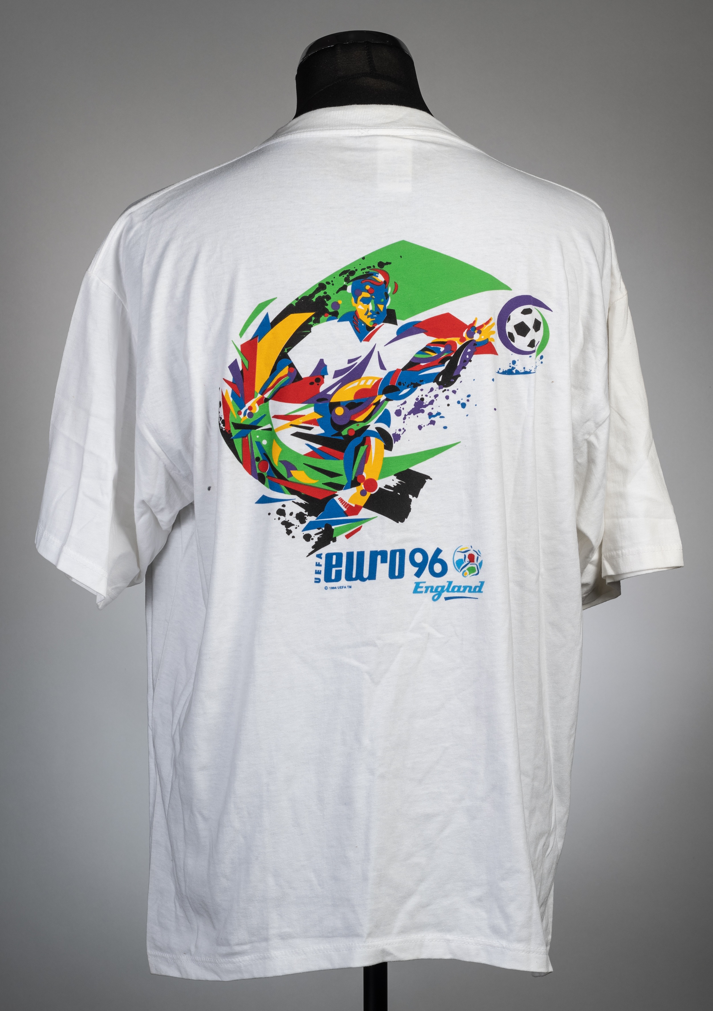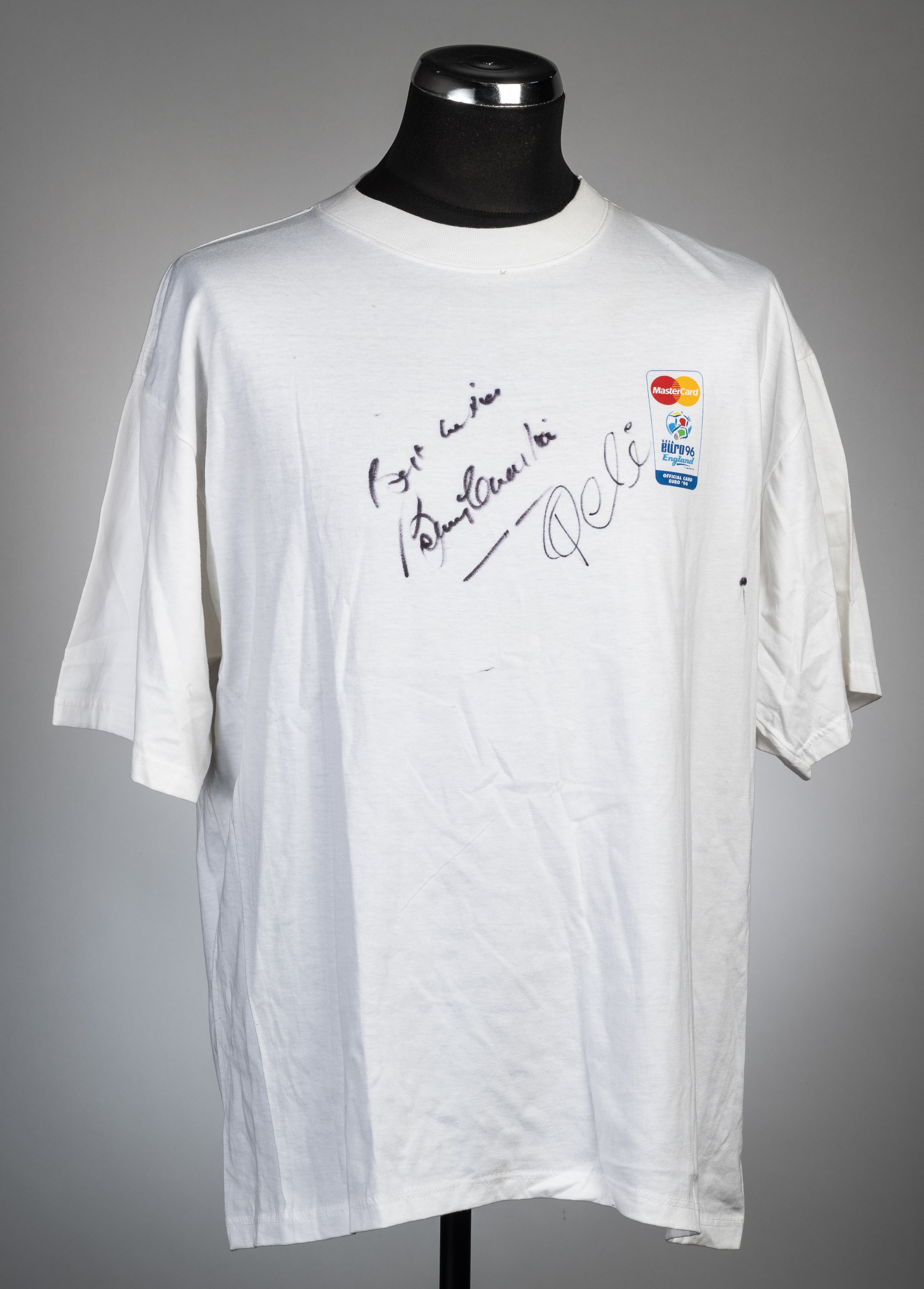 A official souvenir Euro 96 white t-shirt signed by the footballing legends Bobby Charlton and Pele, signatures in black marker pen, the Charlton aut