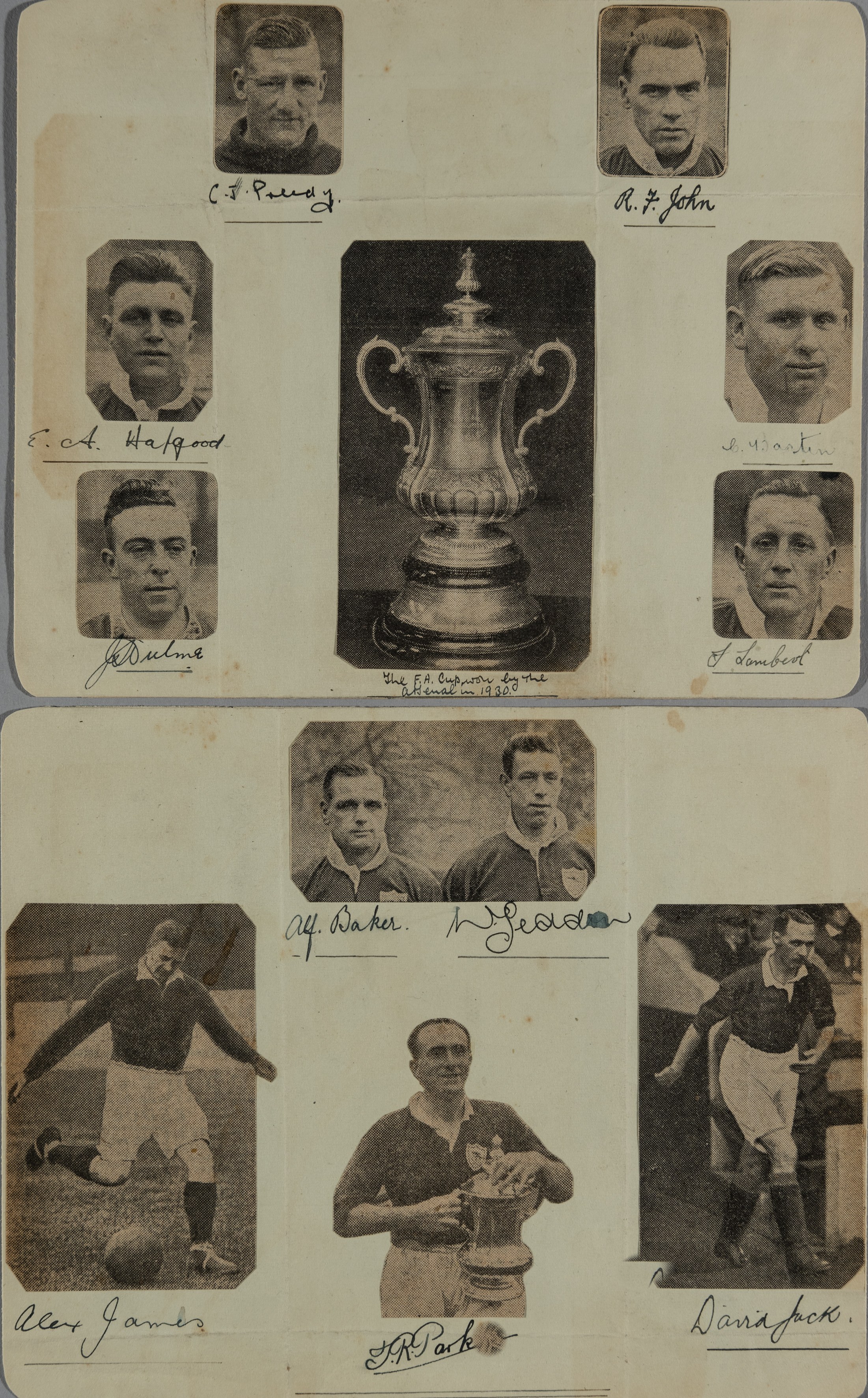 Two pages of Arsenal player autographs, 1930s, eleven in total with press cutting photographs of the relevant players, all stuck down (2)