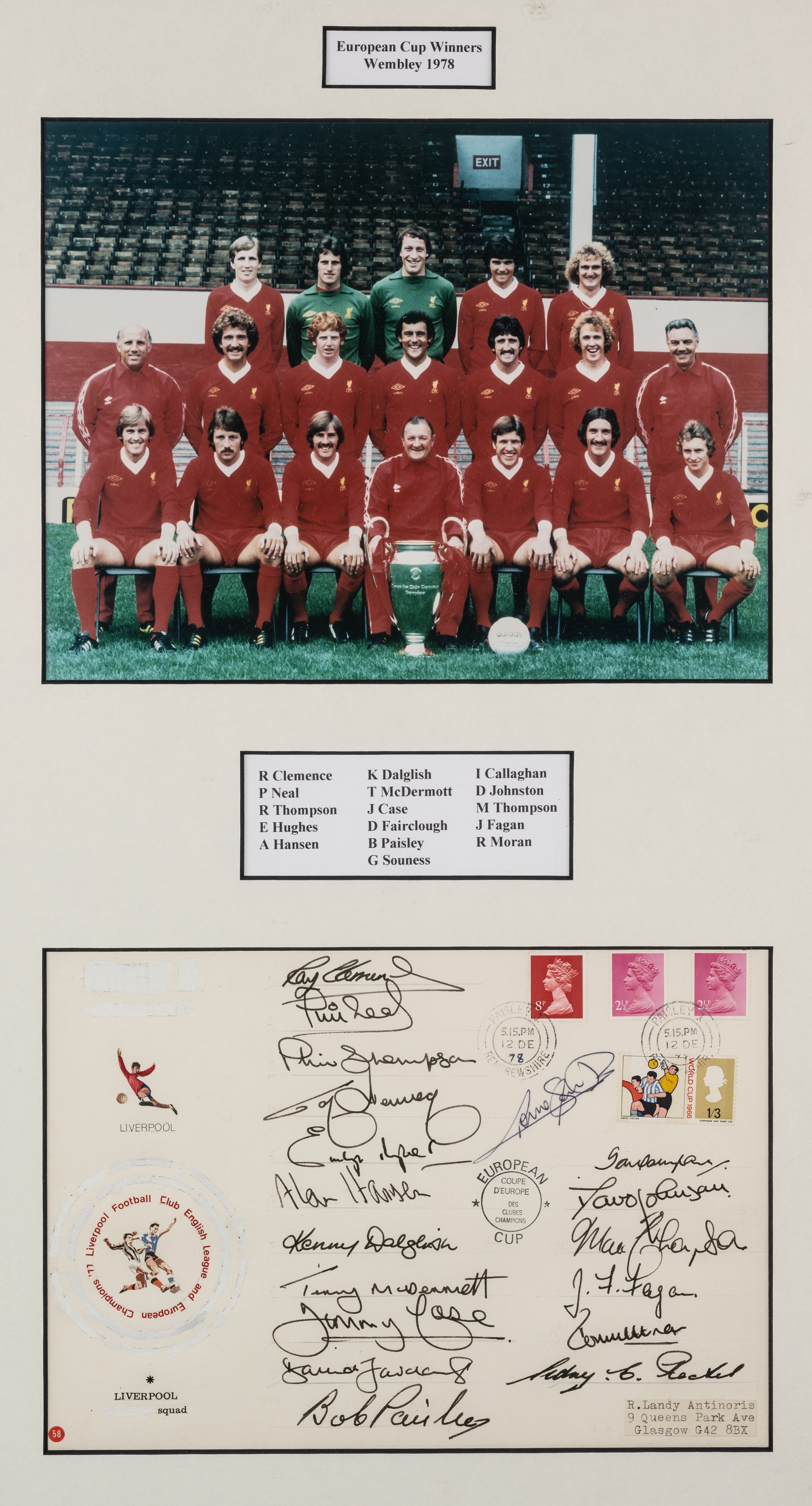 Liverpool European Cup Final Wembley 1978 photograph and signed FDC display, featuring a colour team photograph with trophy cup, 19 by 24.5cm., above a legend and a Liverpool FDC, signed in fine black marker pen by 18 squad members and management including Bob Paisley (manager), bearing postal stamps and stamped, bearing applied label with R. Landy Antinoris of Glasgow, mounted, glazed and framed, overall 57.5 by 37cm. The FDC bears tipexed areas on the left hand side.