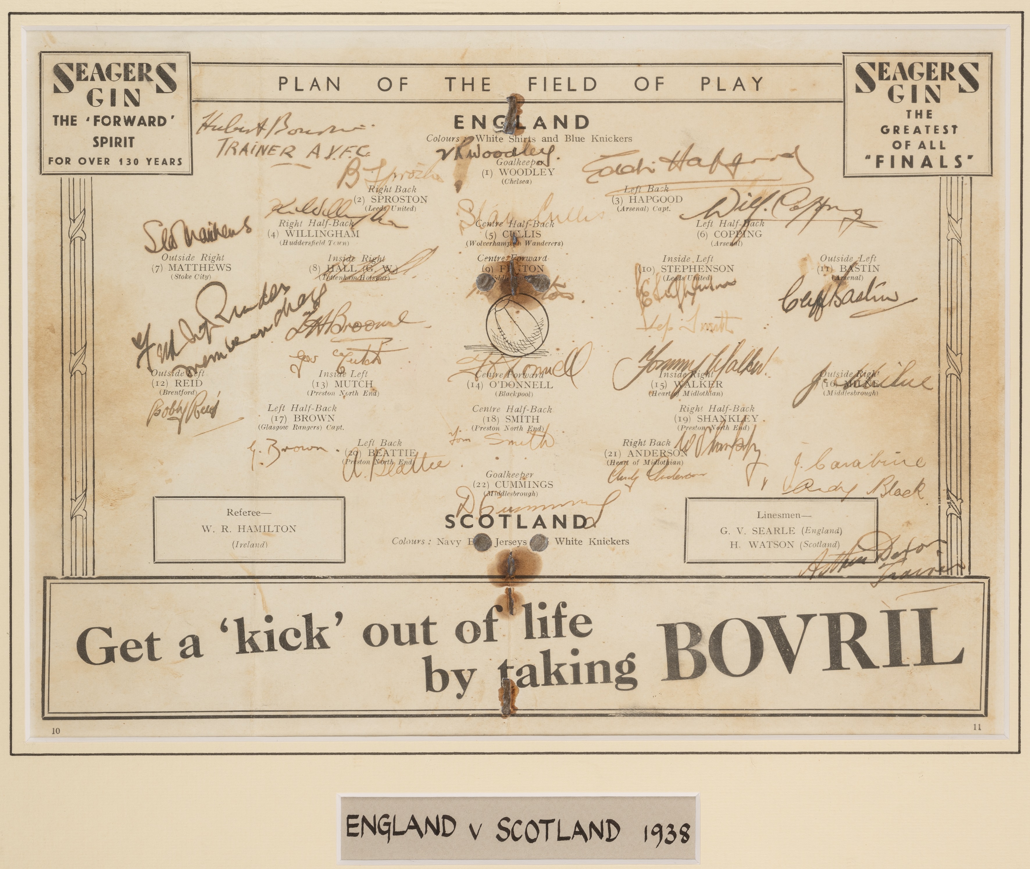 Fully signed England v Scotland football plan of the field of play, played at Wembley Stadium, on 9th April 1938, the centre programme page with team line-ups signed in black ink by both teams, mounted with legend, glazed and framed, 40.5 by 48cm. Condition fair, with staining and marks, staple holes visible with rust marks on page All glass will be removed from framed and glazed items prior to posting and may result in delays to shipping your items. (This service is included in the cost of postage and packing). We can also totally remove all framing and mounts upon request to reduce shipping costs. Alternatively, lots can be collected in person by prior appointment from NN8 1RT.