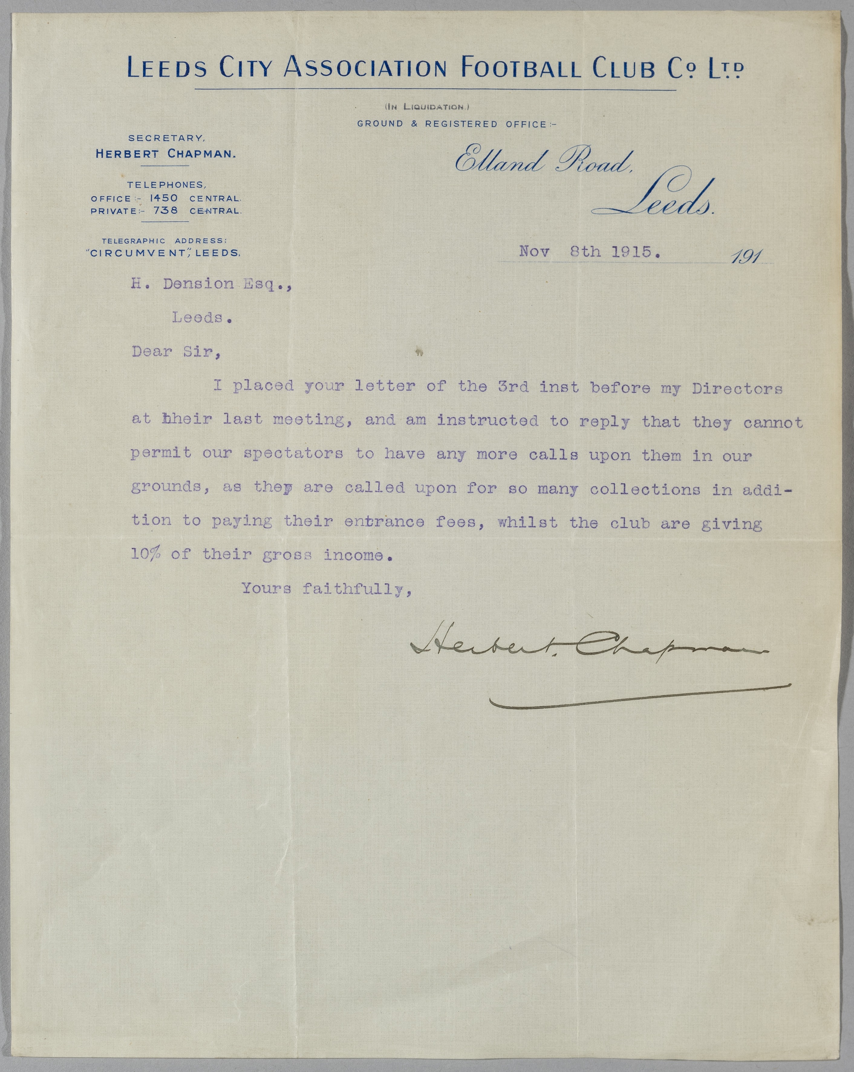 Arsenal's & Leeds City's Herbert Chapman signed letter, dated 1915 on official letterhead, signed by Secretary Herbert Chapman on notepaper dated November 18th 1915, who was in charge of the Club. Leeds City were found guilty of financial irregularities and were expelled from the Football League in 1919/20 after completing their fixtures. Leeds United were formed and joined the Football League in 1920. The letter has minor folds and has a clear signature of Chapman who went on to have considerable success as Manager of Huddersfield Town and Arsenal.