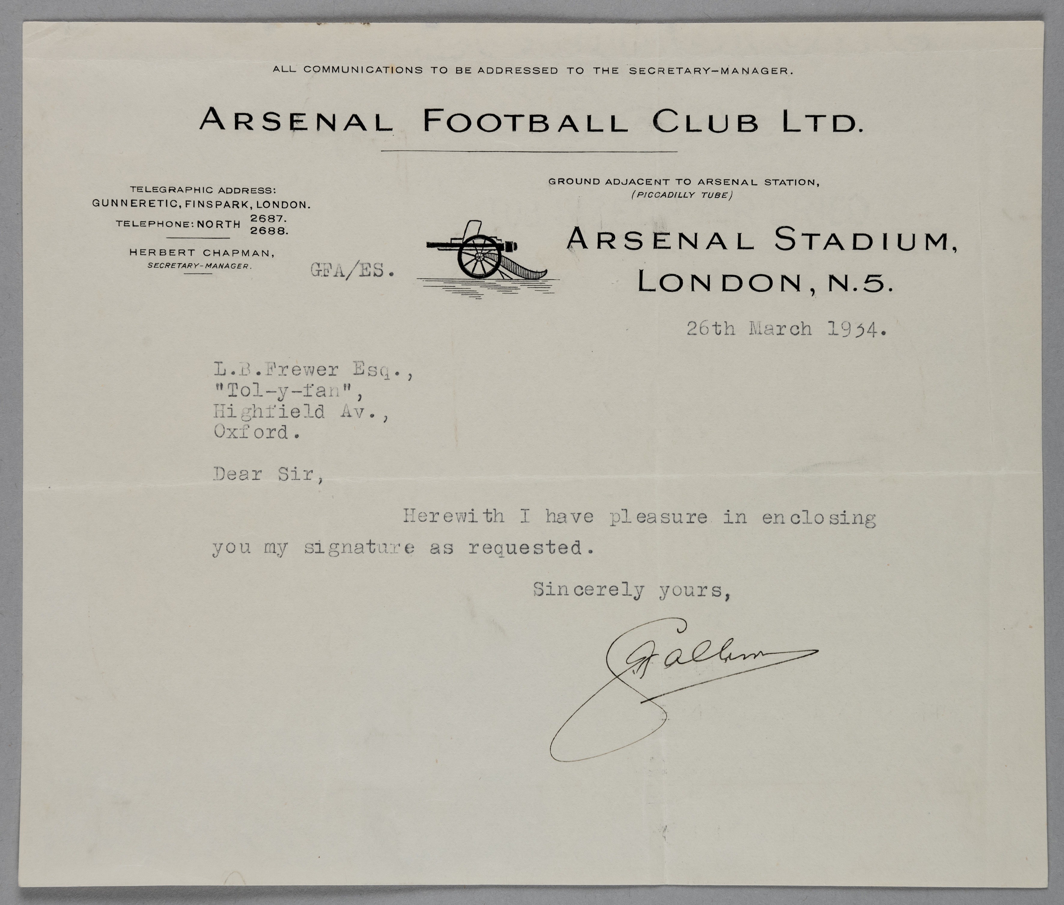 George Allison - Arsenal F.C manager 1934, signed one-page letter on embossed Arsenal F.C letterhead, a rare and very early post Chapman era, original one-page autograph letter on Arsenal F.C embossed crest official club letterhead dated 26th March, 1934, very nicely signed in black ink by George Allison, in very good condition George Allison had just been announced as Arsenal manager as of the following season, but was otherwise in full control at the club following Herbert Chapman’s untimely passing on the 6th of January 1934. Joe Shaw was appointed caretaker manager until August 1934, however Herbert Chapman’s name is still printed on the letterhead under the title ‘Manager’. George Frederick Allison (24th of October 1883 – 13th of March 1957) was an English football journalist, broadcaster and manager. He was the BBC’s first sports commentator and Arsenal’s second longest serving manager. After his move to London in 1906, Allison soon became associated with Woolwich Arsenal. He became the club's programme editor and continued his association with the team after they moved to Highbury and renamed themselves "Arsenal". He became a member of the club's board of directors soon after the end of the First World War; he was at first club secretary and then managing director. Following the sudden death of legendary Arsenal boss Herbert Chapman earlier in January 1934, Allison was appointed Chapman's full-time successor in the summer of that year. Under Chapman and caretaker manager Joe Shaw, Arsenal had already won the League Championship twice in a row, in 1932-33 and 1933-34, and Allison made it a hat-trick, winning a third successive title in 1934-35. He also won the FA Cup in 1935-36 and the League again in 1937-38.