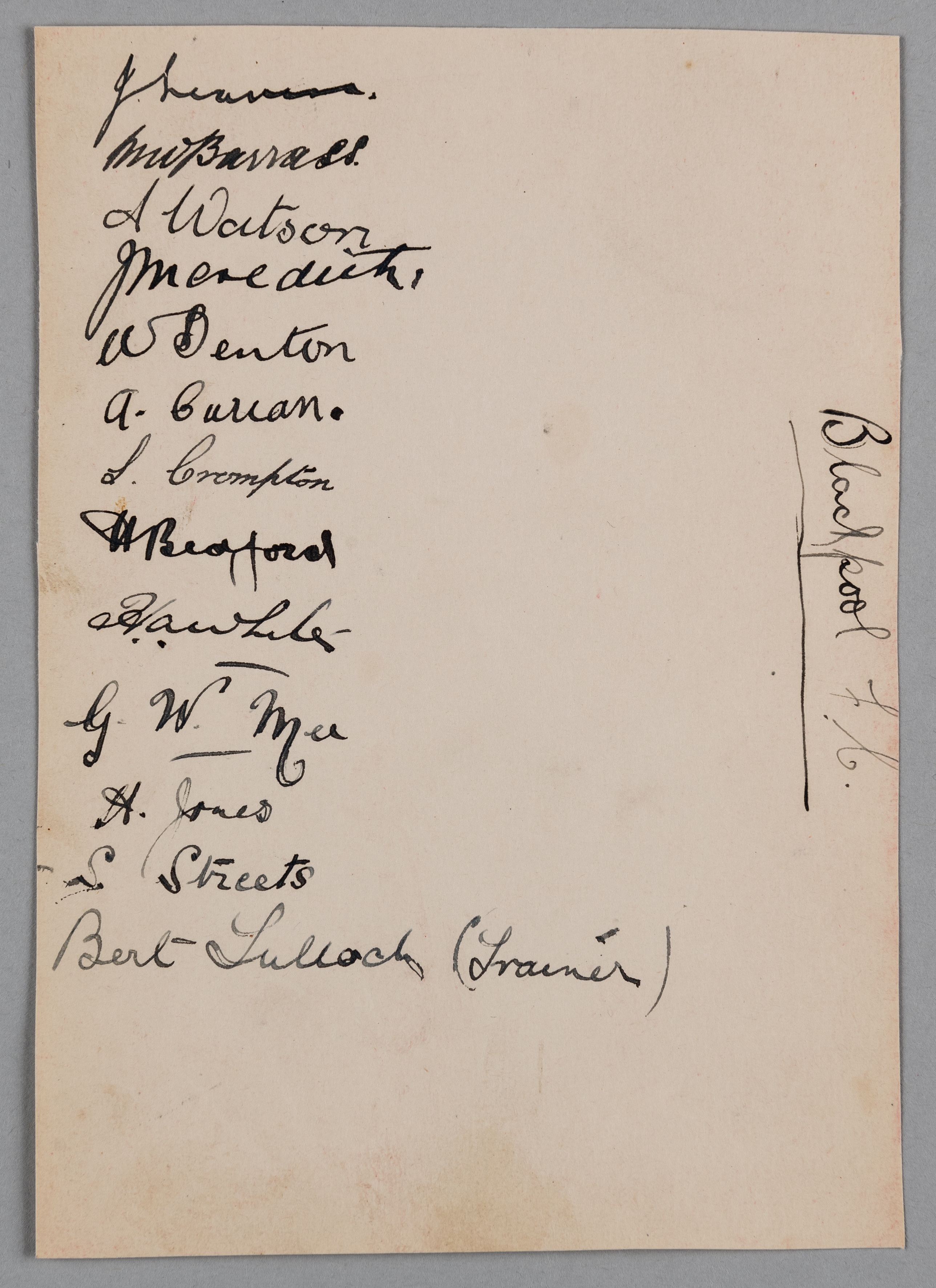 Blackpool FC 1923-24 Football League Division Two autograph album page, 6 1/4 by 4 1/4in., bearing the original autographs of 13 members of the Blackpool team in ink, including: Harry Bedford, Barrass, Curran, Watson, Meredith, Crompton, Mee, Jones, Streets, Bert Tulloch (trainer) et al., very good condition The 1923-24 season was Blackpool’s 23rd season (twentieth consecutive) in the Football League. They competed in the 22-team Division Two, then the second tier of English football, finishing fourth. The team first began wearing tangerine for this season, after a recommendation from referee Albert Hargreaves, who officiated a Holland v Belgium international match and was impressed by the Dutchmen's colours. Harry Bedford was the club's top scorer for the third consecutive season, with 33 goals in all competitions (32 in the league and one in the FA Cup). Bert Tulloch retired this season, after ten years of service for Blackpool, his only professional club.