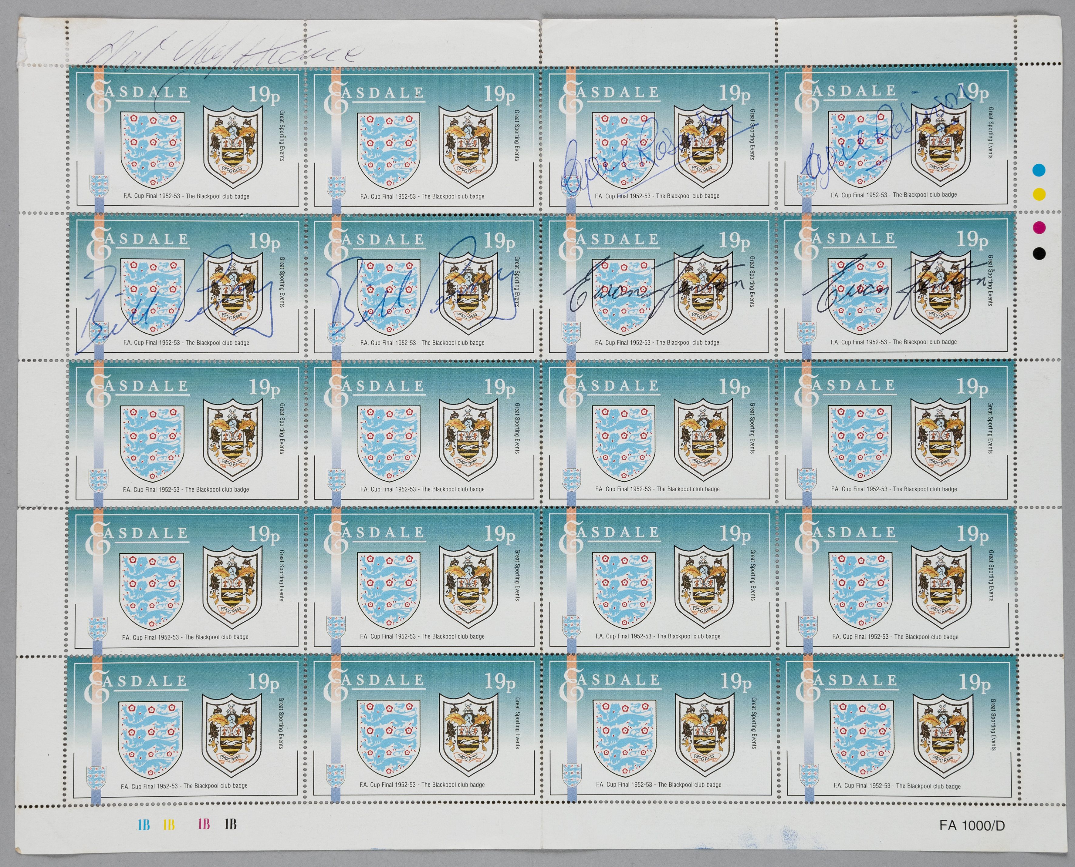 Blackpool 4 v Bolton 3, 1953 F.A Cup Final, complete block of 20 stamps with complete edging and traffic lights, commemorating Blackpool’s famous victory in the 1953 F.A Cup Final, each stamp depicting the England emblem and the Blackpool club badge, six of the stamps bear individual signatures of three of the Blackpool F.A Cup winners including: Ewan Fenton (2), Cyril Robinson (2) and Bill Perry (2), also signed to the clear border by Bolton’s opening goal-scorer Nat Lofthouse