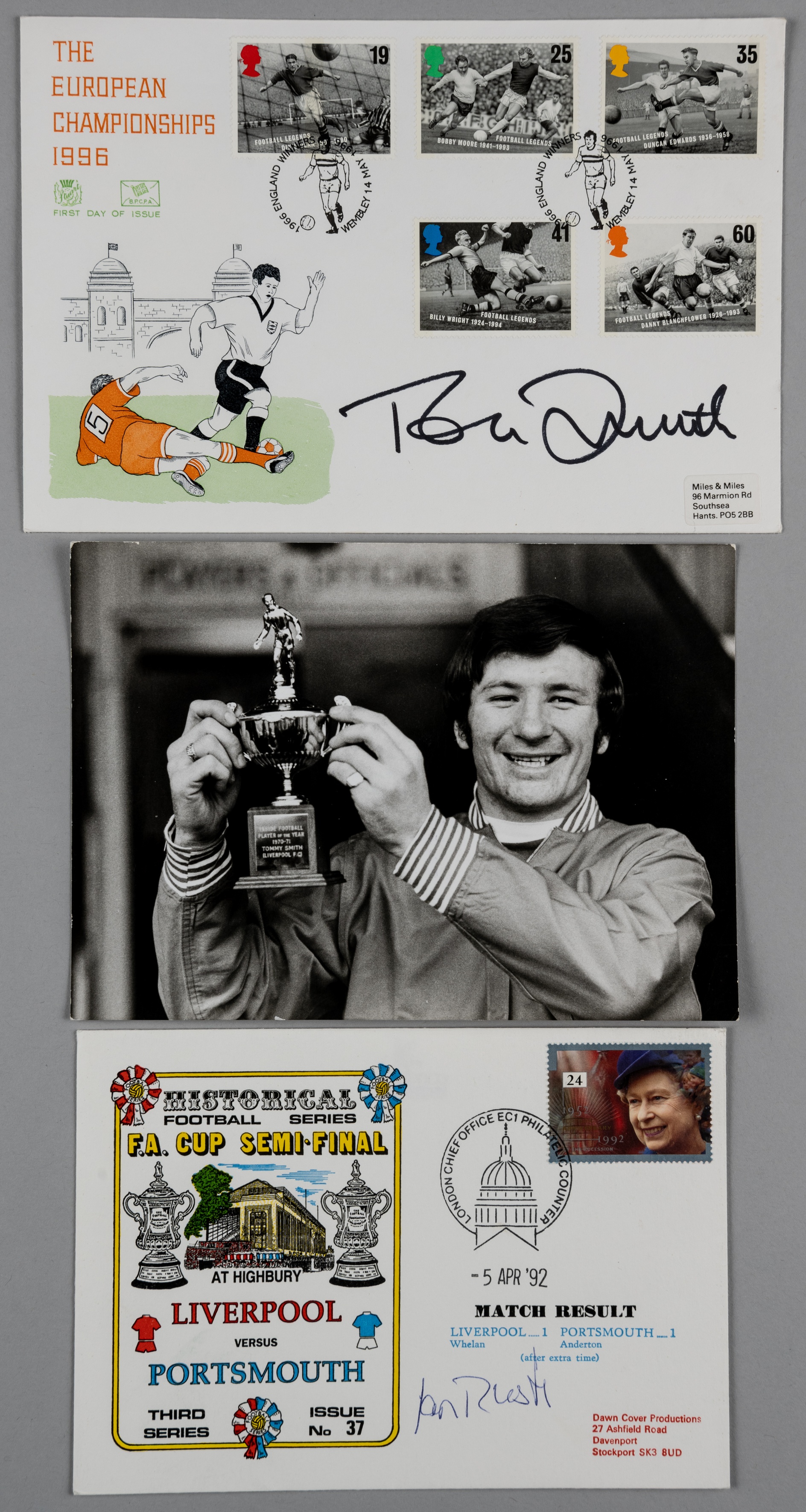 Liverpool greats Tommy Smith and Ian Rush, a pair of autographed First Day Covers, one by Tommy Smith the other by Ian Rush, sold along with an original b&w 6.5 by 4.5in. Central Press photograph, dated 7th May, 1971, depicting Tommy Smith holding his Player of the year trophy for the 1970-71 season, prior to the 1971 F.A. Cup Final between Liverpool and Arsenal at Wembley 1971, press copyright accreditation to verso along with fully printed and dated caption, all three items in very good condition Thomas Smith MBE (5th April 1945 – 12th April 2019) was an English footballer, who played as a defender at Liverpool for 16 years from 1962 to 1978. Known for his uncompromising defensive style, manager Bill Shankly once said of him: "Tommy Smith wasn't born, he was quarried". A central defender for most of his career, Smith's most memorable moment for the club probably came when he scored Liverpool's second goal in the 1977 European Cup Final. Smith played only once for England in 1971. Ian James Rush MBE (born 20th October 1961) is a Welsh former professional footballer. At club level Rush played for Liverpool from 1980–1987 and 1988–1996, he is the club's all-time leading goal-scorer, having scored a total of 346 goals in all competitions. At international level, Rush made 73 appearances for Wales, and remained the record goal-scorer for his country until 2018, with 28 goals between 1980 and 1996.