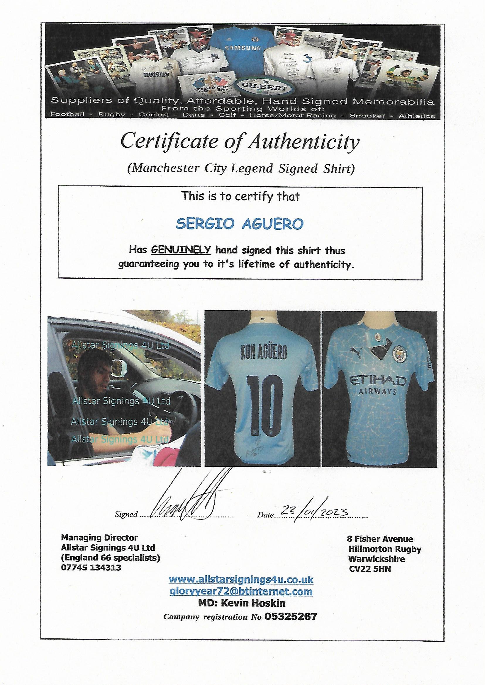 Sergio Aguero signed Manchester City 2020-21 home jersey, signed to rear below his name and number 10, shirt is size S, brand new with official club tags still attached, complete with COA and photo proof