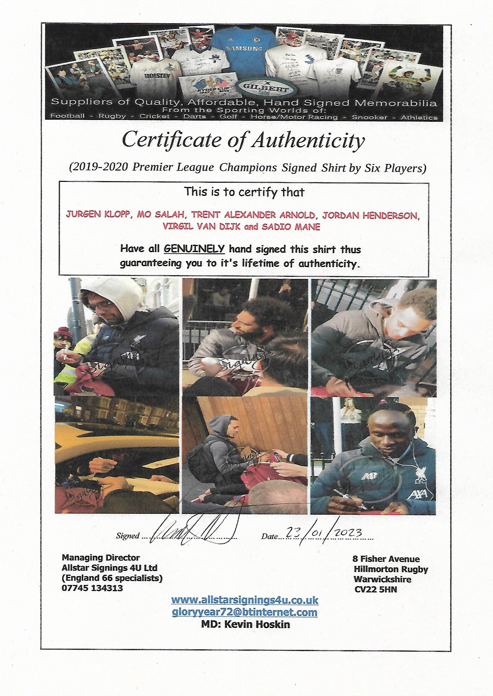 Liverpool team signed Liverpool 2018-19 Champions League winning season home jersey, brand new official Liverpool FC merchandise with tags still attached, having additional embroidery around the Liver Bird crest denoting their 6 time European Cup / Champions League Final victories, jersey bears six autographs of manager Jurgen Klopp, Virgil Van Dijk, club captain Jordan Henderson (Y.N.W.A added), Sadio Mane, Trent Alexander Arnold and goal machine Mo Salah comes with COA and photo proof