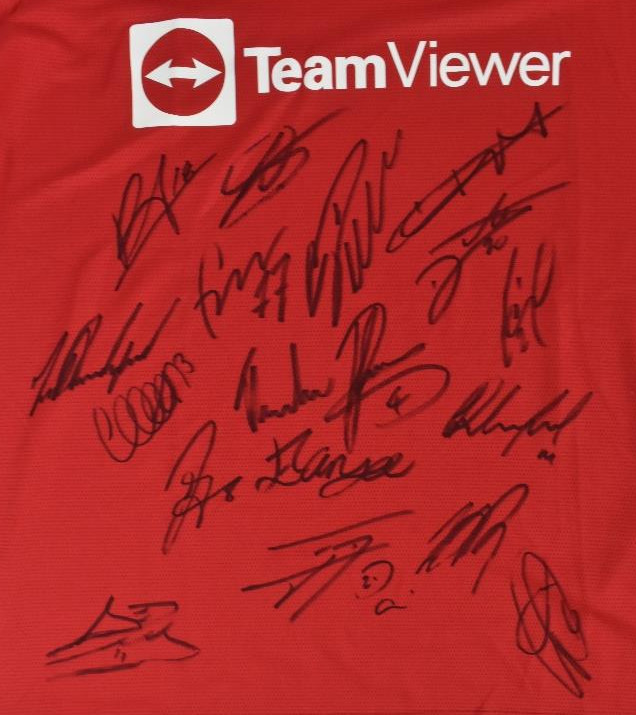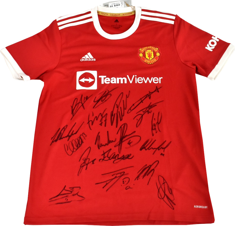 Manchester United 2021-22 season signed jersey, brand new with adidas tags still attached signed by 18 of the squad, Bruno Fernandez, Telles, Cristi