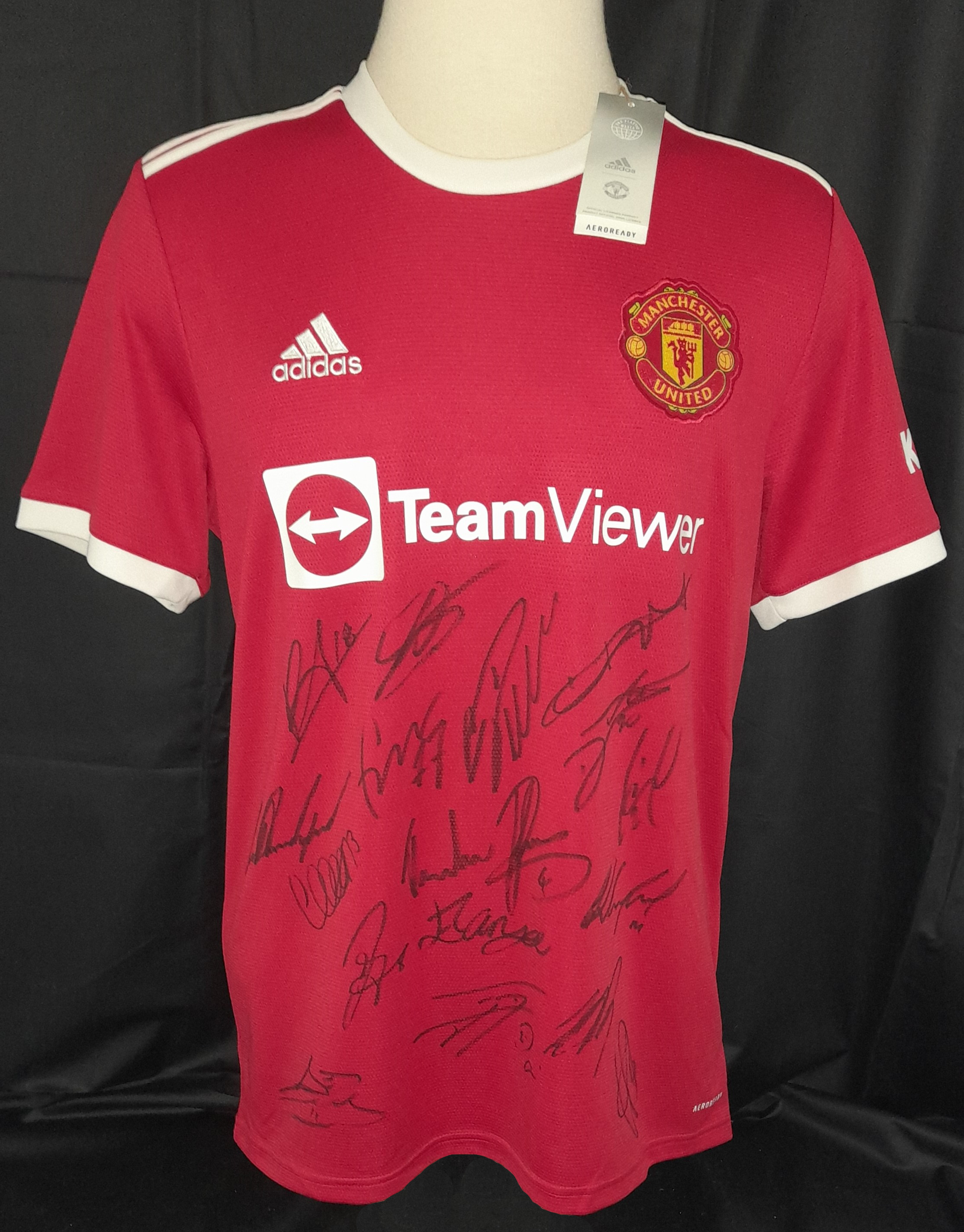 Manchester United 2021-22 season signed jersey, brand new with adidas tags still attached signed by 18 of the squad, Bruno Fernandez, Telles, Cristiano Ronaldo, Maguire, Fred, Rashford, Dalot, Lindloff, Jones, Grant, Heaton, Elanga, Lingard, Mata, Varane, Cavani, Pogba and David De Gea, signed Outside Old Trafford post home games, Manchester United Training Complex post training sessions, the Lowry Hotel Manchester pre home games and the Hyatt Hotel Manchester pre home games