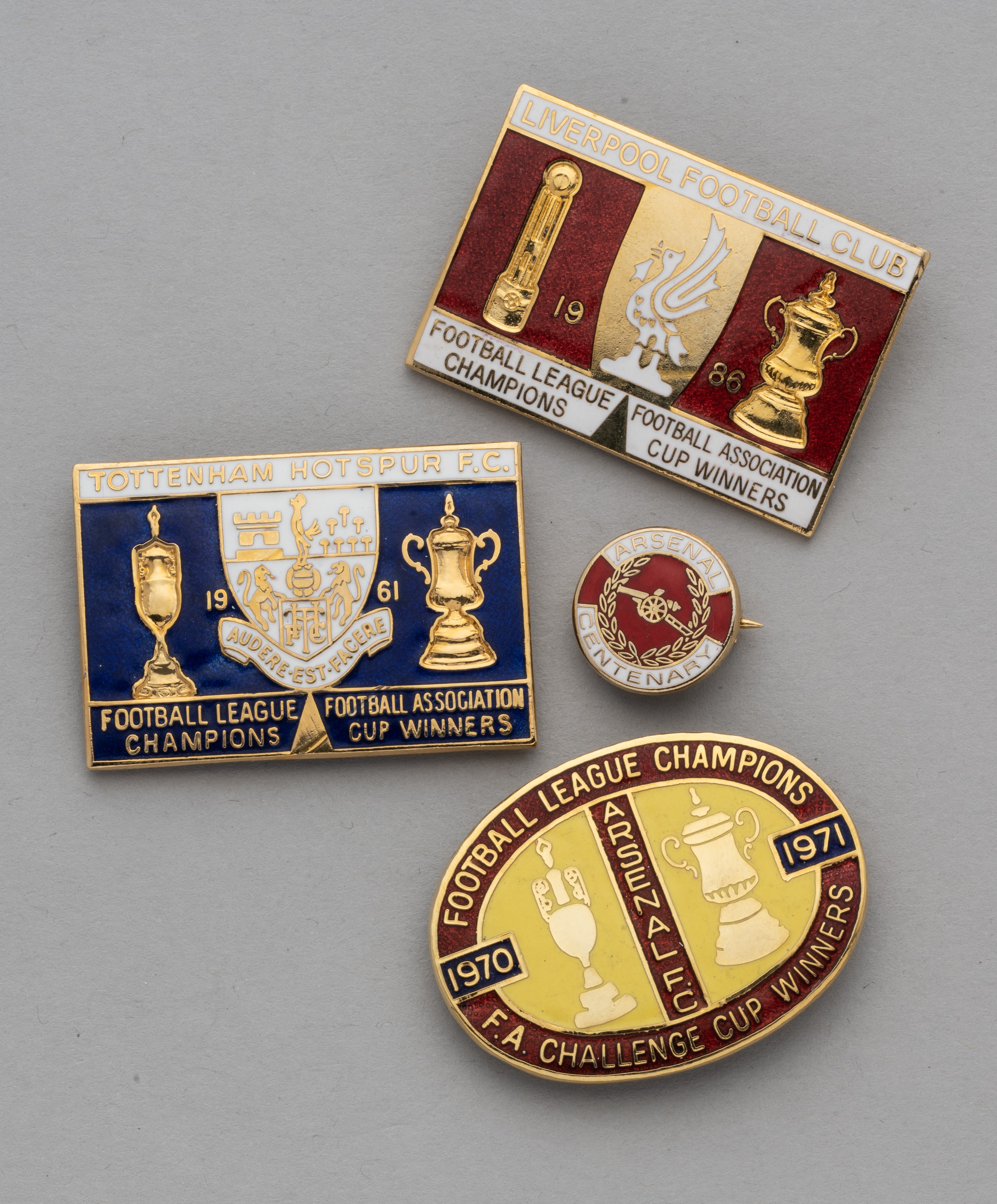 Three "Double" winning enamel lapel badges, comprising Tottenham Hotspur, 1960-61, Arsenal 1970-71 and Liverpool, 1986 and an Arsenal Centenary lapel badge (4)