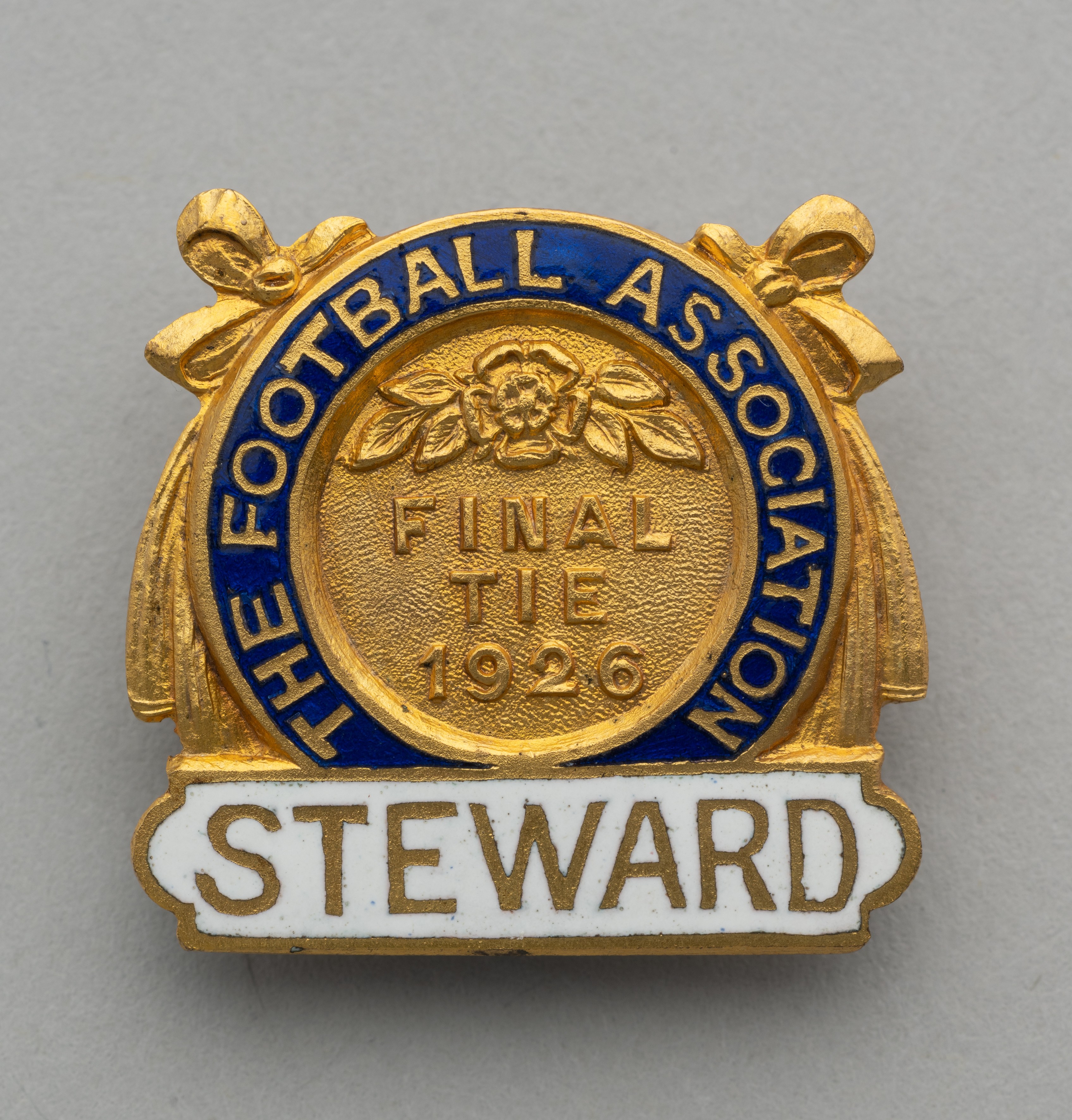 A gilt-metal and enamel 1926 F.A. Cup Steward's badge, the obverse inscribed THE FOOTBALL ASSOCIATION, FINAL TIE 1926 STEWARD with brooch fitting