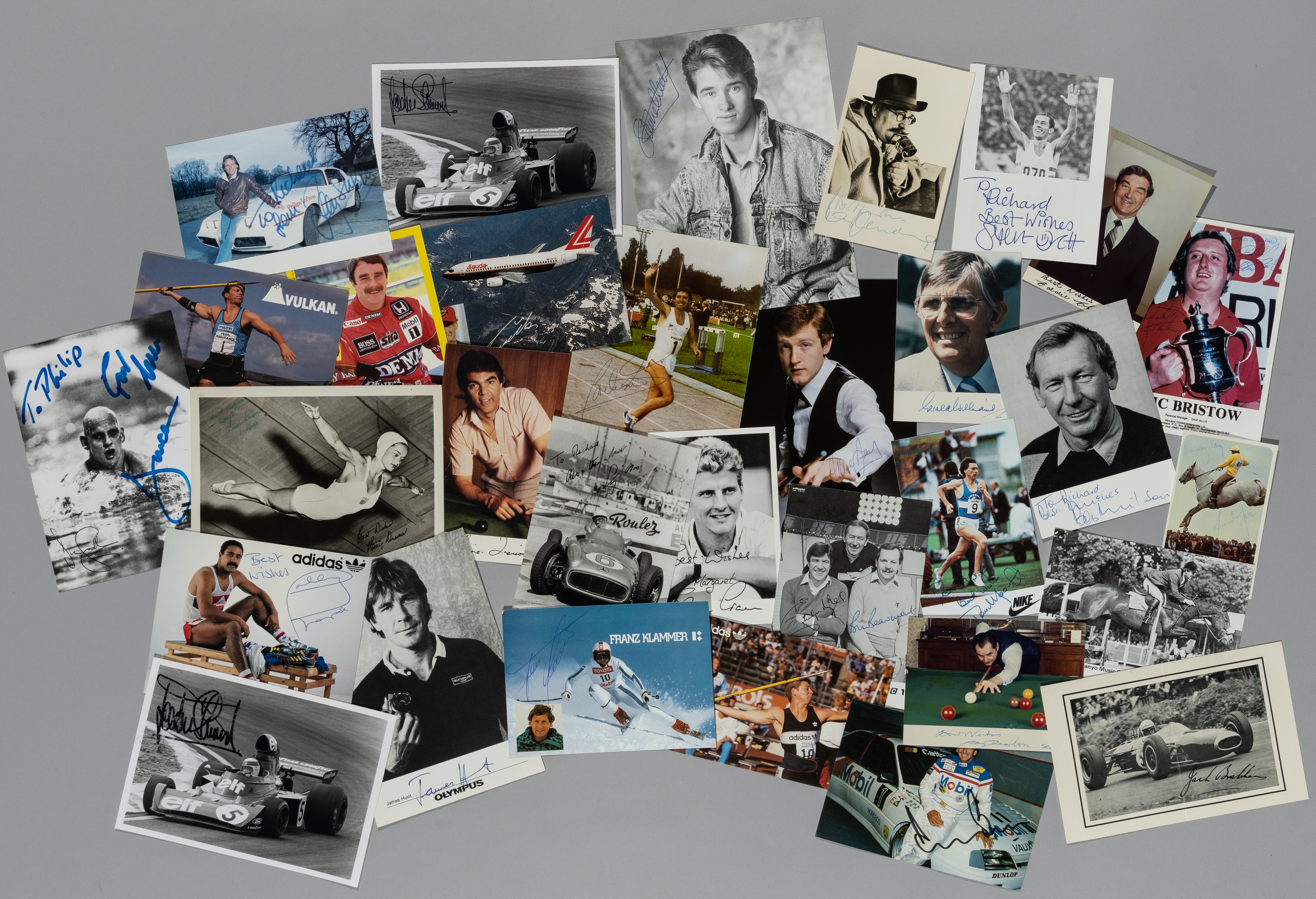 Twenty-nine autographed sporting cards, including Jackie Stewart, James Hunt, Sterling Moss, Nigel Mansell, Daley Thomson, Brendan Foster, David Col